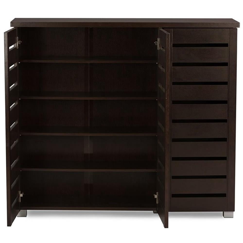 Finish: Dark brown finish 3-door version comes with 5 larger shelves on the right and 5 smaller shelves on the right 3-door version fits up to 20 pairs Slatted doors for ventilation Suitable for hallway