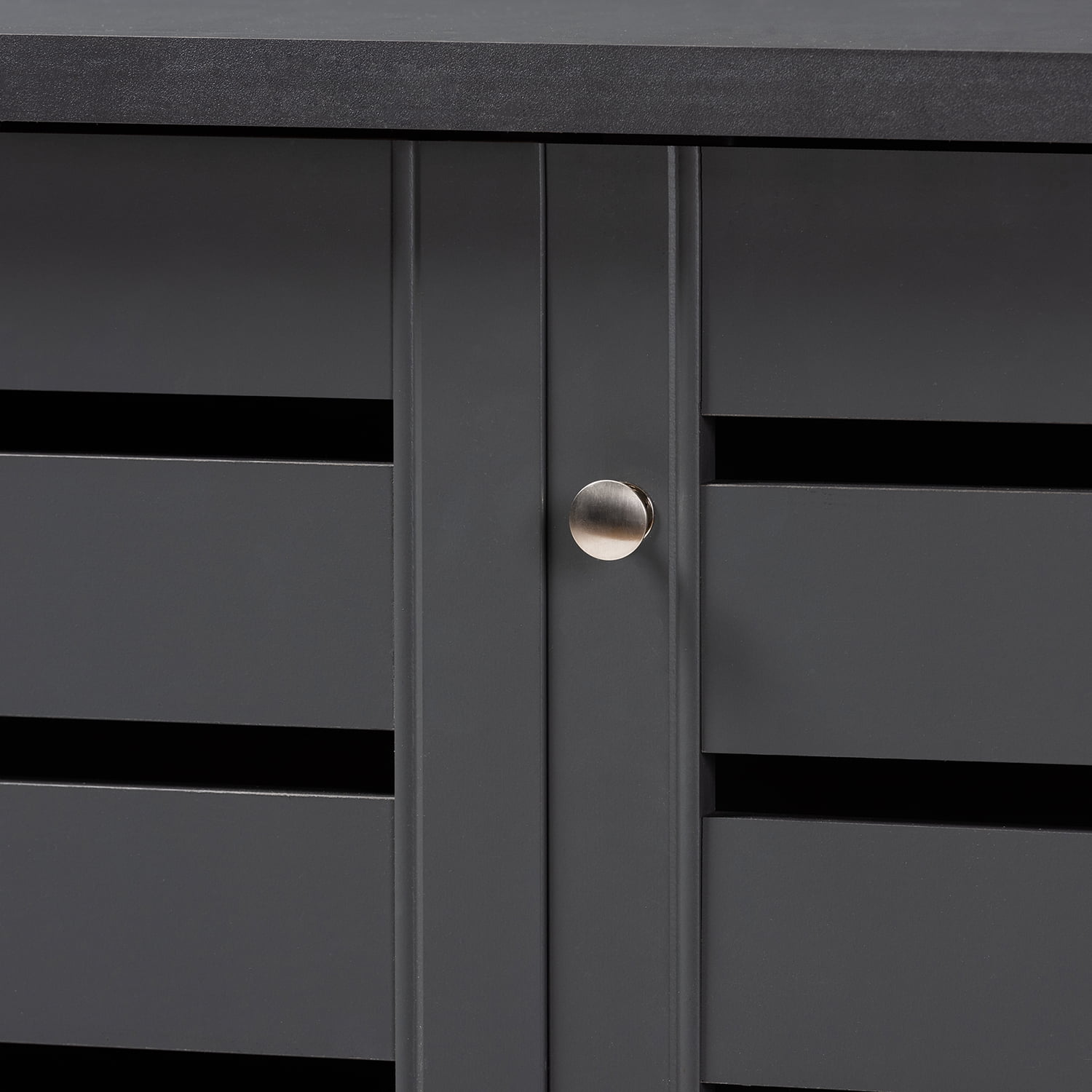 Constructed from engineered wood in a dark grey finish; Eight (8) shelves provide storage for 20 pairs of shoes; Slatted doors provide ventilation to deter mold growth; Magnetic door closures