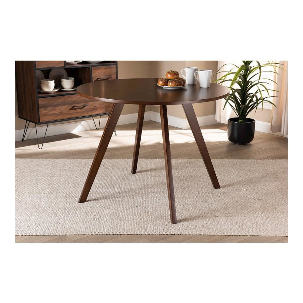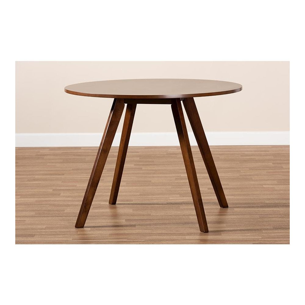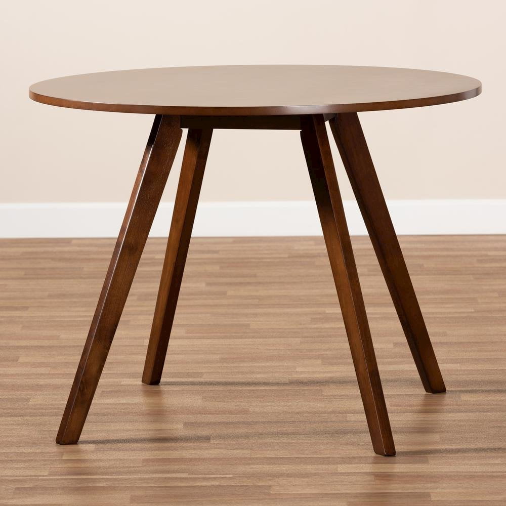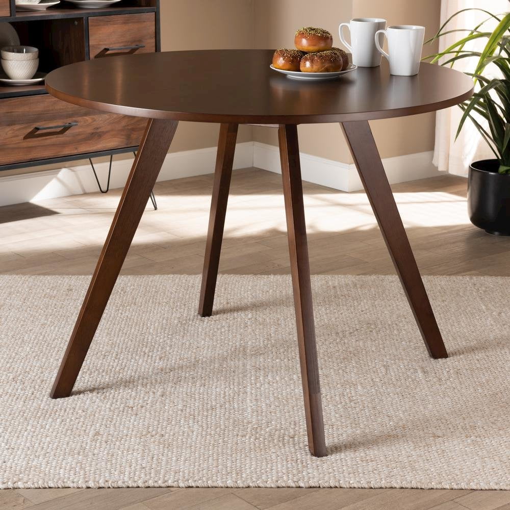 Baxton Studio Alana 39.40″ Round Splayed Legs Dining Table with Assembly Required, Walnut Brown Mid-century modern design that seats up to four Constructed from durable rubberwood Elegant walnut brown finish Round tabletop for ample elbow room Splayed legs for added retro appeal Assembly required Made in Malaysia
