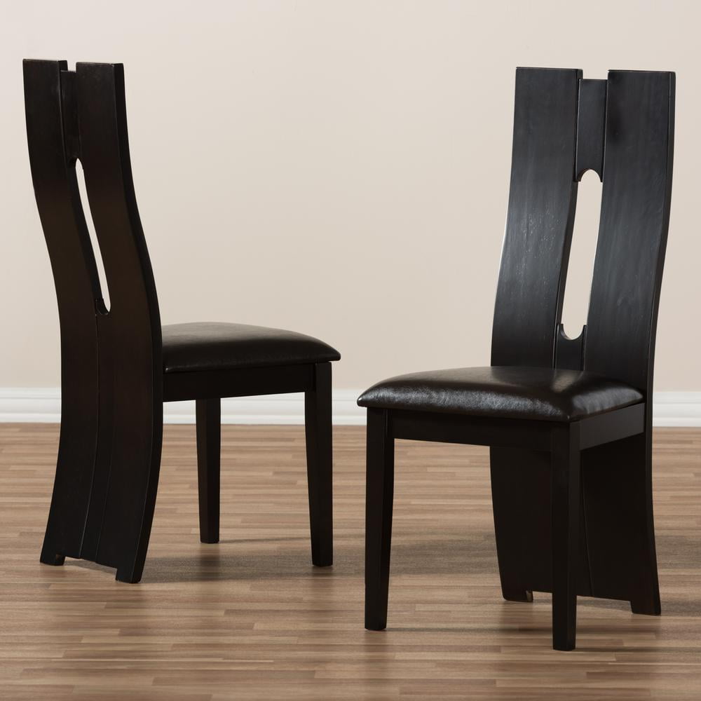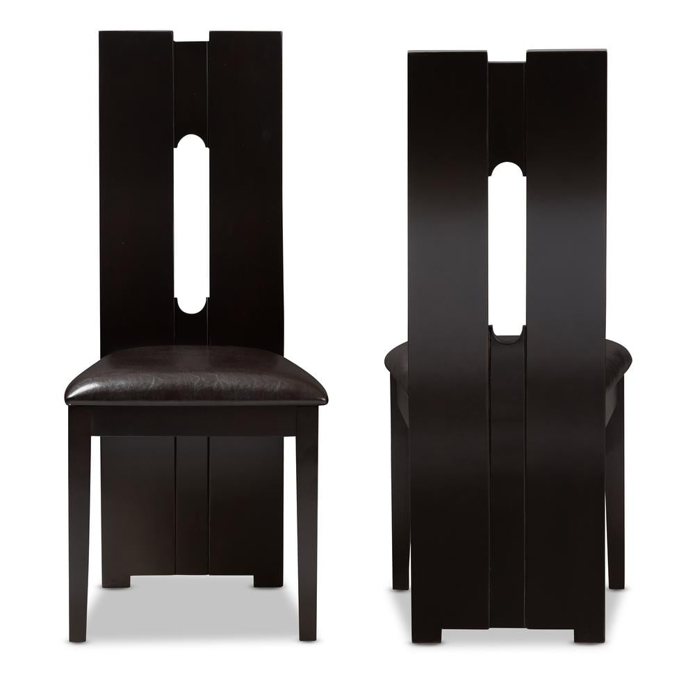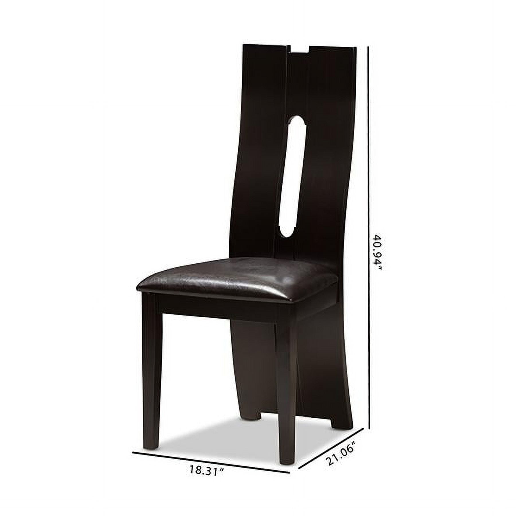 With details not to be missed, the Alani modern and contemporary dark brown faux leather upholstered dining chair excites and delights for a truly enjoyable dining experience. This dining chair features an impressive extra-tall backrest with padded faux leather seats in dark brown. The chair features eye-catching cut-out shape on its bent backrest as an added contemporary style. Sturdily made with solid wood, the chairs are finished with dark brown wenge wood veneer. Features: Finish: Dark Brown Seating Dimensions: 18.5″ H (from Floor) x 18.11″ W x 15.75″ D Material: Faux Leather, Solid Rubberwood, Foam Back Height: 40.94″ Style: Contemporary Cut-out back design Padded seat Assembly required Care Instruction: Wipe with a damp cloth Warranty: 30 Days limited Specifications: Product Dimensions: 40.94″ H x 18.31″ W x 21.06″ D Product Weight: 43 lbs Leg Dimensions: 16.54″