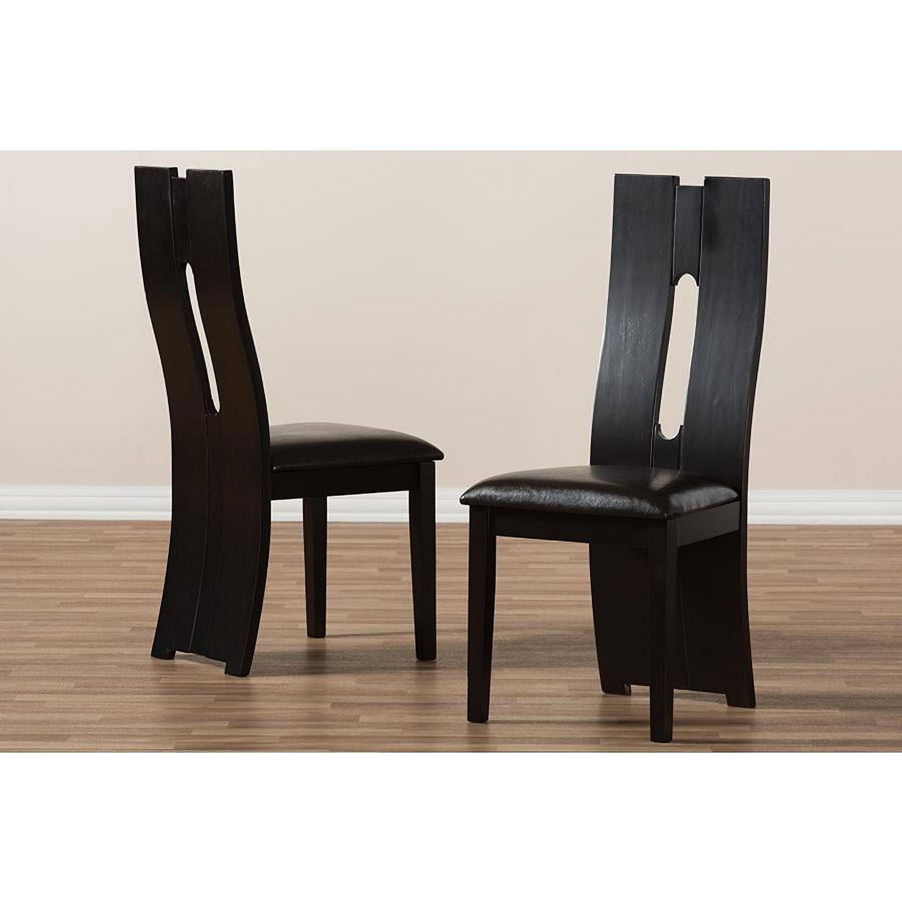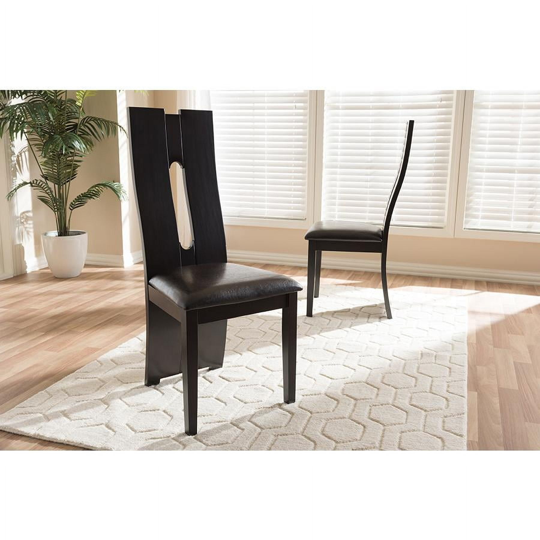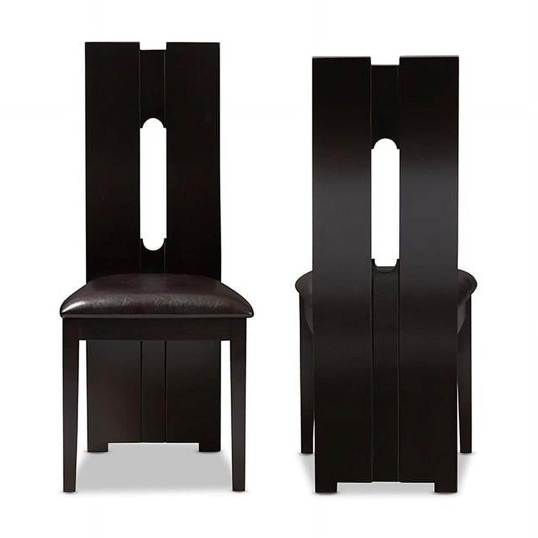 With details not to be missed, the Alani modern and contemporary dark brown faux leather upholstered dining chair excites and delights for a truly enjoyable dining experience. This dining chair features an impressive extra-tall backrest with padded faux leather seats in dark brown. The chair features eye-catching cut-out shape on its bent backrest as an added contemporary style. Sturdily made with solid wood, the chairs are finished with dark brown wenge wood veneer. Features: Finish: Dark Brown Seating Dimensions: 18.5″ H (from Floor) x 18.11″ W x 15.75″ D Material: Faux Leather, Solid Rubberwood, Foam Back Height: 40.94″ Style: Contemporary Cut-out back design Padded seat Assembly required Care Instruction: Wipe with a damp cloth Warranty: 30 Days limited Specifications: Product Dimensions: 40.94″ H x 18.31″ W x 21.06″ D Product Weight: 43 lbs Leg Dimensions: 16.54″