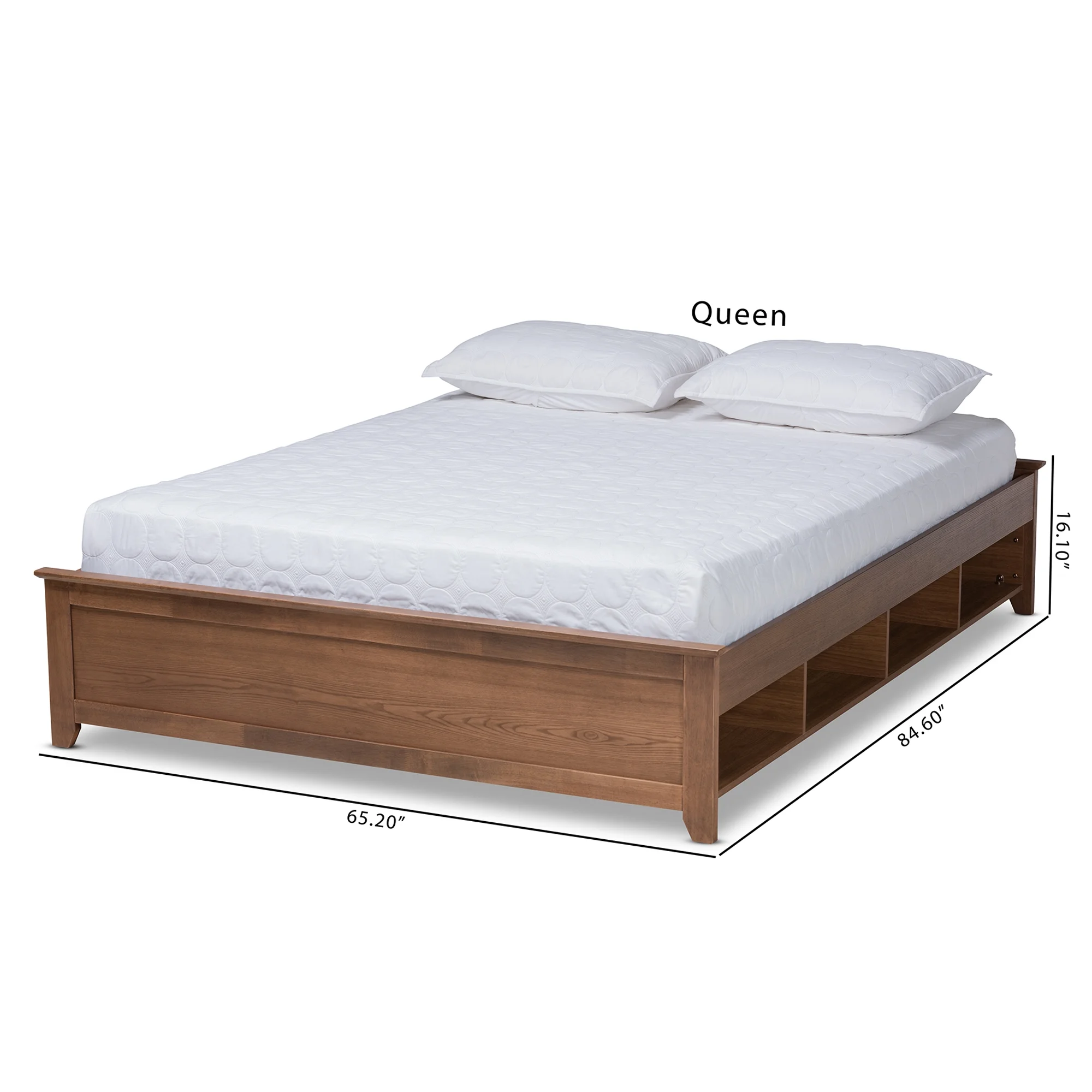 • Constructed from rubberwood and MDF wood • Ash walnut brown finish • Eight (8) underside storage shelves • Paneled wood craftsmanship • Slats eliminate the need for a box spring • Assembly required • Made in Malaysia