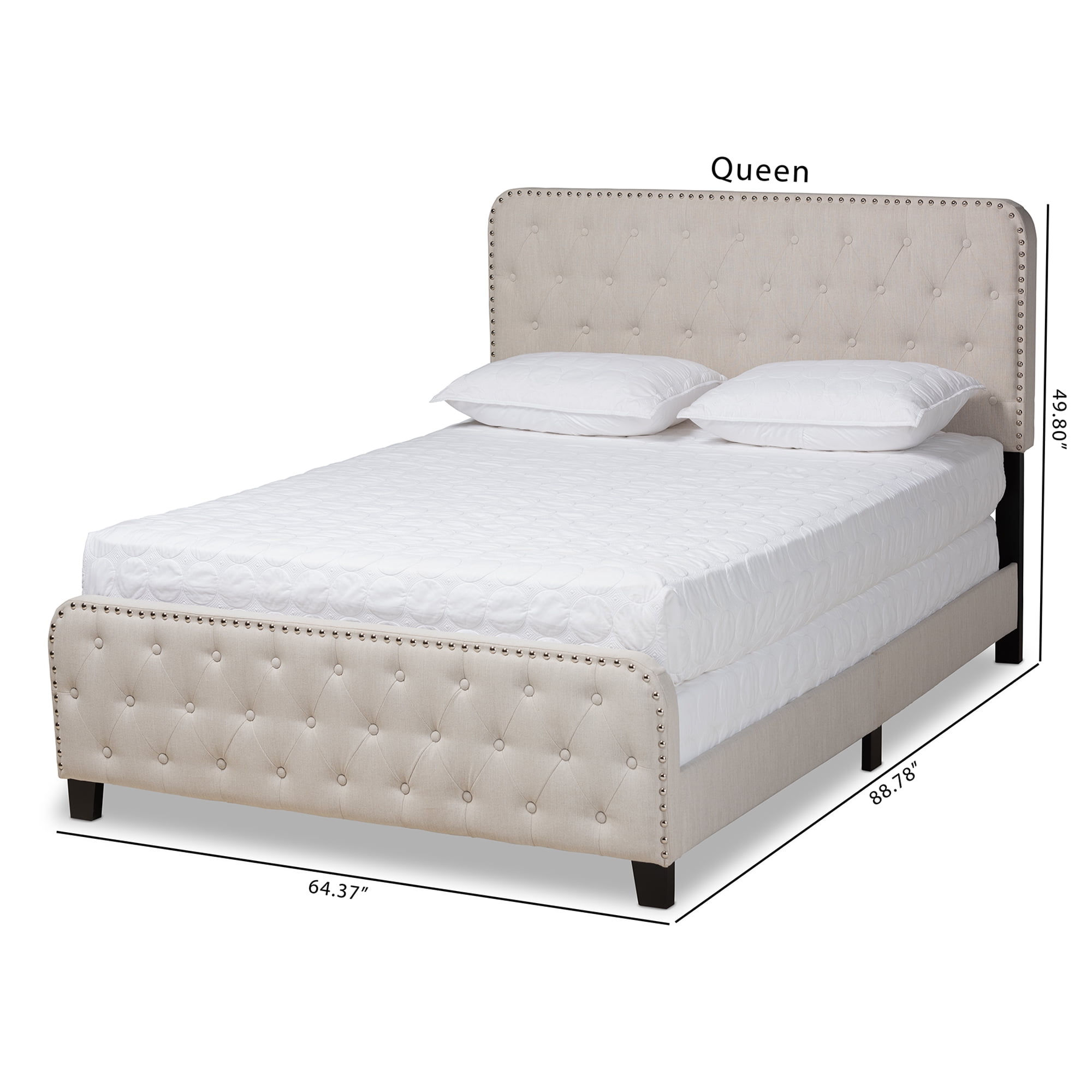 Constructed from rubberwood, MDF wood, and LVL Upholstered in linen-like polyester fabric and padded with foam Button-tufted Silver nailhead trim Box spring required Assembly required Made in Malaysia
