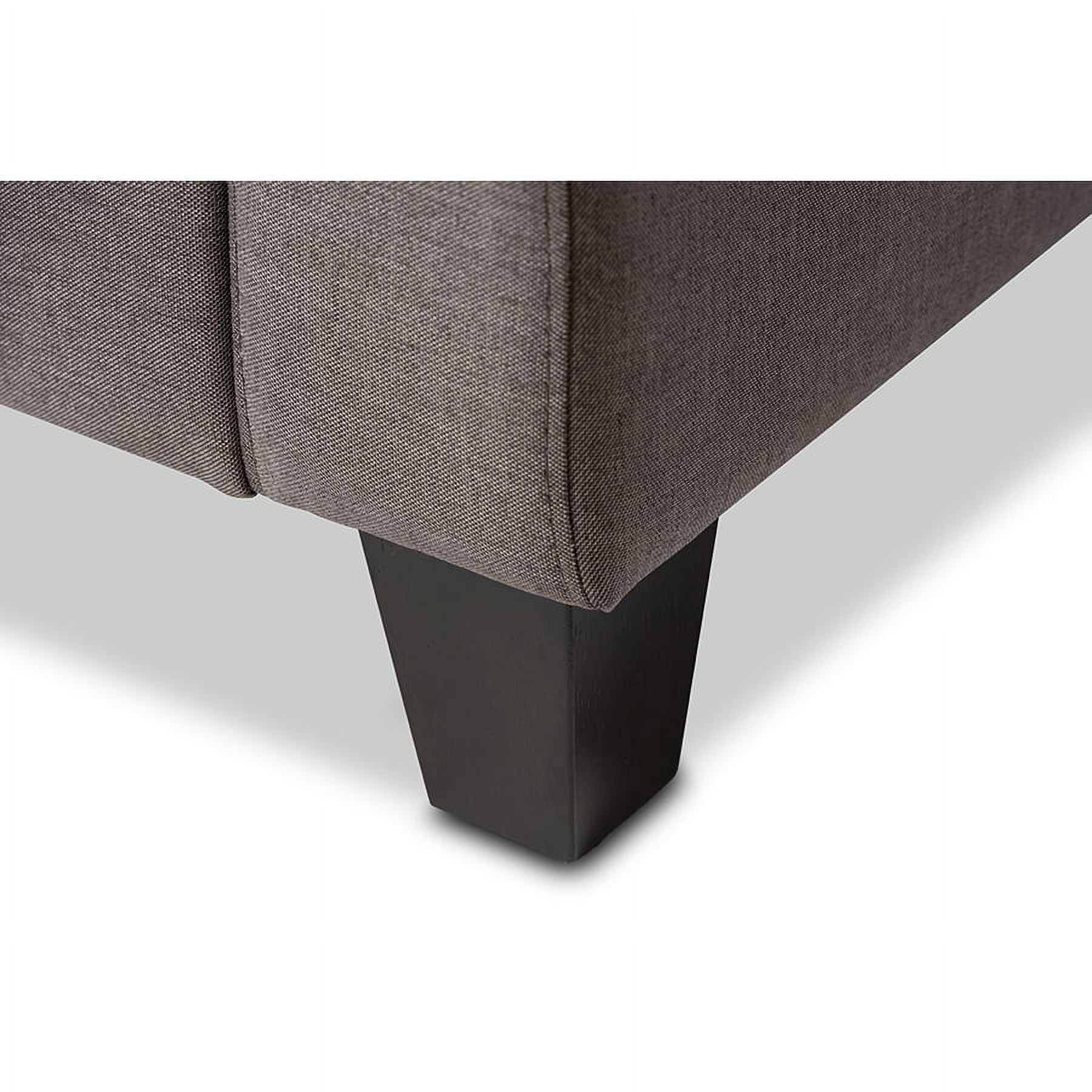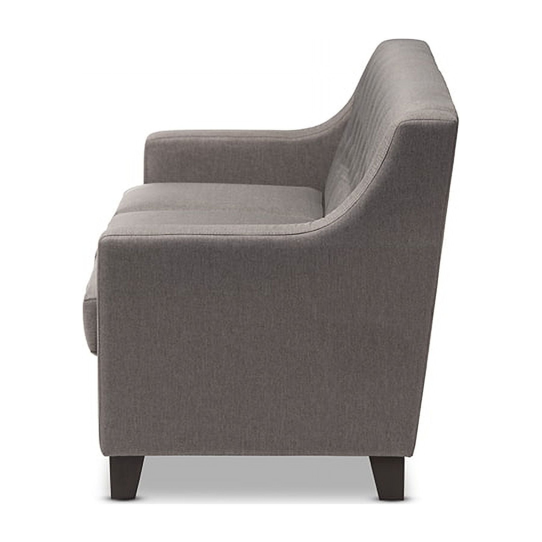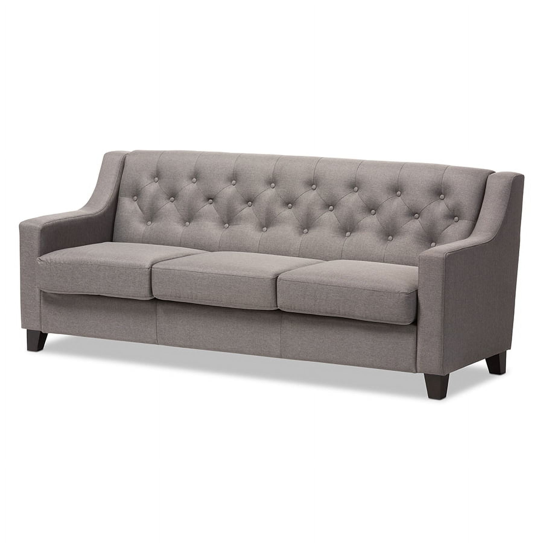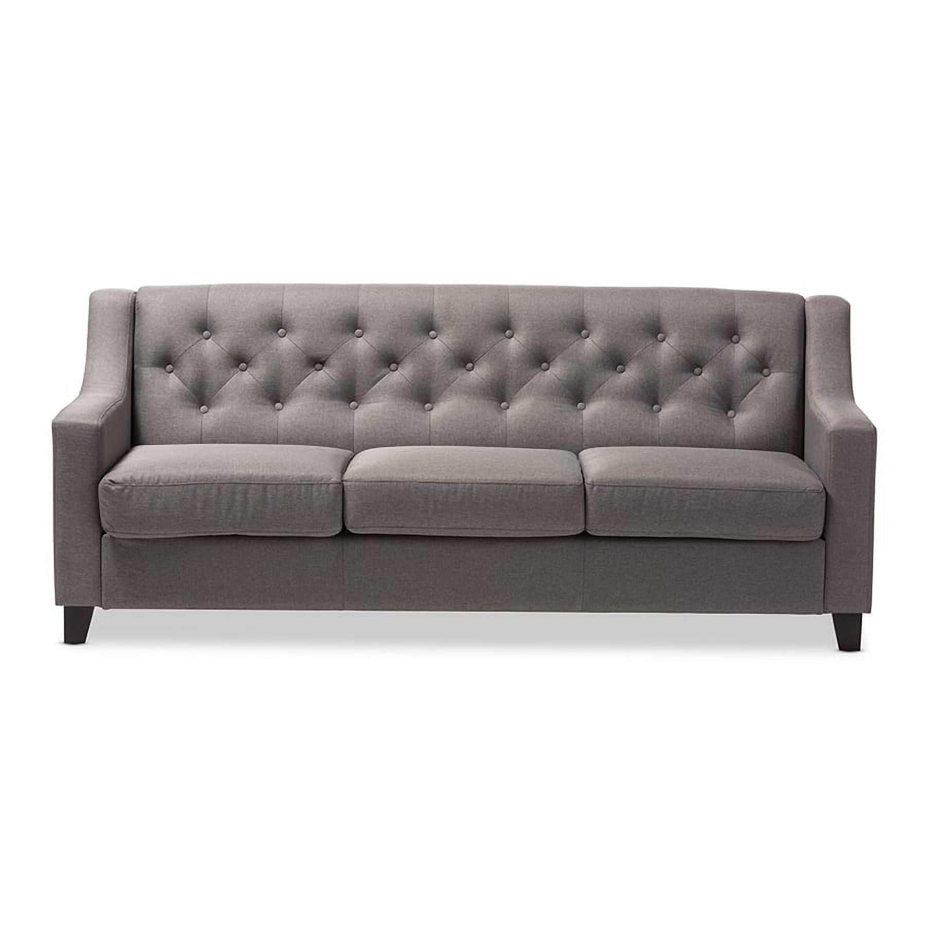Baxton Studio Arcadia Modern and Contemporary Grey Fabric Upholstered Button-Tufted Living Room 3-Seater Sofa The Arcadia grey fabric upholstered living room 3-seater sofa blends classic buttons detailing with modern lines and contrast wooden legs. This quality 3-seater sofa has been expertly crafted from solid hardwood and upholstered with a smooth and inviting grey polyester fabric that is easy to care for and is soft to the touch. The Arcadia provides comfort with its foam filled cushioning and seat which sits on a supportive and sturdy sprung base. With sleek lines and sensuous curves, the arcadia will add flair to your living space. Made in Malaysia, the Arcadia requires assembly. Specifications: Modern and contemporary sofa Button-tufted backrest Polyester fabric upholstered Wenge finishing wood legs Made in Malaysia Assembly required