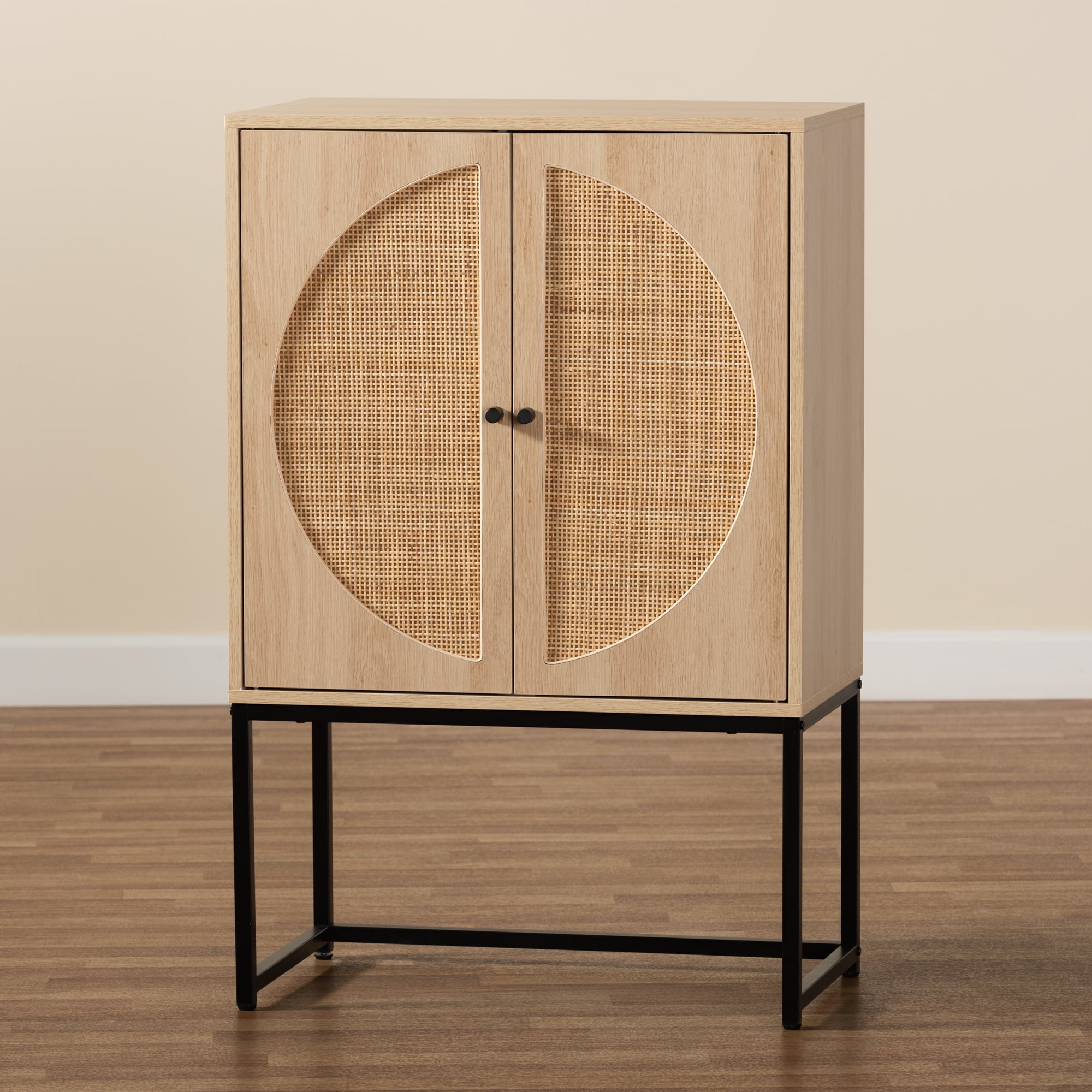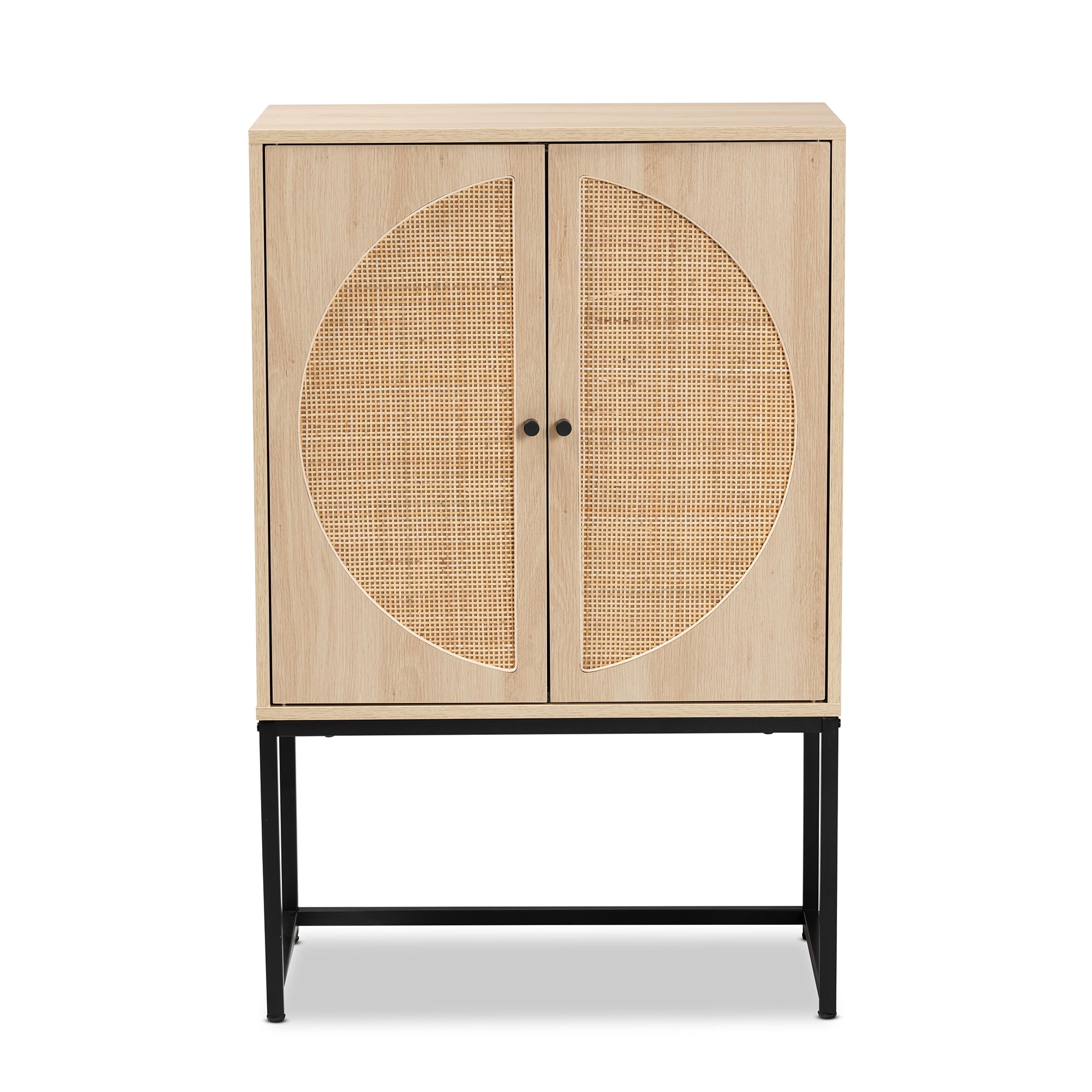 Baxton Studio Ardon Bohemian Light Brown Finished Wood and Black Metal 2-Door Storage Cabinet with Natural Rattan