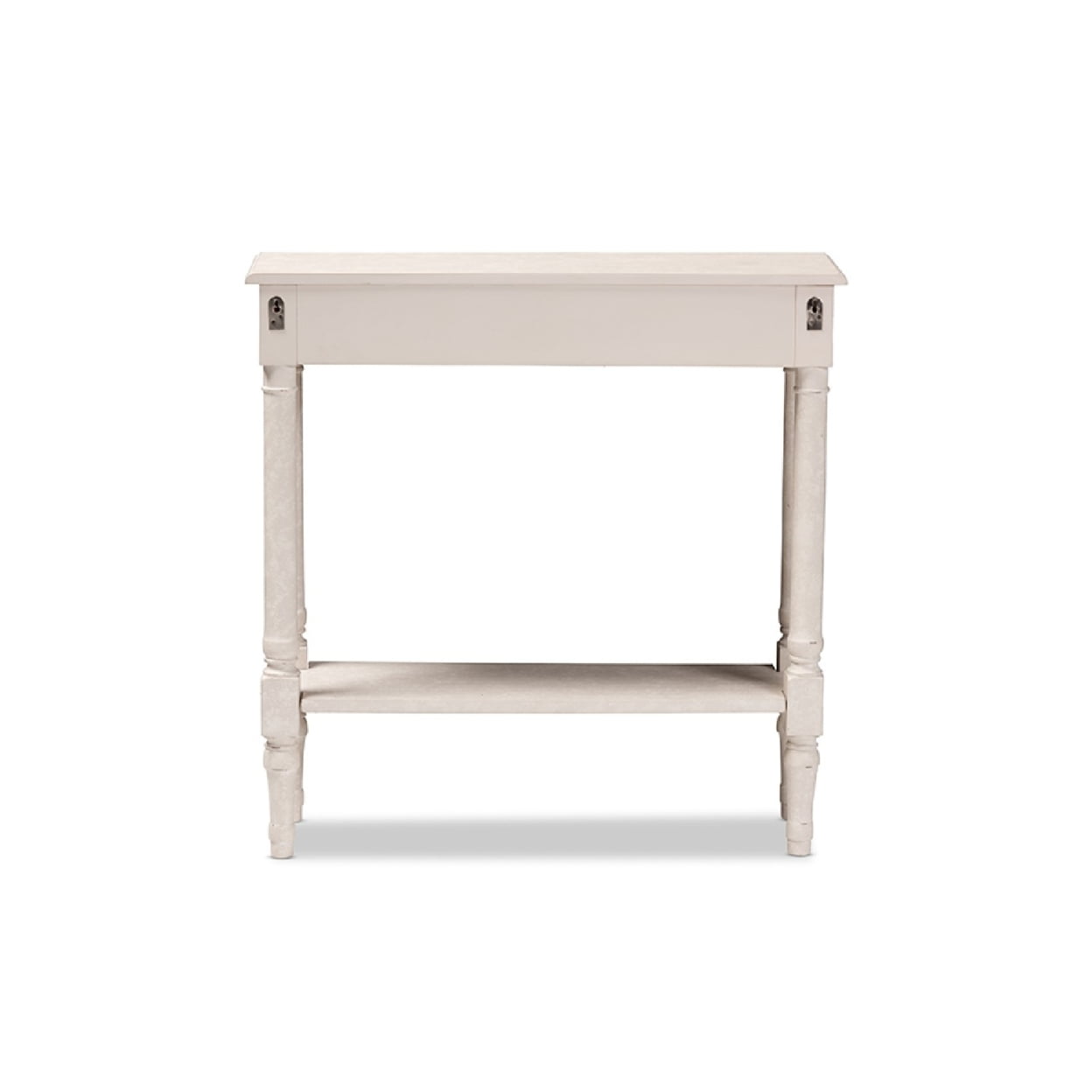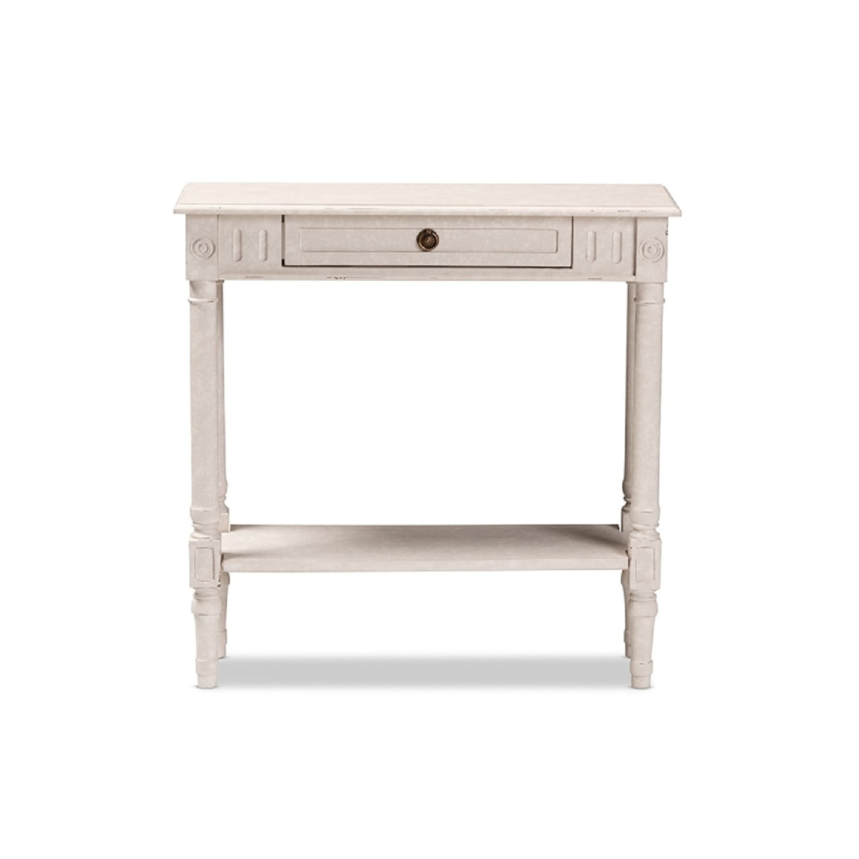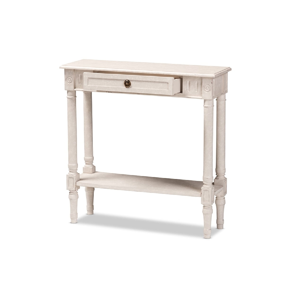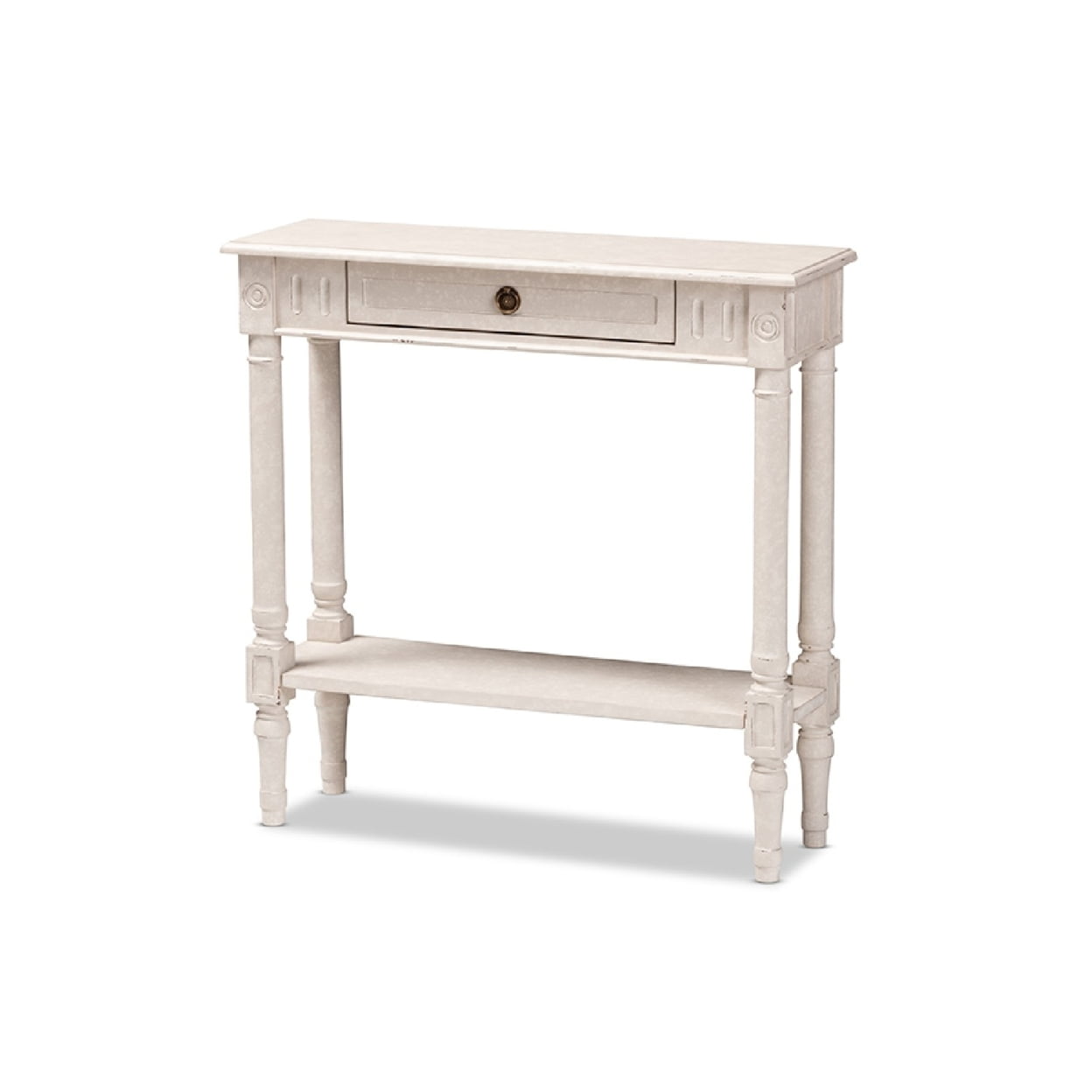 Baxton Studio Ariella Country Cottage Farmhouse 1-Drawer Console Table, Whitewashed The ornate ball-turned details and the weathered look of the Ariella 1-drawer console table will add an element of romance and bygone times to your home. The country cottage farmhouse-inspired design is evident in the amount of detail put into this console table. The Ariella features one pull-out drawer and one bottom shelf for added convenience. The whitewashed finish of the piece and a charming, dark bronze finished drawer pull gives the console table a bit of antique style. The Ariella is easy to coordinate with a wide range of styles, including French, rustic, and provincial-inspired decor. Add the Ariella to your entryway or mudroom to delight visitors. Made in Indonesia, the nightstand requires assembly. Specifications: Country cottage farmhouse console table Whitewashed finish Ornate ball turned leg design Dark bronze finished drawer pulls One pull out drawers and a bottom shelf Assembly required Made in Indonesia