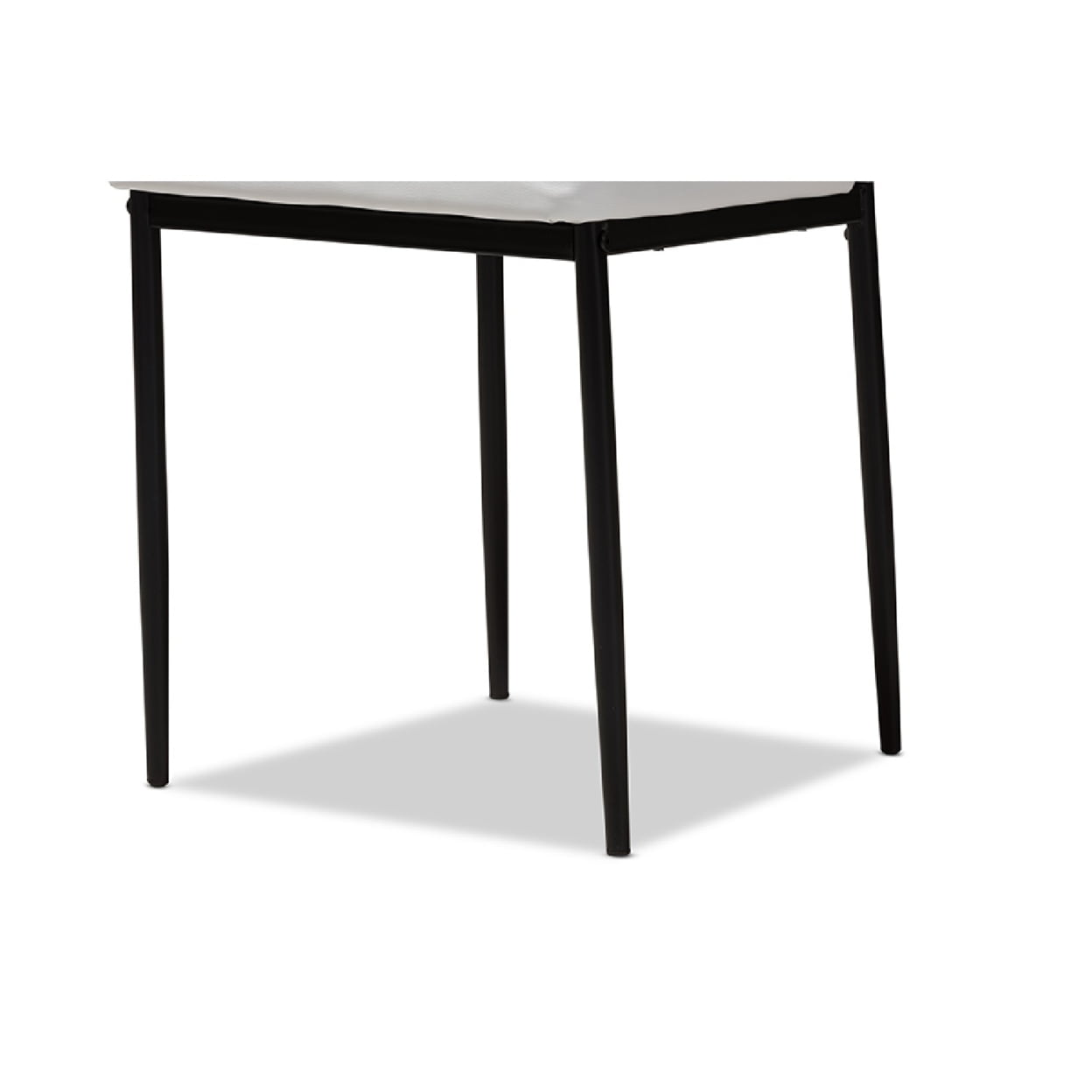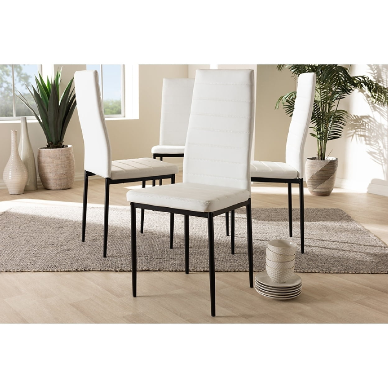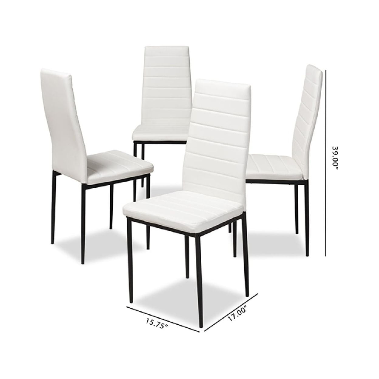 Baxton Studio Armand Modern and Contemporary White Faux Leather Upholstered Dining Chair (Set of 4) The sleek and minimalist look of the Armand dining chair will bring cool vibes to your space. The modern and contemporary-inspired design of the chair is trendy yet timeless. The white faux-leather upholstery of the Armand is easy to coordinate with your existing decor, and the horizontal, slatted chair back design amps up the clean, cool look of the chair. Black finishing on the chairs sturdy, metal legs adds the final touch to an overall modern, streamlined look. The Armand features foam padding and a gently arched chair back to encourage hours of comfort. This chair will be the simple solution youve needed to add that cool, executive look to your dining room, reception area, or other shared space. Made in China, this chair requires assembly. Specifications: Modern and contemporary dining chair Faux leather upholstery Black finished metal legs Horizontal slatted chair back design Foam padded seat Assembly required Made in China