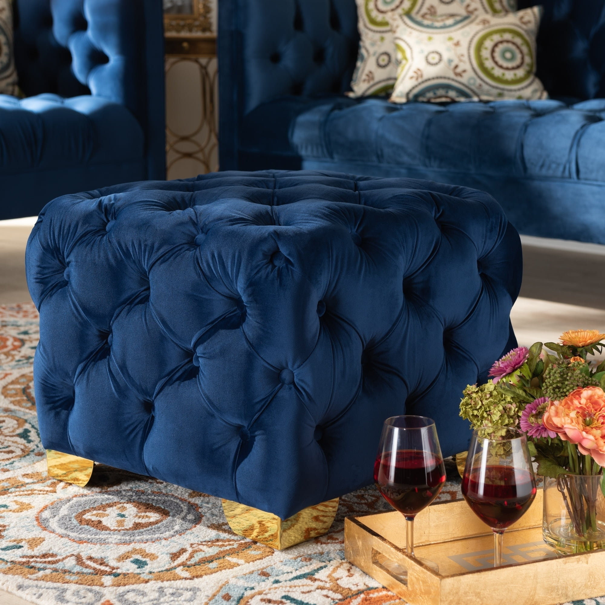 Baxton Studio Avara Glam and Luxe Royal Blue Velvet Fabric Upholstered Gold Finished Button Tufted Ottoman
