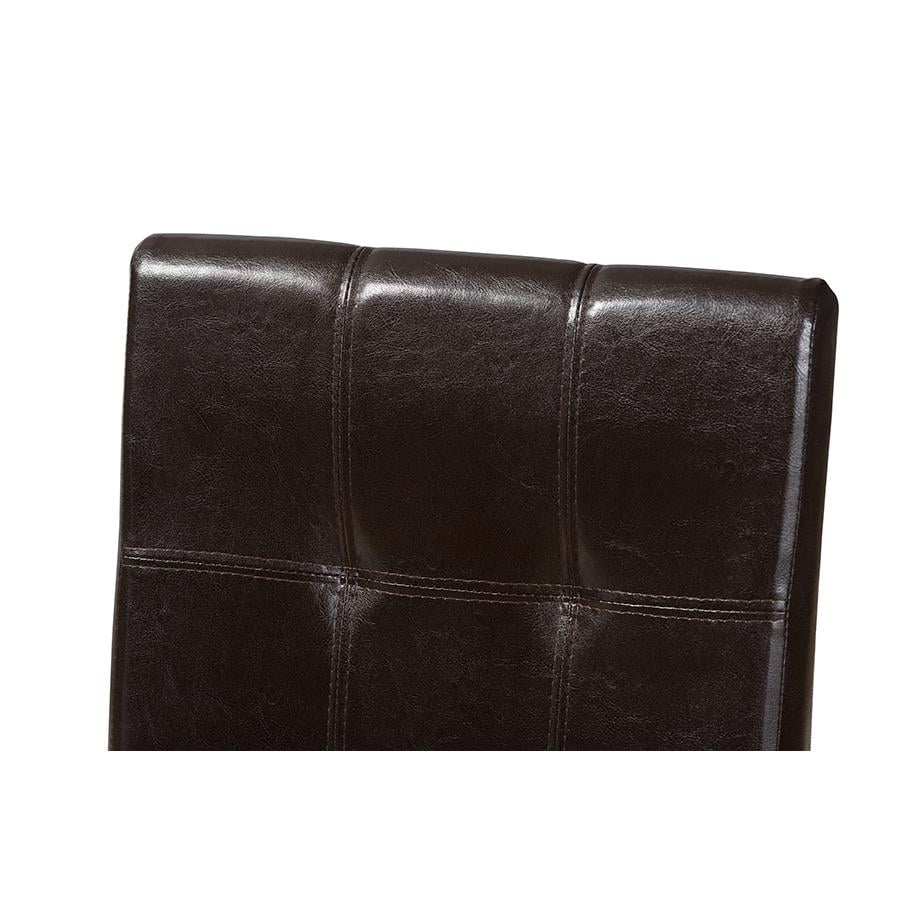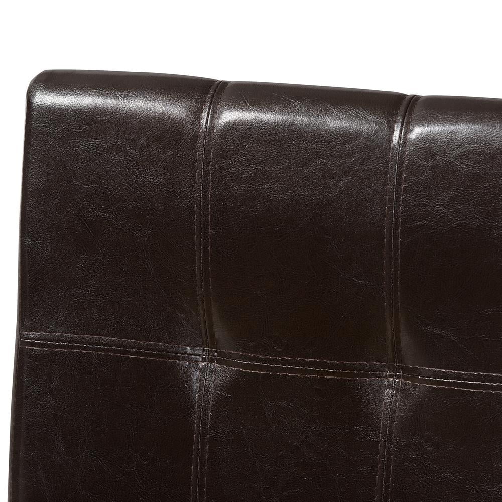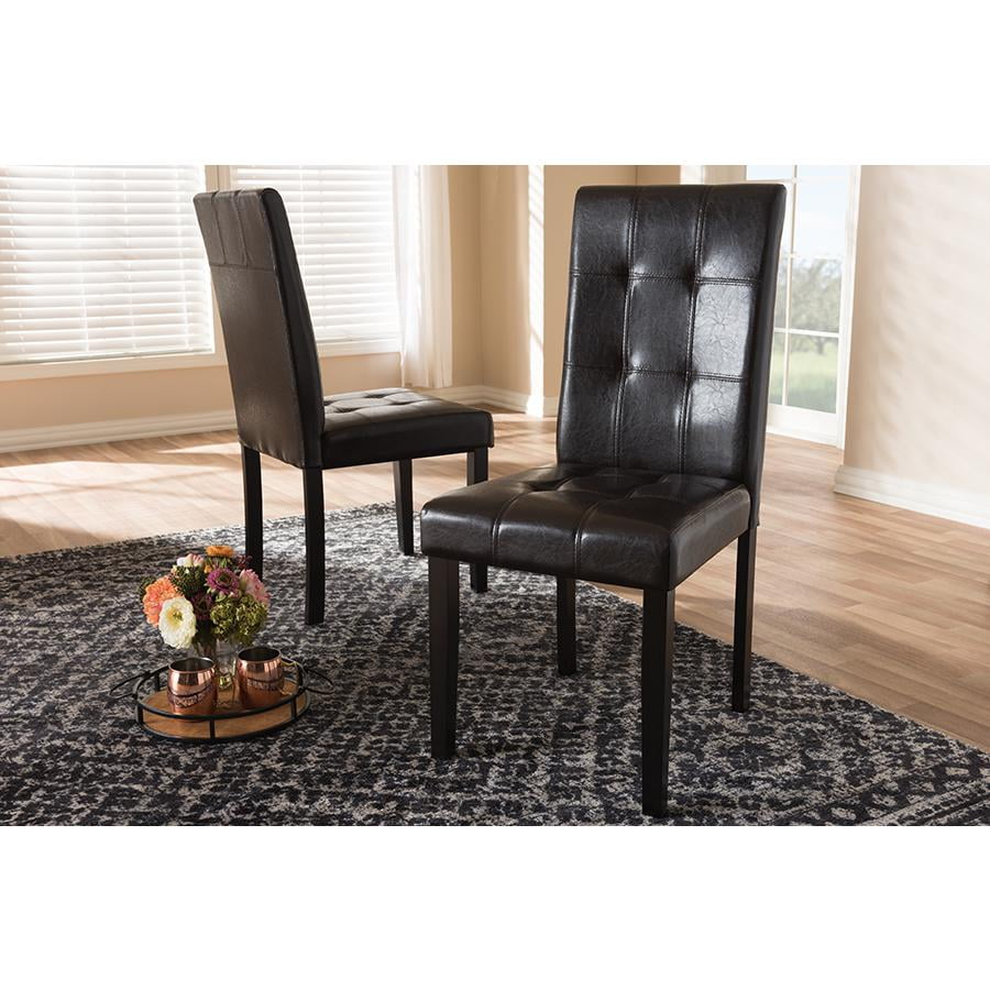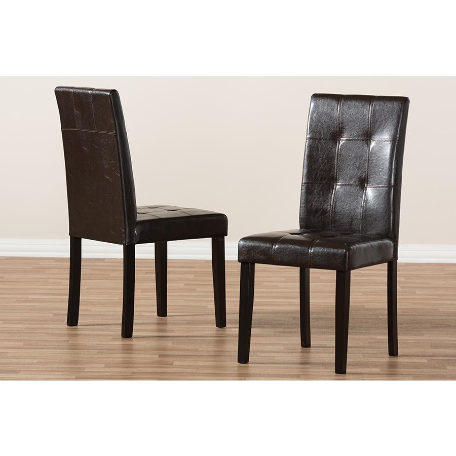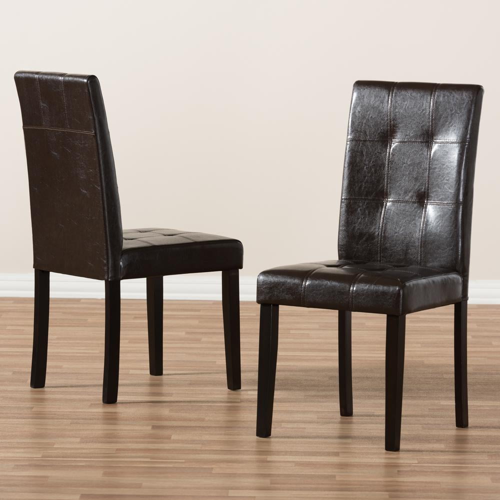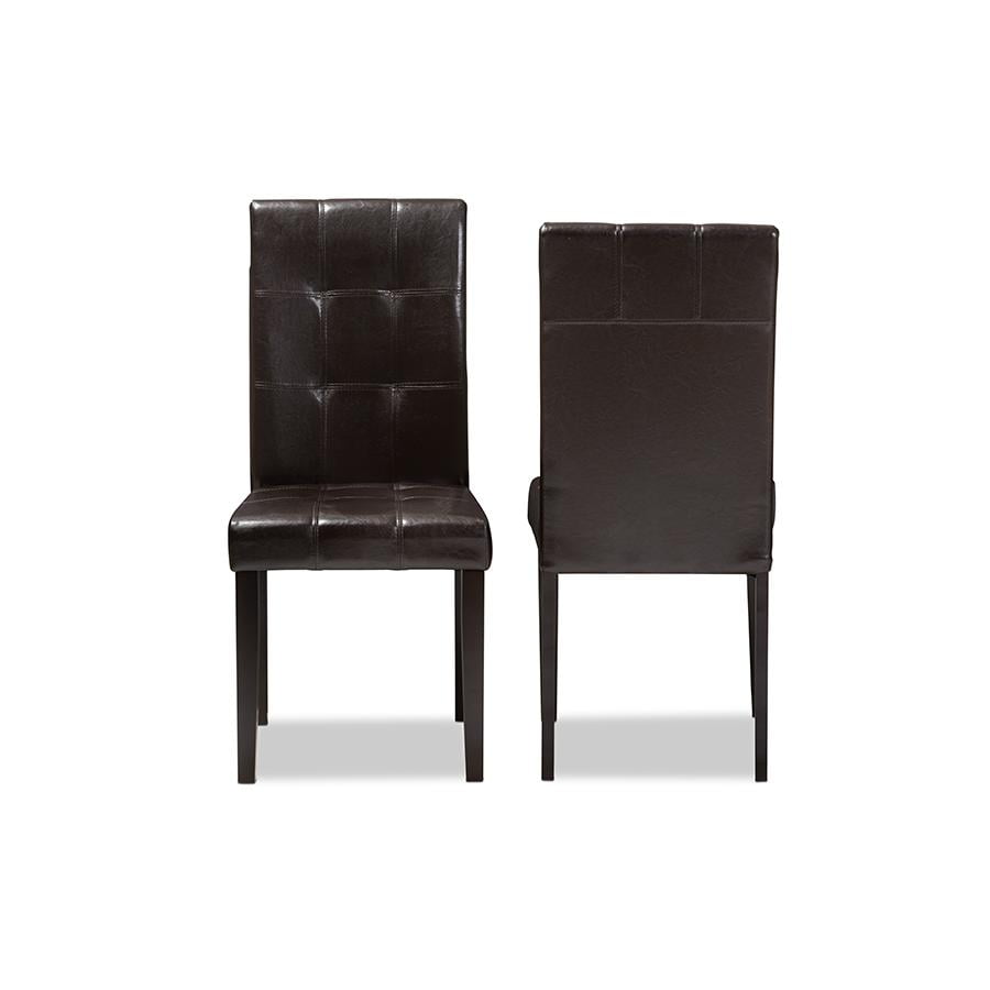 Finish: Dark Brown Seating Dimensions: 18.5″ H (from Floor) x 17.72″ W x 16.93″ D Material: Faux Leather, Solid Rubberwood, Foam Back Height: 37.99″ Style: Contemporary Set includes two chairs Tapered legs Tufted detailing Assembly required Care Instruction: Cabinet wipe with a dry cloth; cushion spot clean only Warranty: 30 Days limited