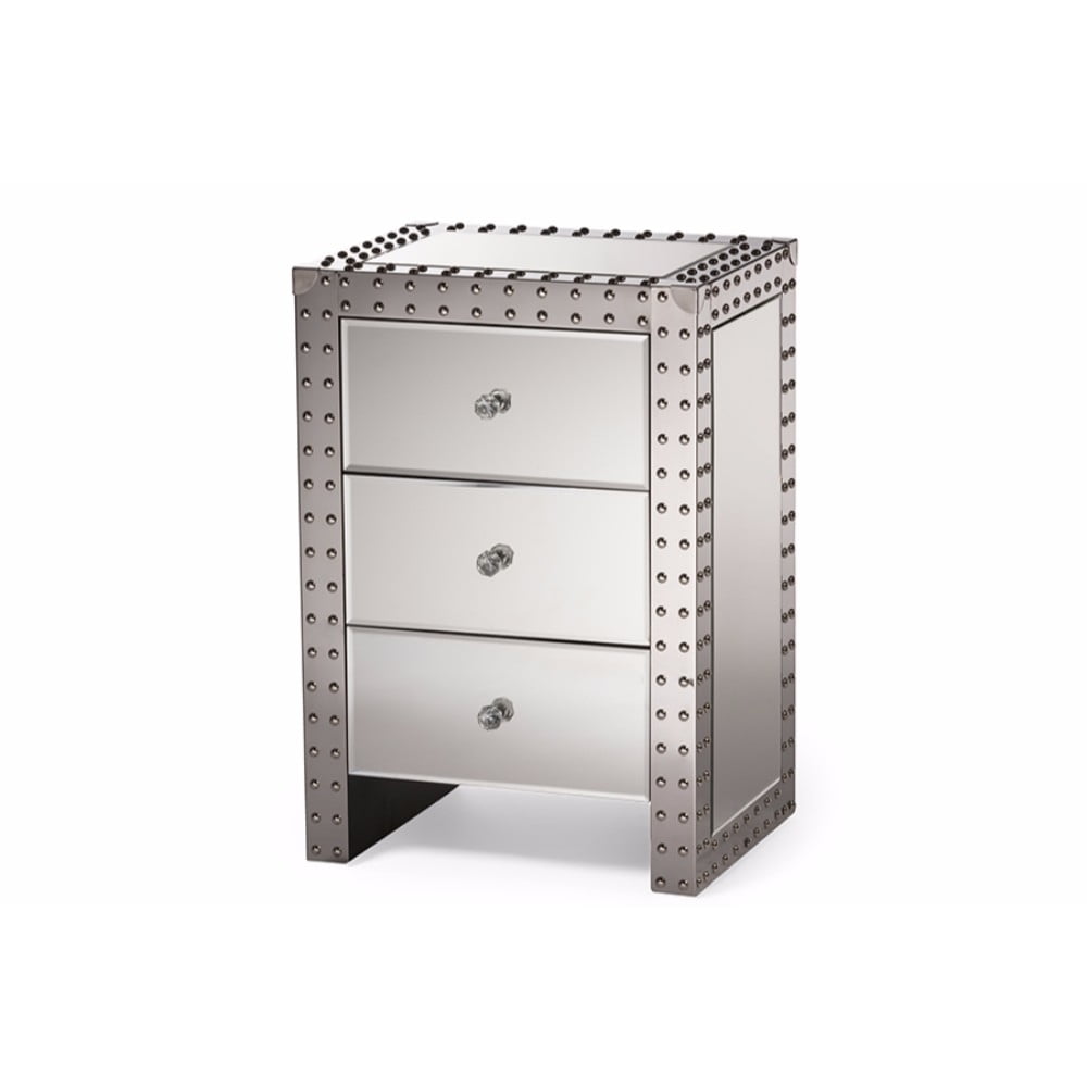 The end table is an essential piece for any shared space. The Azura mirrored contemporary end table offers a sleek, upscale look for any modern interior. Stylishly embellished with mirrored glass finish and nail heads trim on all sides, the Azura offers the perfect touch of elegance and will be a stunning piece to add to your collection. Three spacious drawers line the front with each one fitted with lovely crystal knobs. These provide an understated look while making the drawers accessible. The mirrored finish surfaces and the silver nail heads trim will catch the light beautifully and create a glamorous, sparkling look in your space. Made in China, the Azura end table will arrive fully assembled.