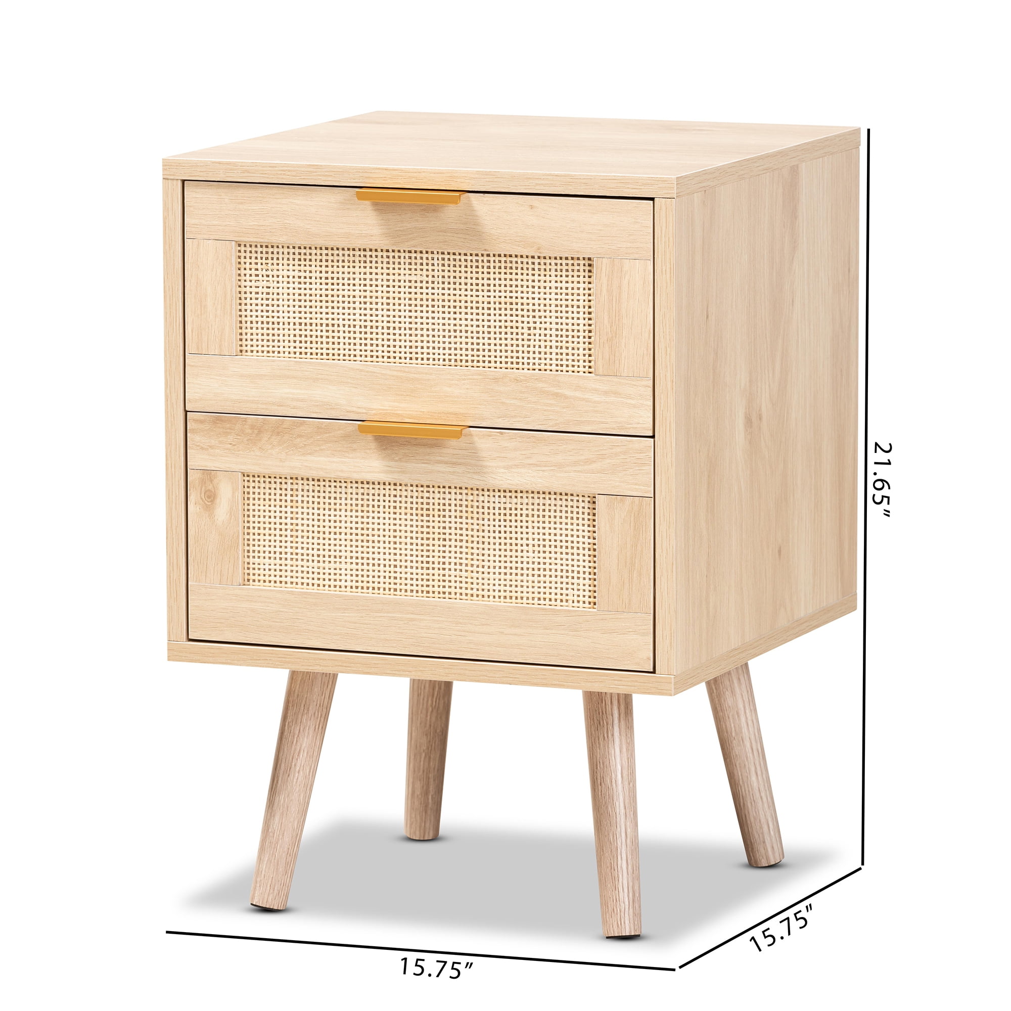 Add a retro inspired accent to your interior with the stunning Baird end table. Made in China, the Baird is comprised of sturdy wood showcasing a light oak brown finish. Two drawers and a square tabletop offer plenty of space for a variety of household essentials. Requiring assembly, the end table features woven rattan drawer faces and gold tone metal handles for eye catching style. A handy piece brimming with personality, the Baird end table is sure to enhance any layout. This is a product of nature and may have variations in areas such as, but not limited to, color, pattern, grain and texture. The hair-like strands of rattan/rattan-fiber are common due to nature of the material.
