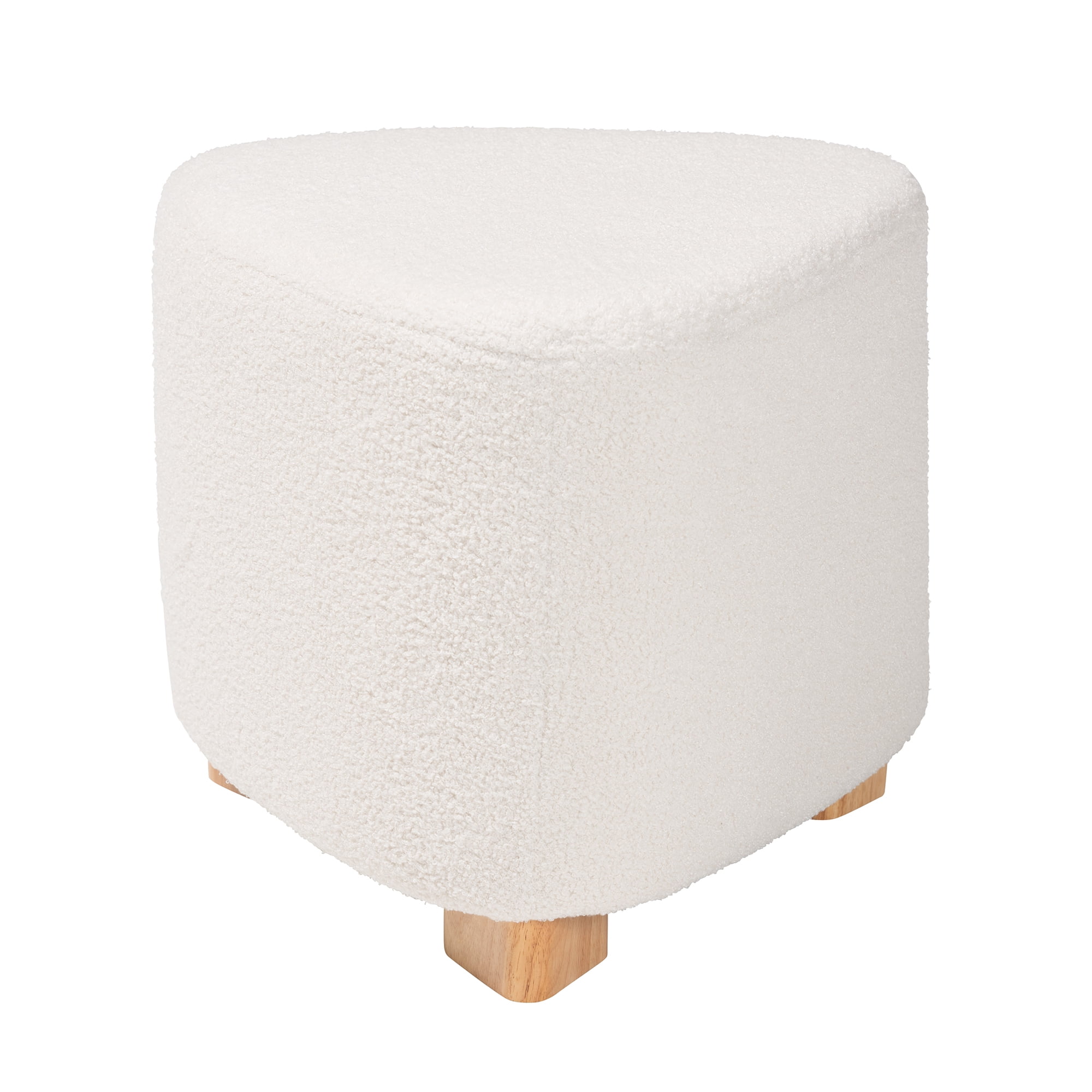 • Modern and contemporary ottoman • Constructed from Eucalyptus wood frame • Triangular seat • Padded with foam and upholstered in boucle fabric • Triangular wood feet • Assembly required • Made in China • Product Weight: 11.5 Pound • Package Weight: 15 Pound • Overall Dimensions: 20.50″ W x 18.50″ D x 16.50″ H; Legs: 2.50″ H; • Product Color: Ivory • Product Composition: Fabric “100% Terylene”/Eucalyptus Wood/Walnut Wood/Foam