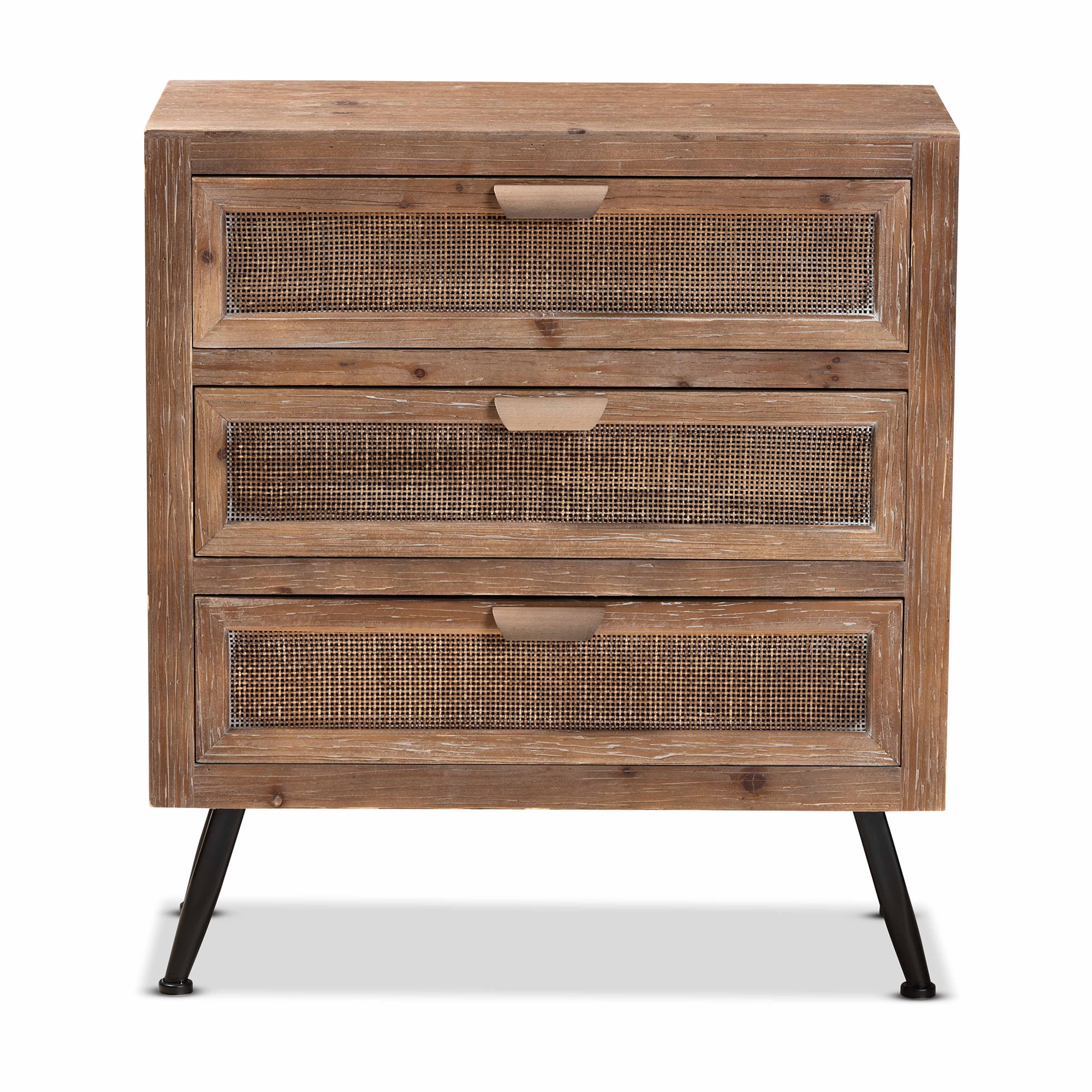 Baxton Studio Calida Mid-Century Modern Whitewashed Natural Brown Finished Wood and Rattan 3-Drawer Storage Cabinet