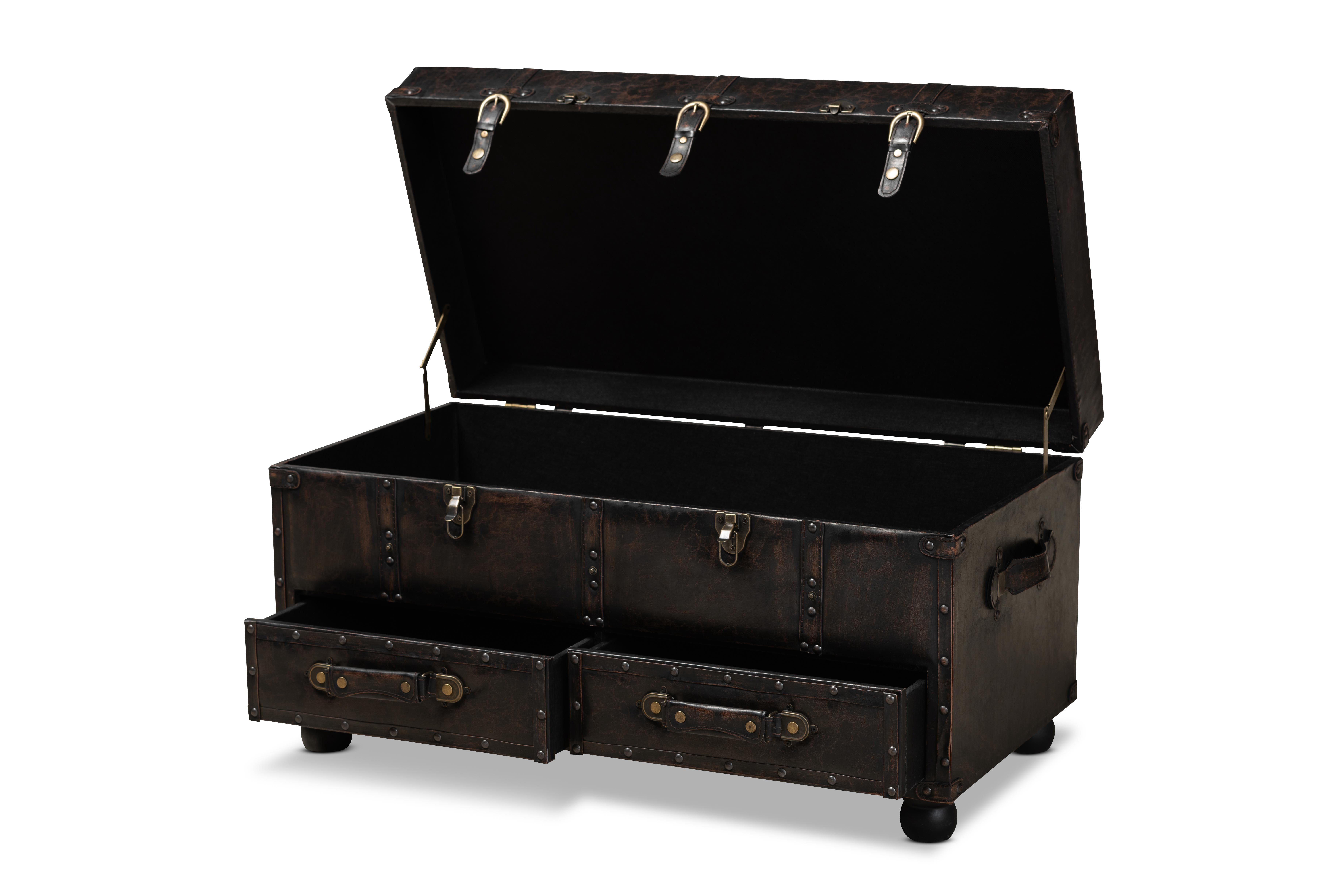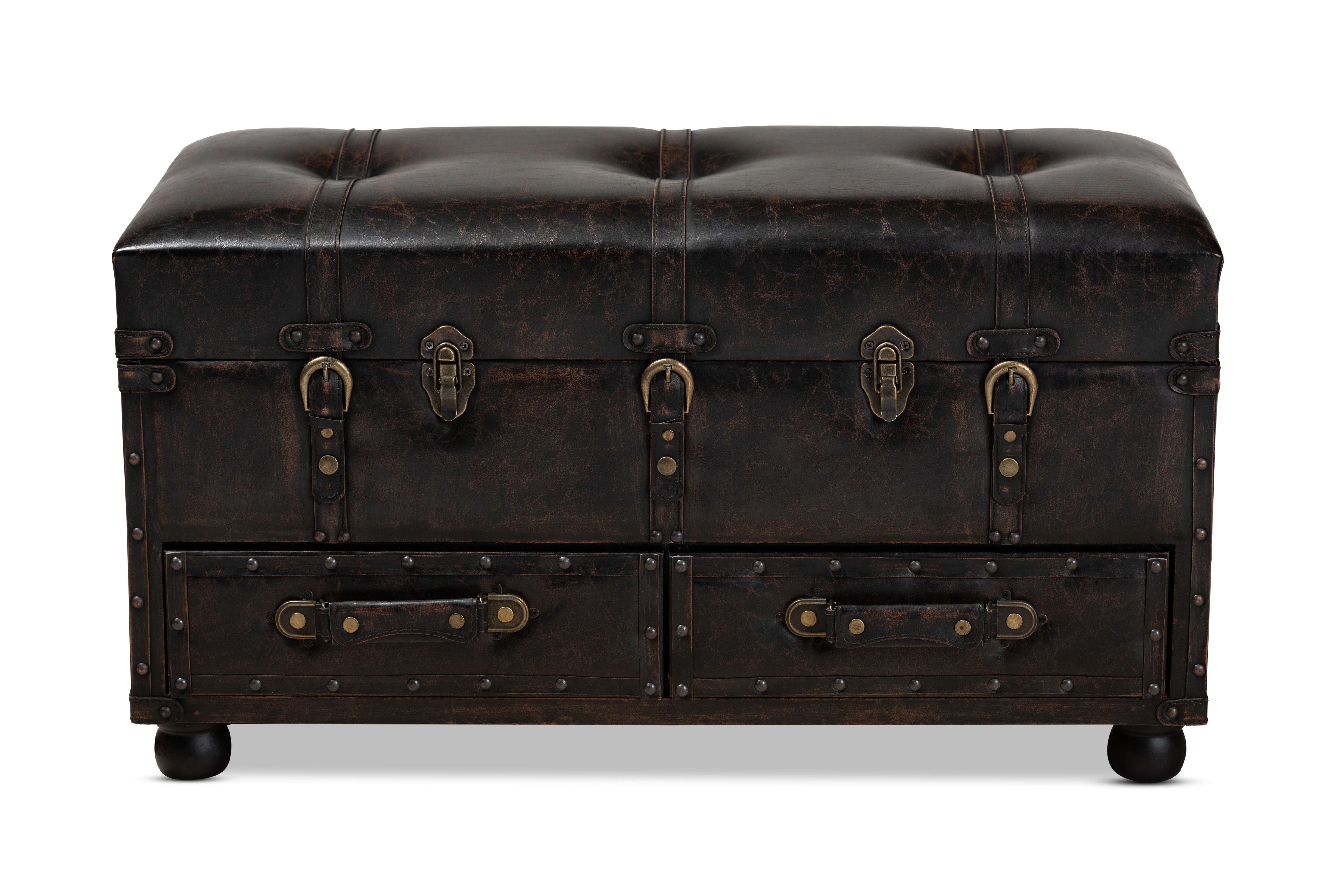 Stylish and versatile, the Callum ottoman is an easy addition to any space. Set on top of black bun feet, the Callum is upholstered in a distressed dark brown faux leather for an authentic antique look. Ample storage space is located beneath the cushioned lift-up lid, as well as in two drawers situated at the bottom. Inspired by vintage steamer trunks, the Callum is accented with antique brass buckles and latches. Antique bronze nailheads and button tufting add an extra dose of style. The Callum ottoman is made in China and will arrive fully assembled. Dimensions: 17.52″ high x 32.01″ wide x 16.26″ deep; Inner storage dimensions: 30.51″ wide x 14.76″ deep x 6.1″ high; Drawer dimensions: 13.39″ wide x 12.6″ deep x 3.94″ high;