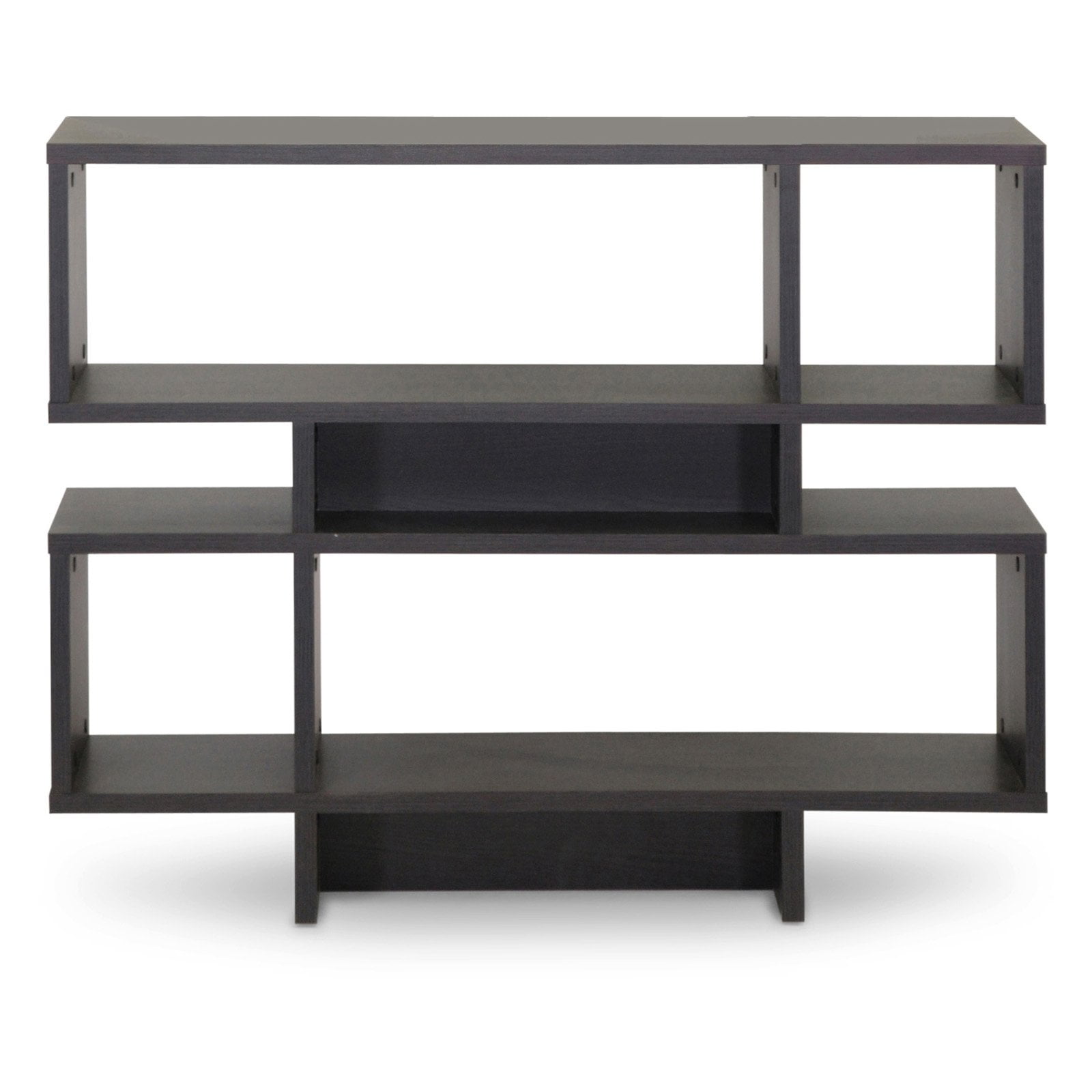 Inject a boost of dazzling contemporary interior fashion into your living space: our Cassidy Designer Bookshelf is a sculptural, eye-catching piece sourced from Malaysian craftsmen. Made with smooth dark brown(Espresso) faux wood grain paper veneer, the Cassidy Display Shelf features an engineered wood frame built with four levels, three of which can be used for display of your decor collection. Dusting with a dry cloth is recommended for cleaning of this unit. A 6-level and 8-level option of the Cassidy Shelf are also available (each sold separately). Features: Finish: espresso Made of engineered wood and faux wood grain paper veneer Contemporary style Product Weight: 43lbs Specifications: Product Dimensions: 35.25″ H x 44″ W x 11.4″ D