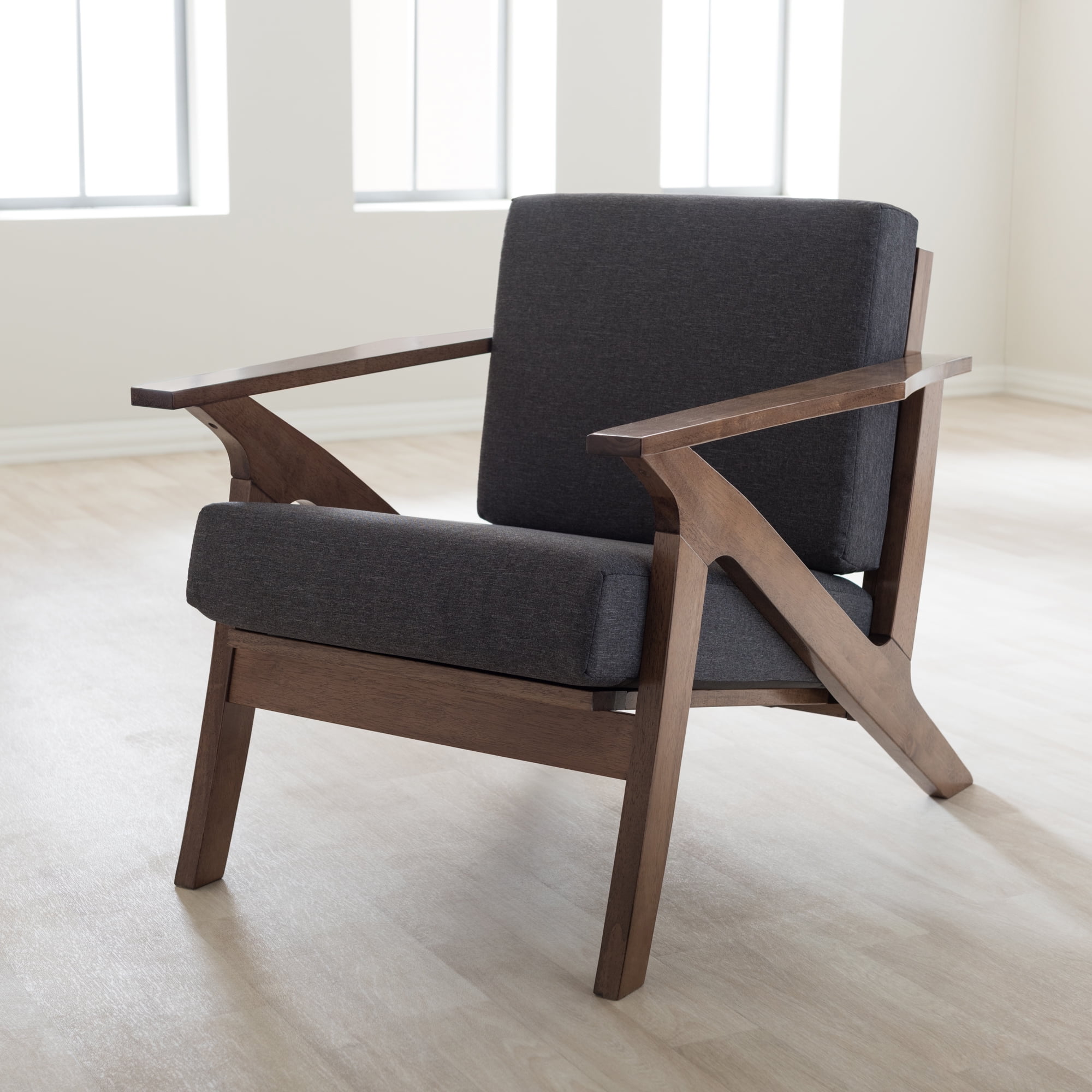 Mission style living room lounge chair Grey fabric upholstery Removable cushions Made in Malaysia, the Cayla requires assembly