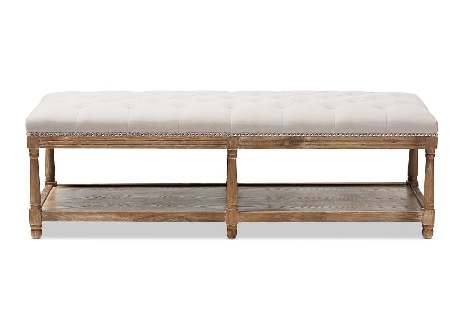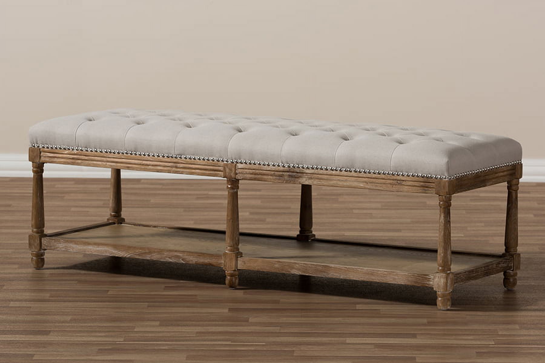 Baxton Studio Celeste French Country Weathered Oak Beige Linen Upholstered Ottoman Bench The Celeste ottoman is a gorgeous French Provincial beauty, that features intricate tufted detailing and carved woodwork. Add an instant sense of glamour to an interior with this piece, which looks great in any room of the home. The ottoman bench is as practical as it is pretty, featuring a plush comfortable seat with buttons and lower shelf for storage. Silver nail heads detailing gives the piece a contemporary appeal while a medium density foam filling ensures ultimate comfort. Ideal as a footstool or seating bench, the Celeste is built with a solid oak frame. The weathered finishing adds a rustic touch and completes the look. Made in China, the Celeste will arrive fully assembled. Specifications: French country ottoman bench Weathered finishing Beige linen upholstery Button-tufting design Carved woodwork Fully assembled