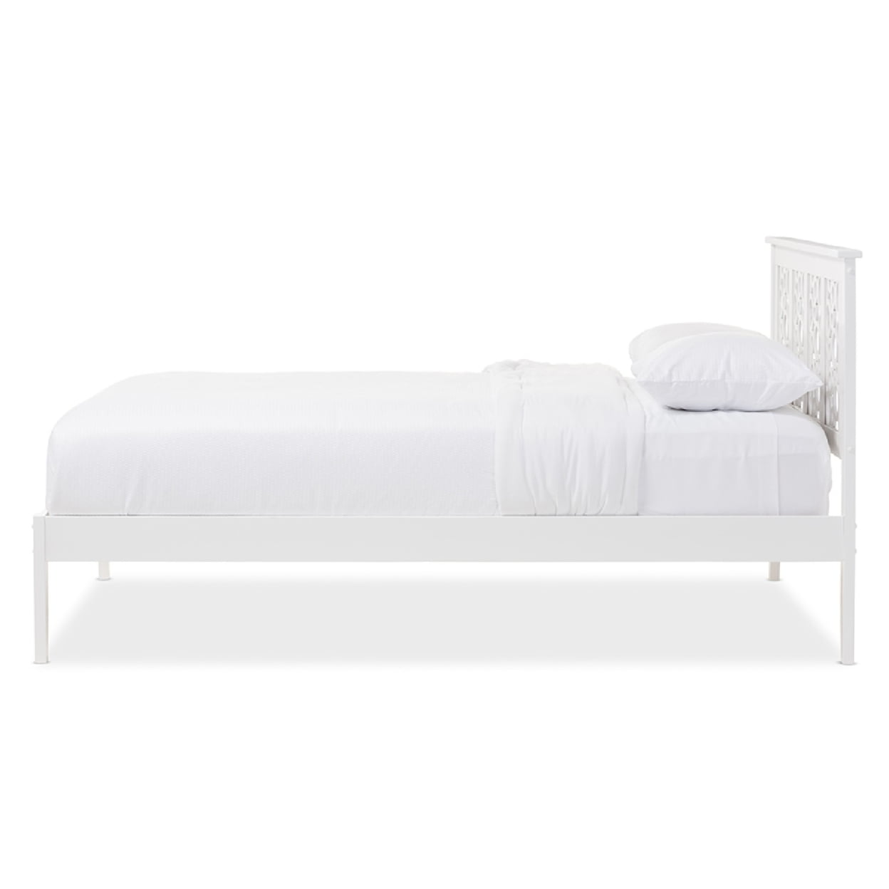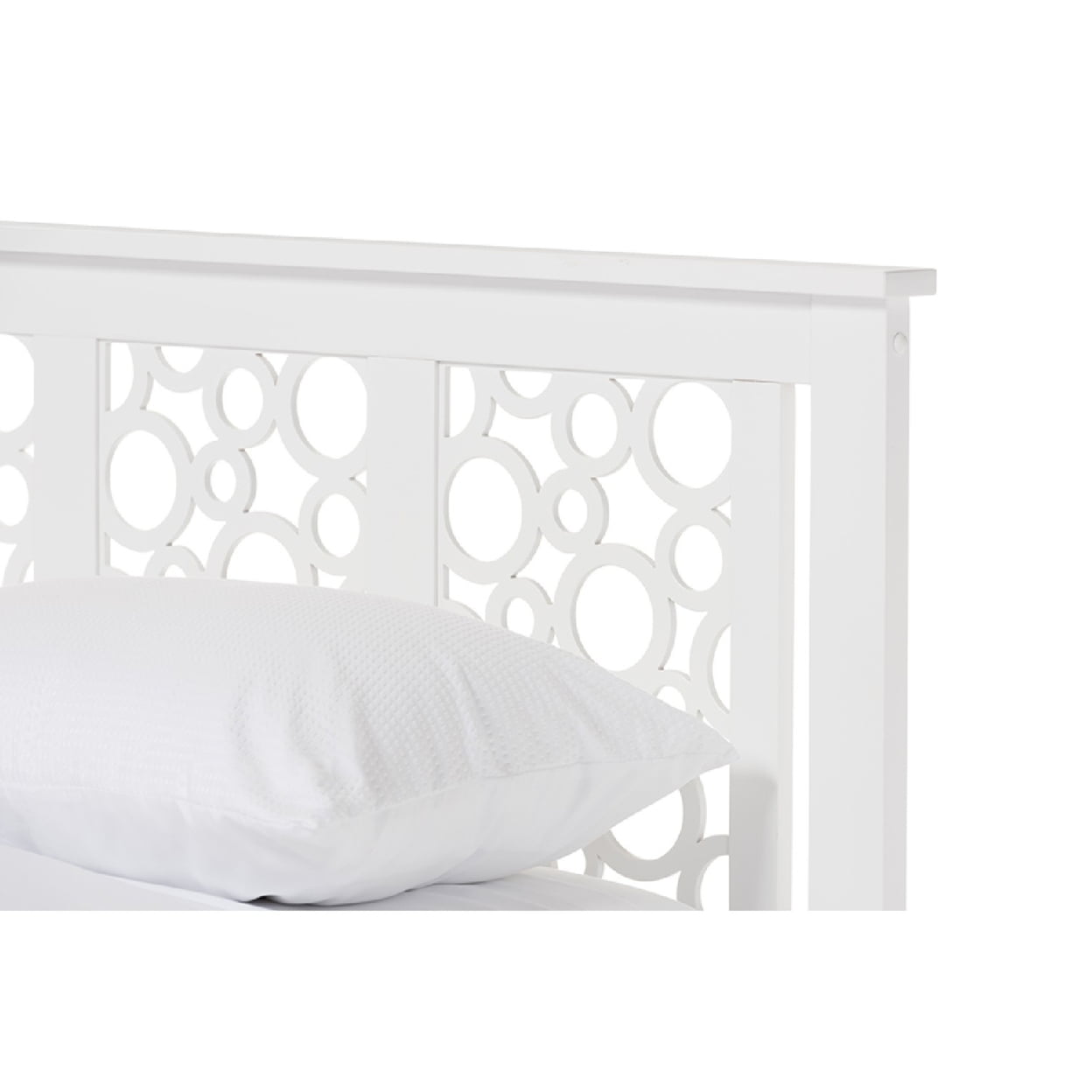 Open rings on the Baxton Studio Celine Platform Bed allow your wall color to peek through. This fun platform bed is built of wood and comes in a versatile white finish. Instead of box springs, it features a supportive slat foundation. This bed comes in your choice of available sizes.