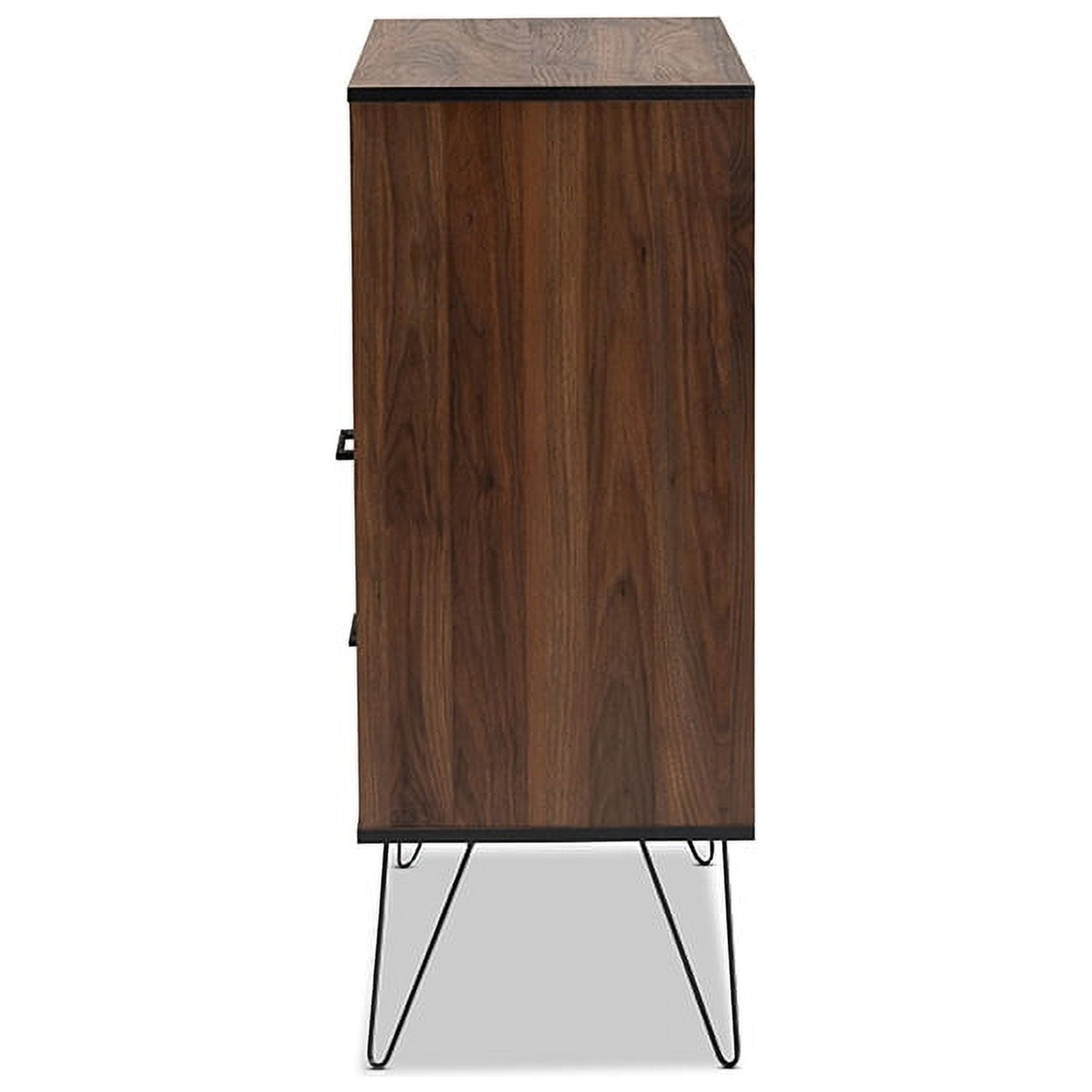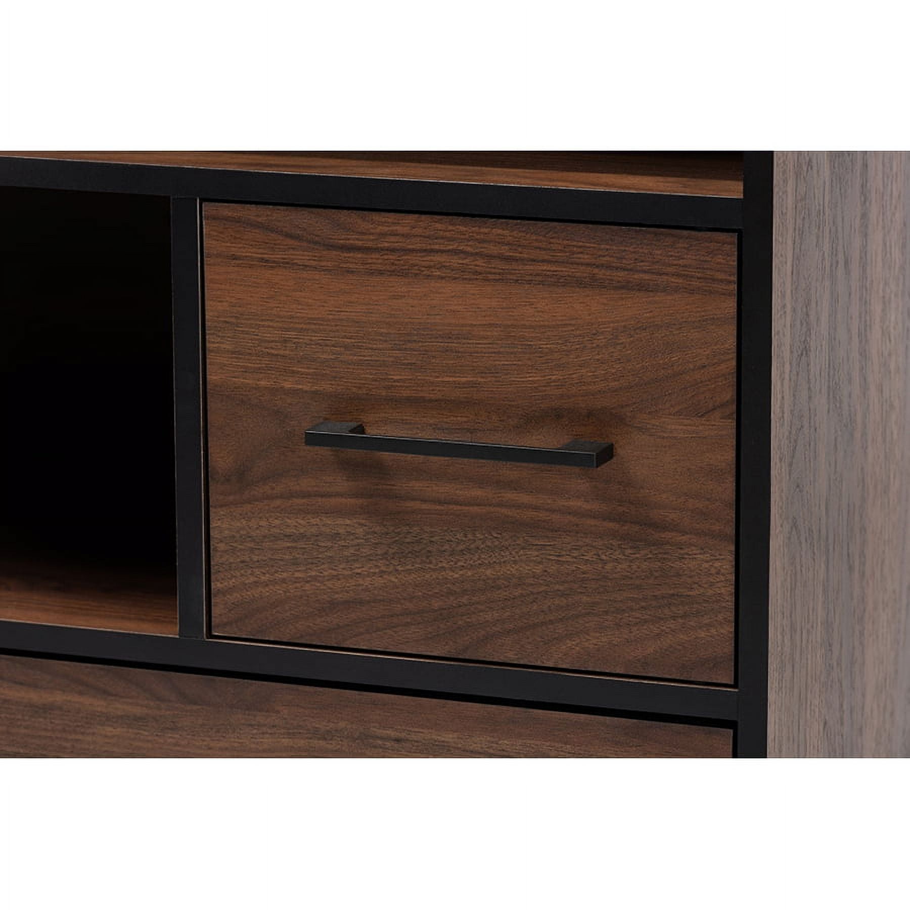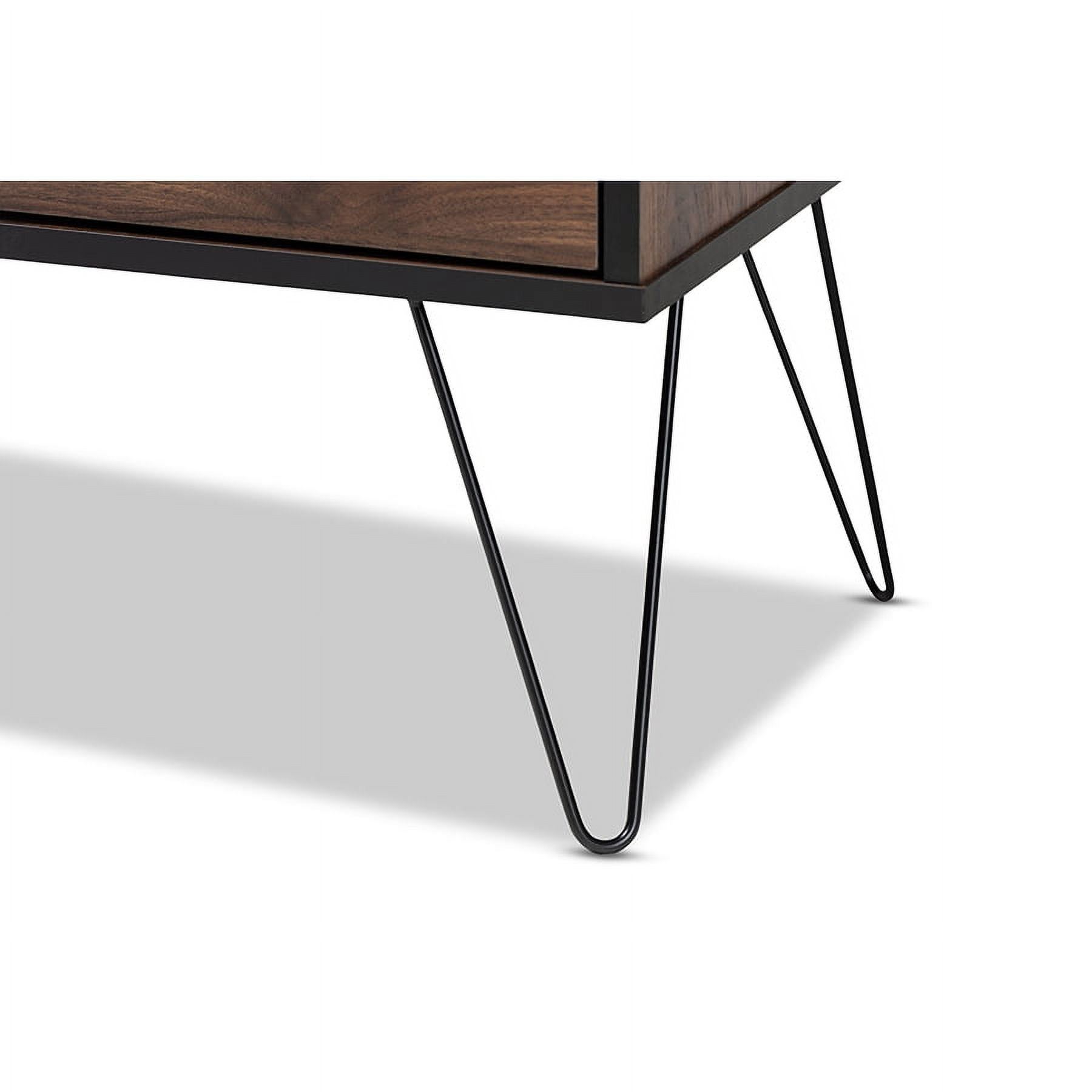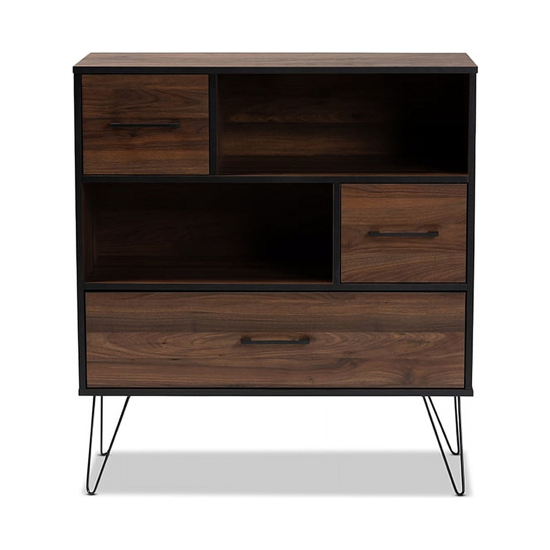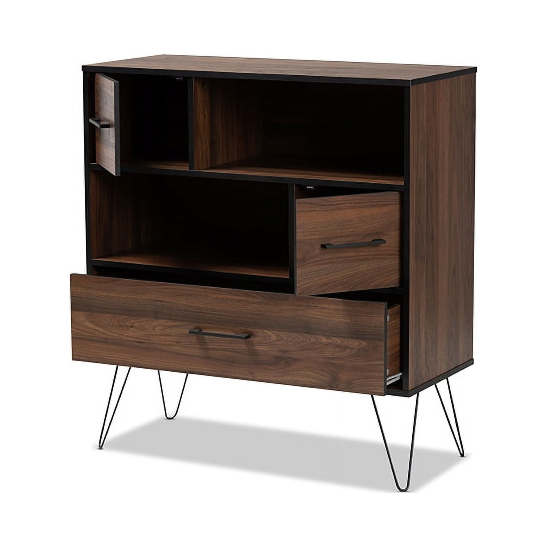 Constructed from rubberwood, MDF wood, engineered wood, and metal Two-tone black and walnut brown finish One (1) drawer Two (2) open shelves and (2) enclosed storage compartments Black hairpin legs Long black handles Assembly required