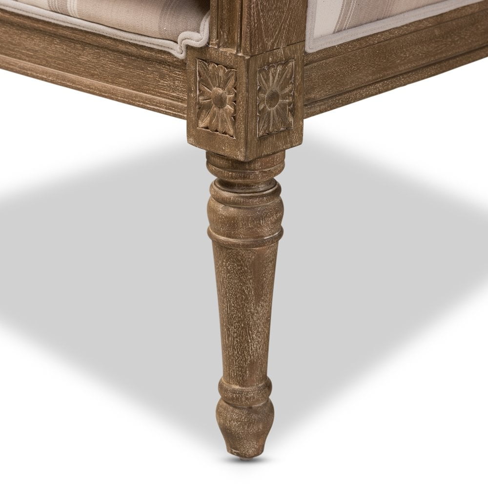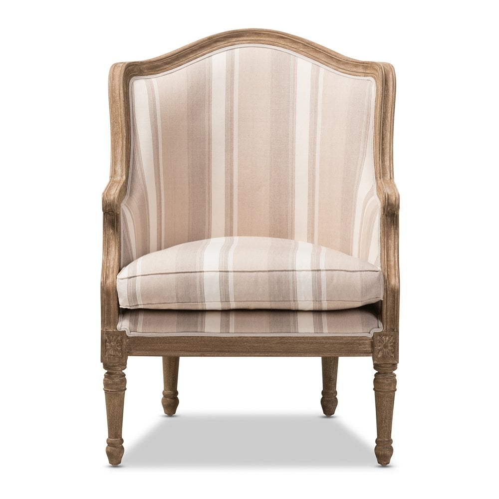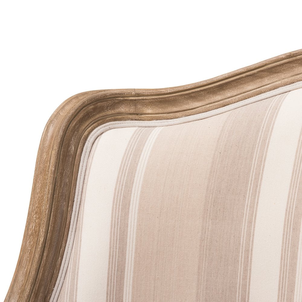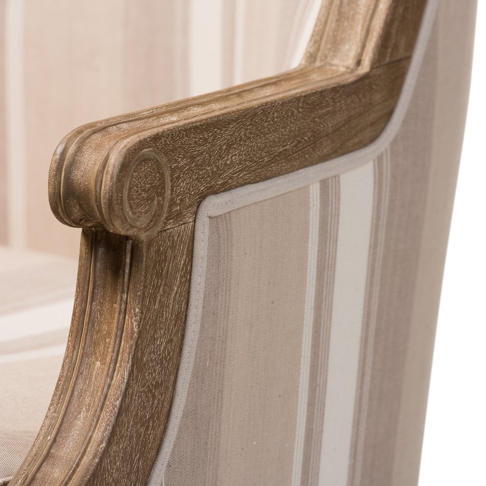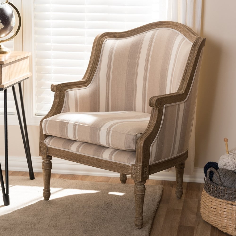 Traditional French accent chair Versatile, beige cotton base with tan and brown stripes. Cedar wood frame with distressed brown oak wood finish including white streaking Polyurethane foam cushions