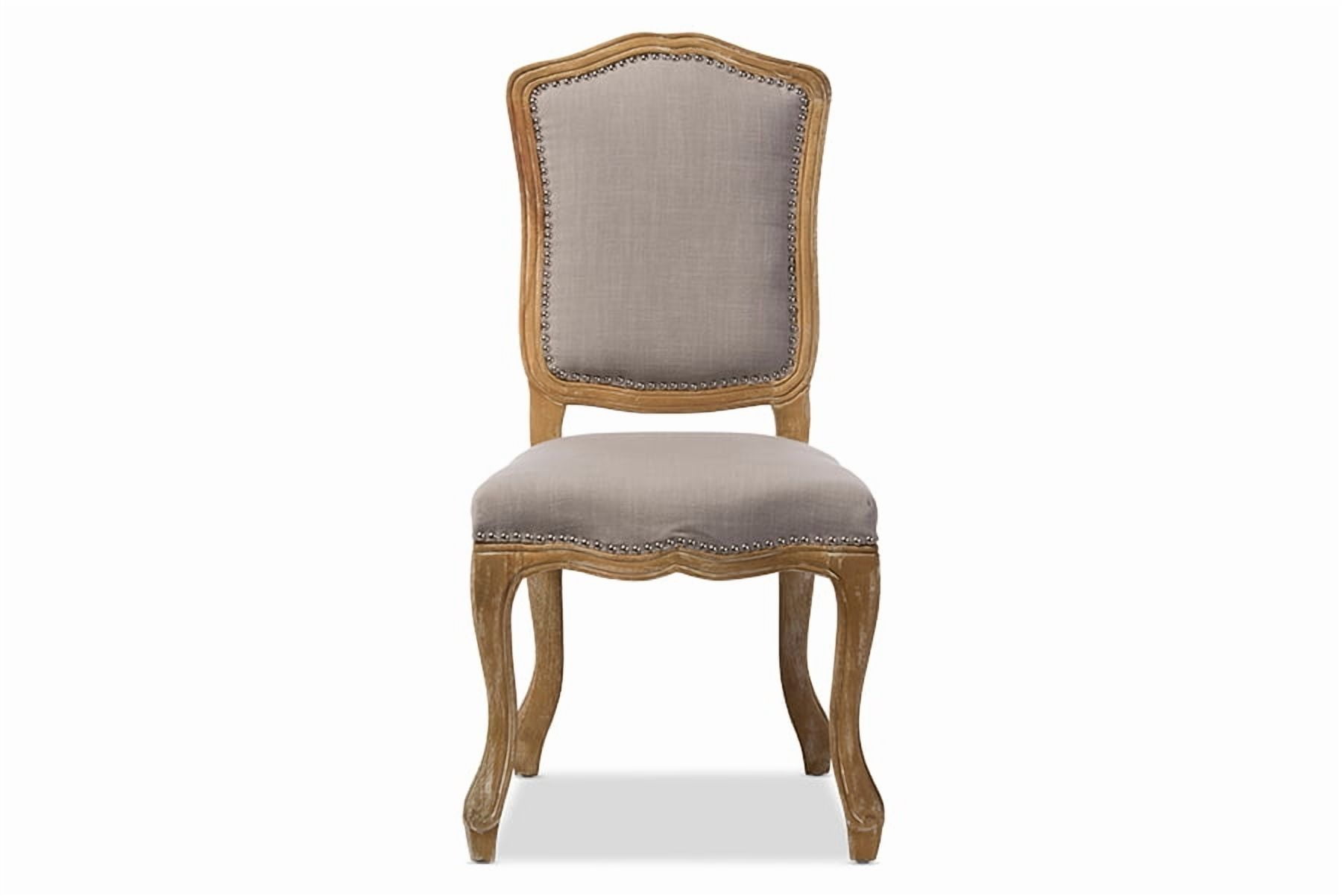 A delightful dining chair with a beige linen seat and back with pin striped reverse. The carved wooden frame and legs have a vintage patina and studded detailing. These classic upholstered dining chair adds a sense of occasion to family dining. When we visualize a typically French chair, this is it! A subtle weathered oak effect finish and flared cabriole legs hint at Gallic tradition, resulting in a French farmhouse feel. This dining side chair reminds us of vintage French dressmakers mannequins – with its beautiful fabric cover, wooden frame and beautiful form. Upholstered with a beige linen cotton material on its weathered oak frame, this chair would sit perfectly in a French chic dining room or stylishly neutral lounge. Features: French country cottage style dining side chair Upholstered in beige linen fabric Made from sustainably sourced oak with a lovely weathered finish Padded with CA TB117 fire retardant foam Fully assembled