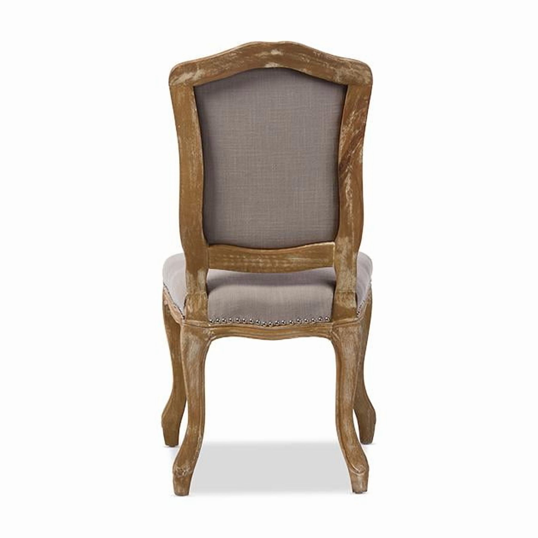 French country cottage style dining side chair Upholstered in beige linen fabric Made from sustainably sourced oak with a lovely weathered finish Padded with CA TB117 fire retardant foam Fully assembled
