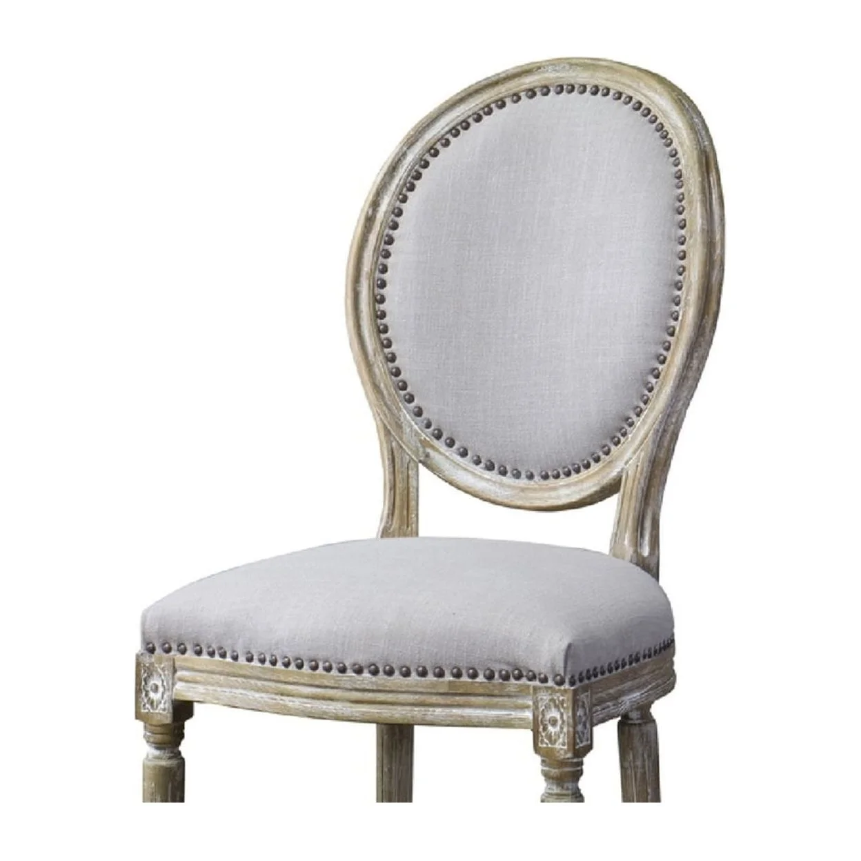Traditional French accent chair Versatile, neutral beige linen Birch frame with distressed, antiqued finish including white streaking Polyurethane foam cushions Bronze nail head trim
