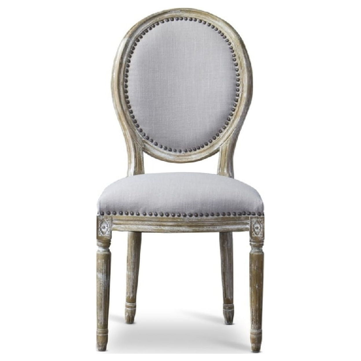 Baxton Studio Clairette Wood Traditional French Accent Chair-Round Revealing outstanding attention to detail via its white-streaked, distressed antiqued finish, our Clairette Wood Traditional French Accent Chair-Round will garner enthusiastic applause from discount-minded decorating divas. This accent chair pairs a genuine birch frame with a graceful oval chair back. Highly versatile neutral beige linen is adorned with bronze nail-head trim. Foam cushions provide comfort while a repeated floret motif heightens the elegance factor. Oh la . Specifications: TraditionalFrench accent chair Versatile, neutral beige linen Birch frame with distressed, antiqued finish including white streaking Polyurethane foam cushions Bronze nail head trim