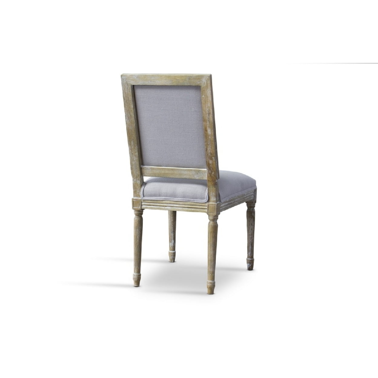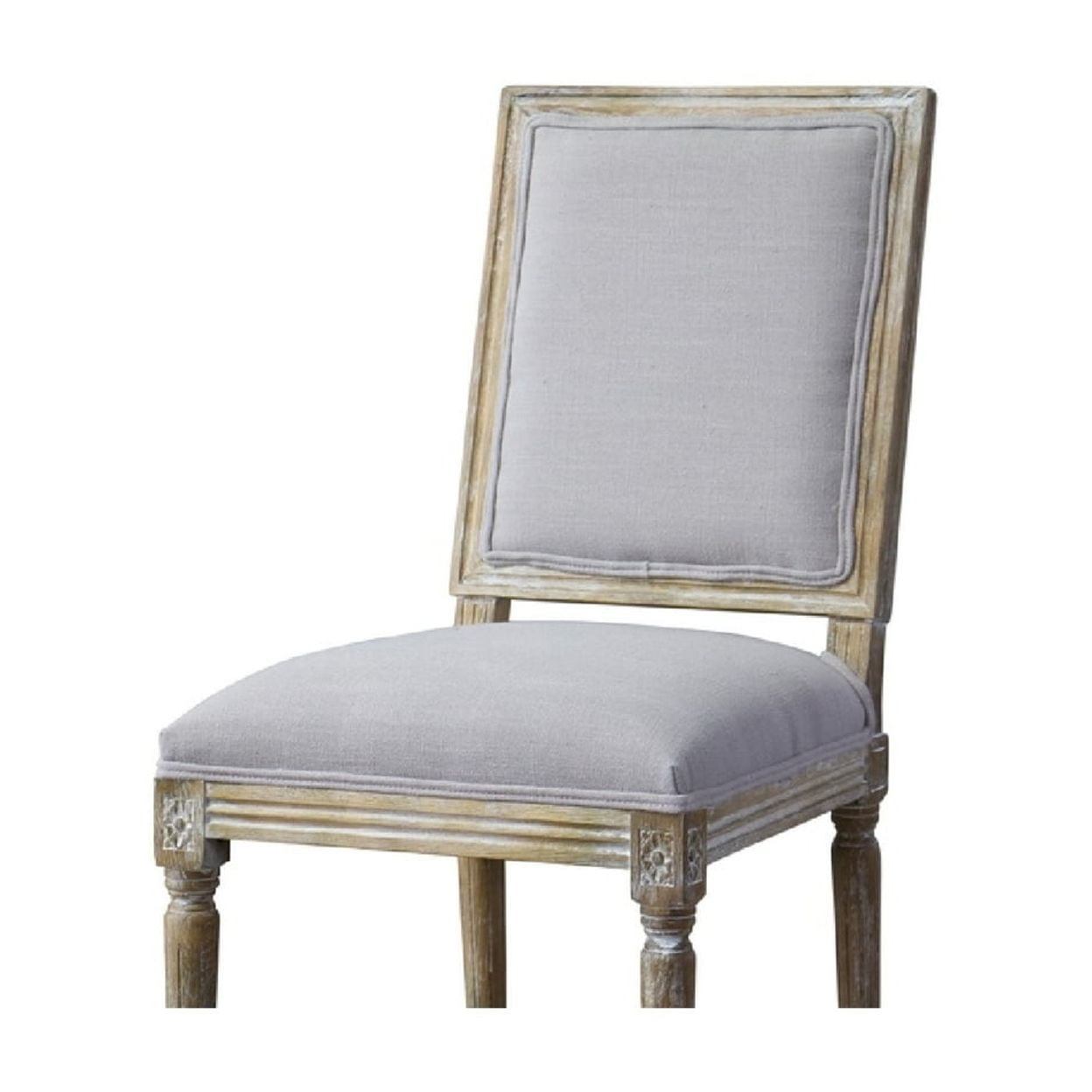 Traditional French accent chair Versatile, neutral beige linen Birch frame with distressed, antiqued finish including white streaking Polyurethane foam cushions