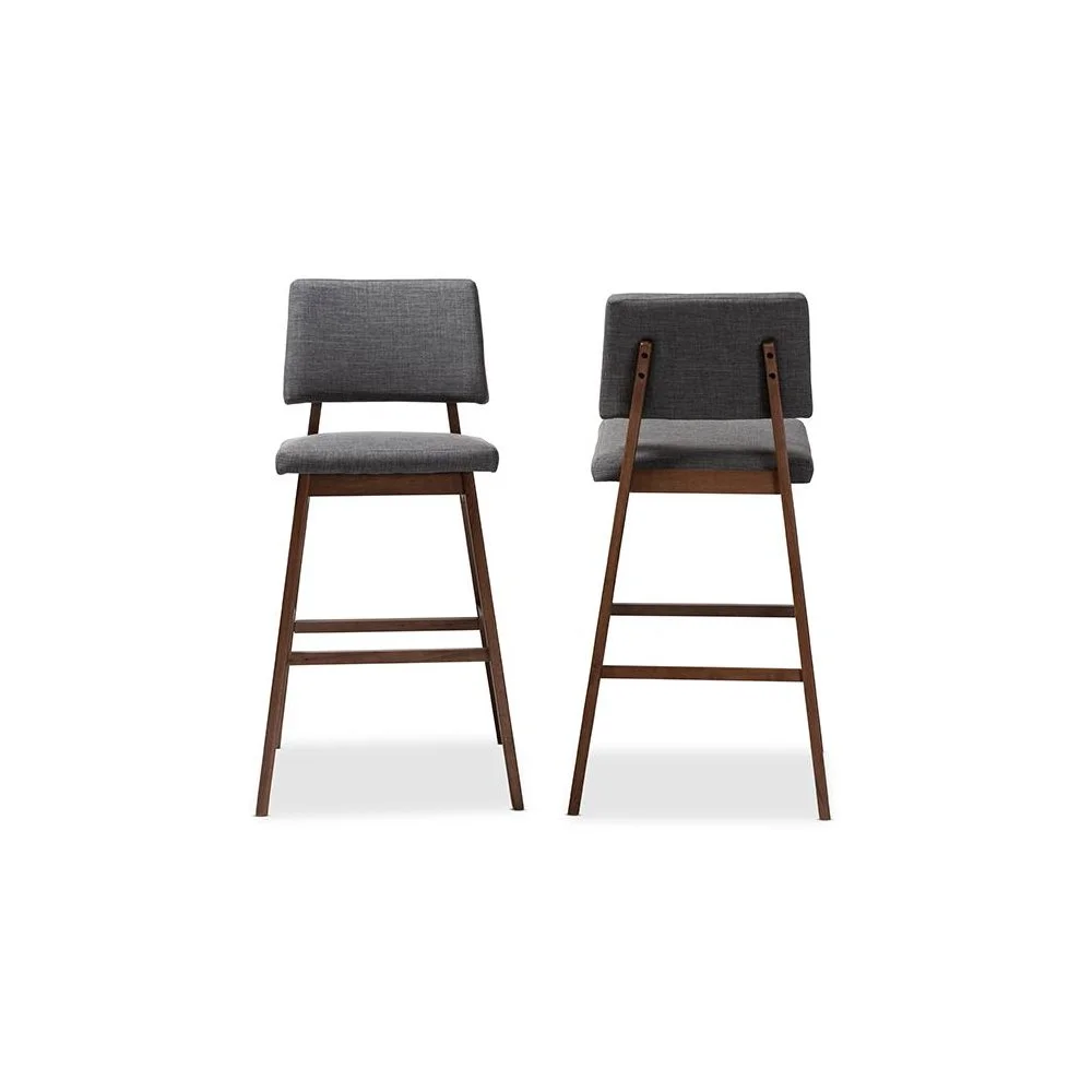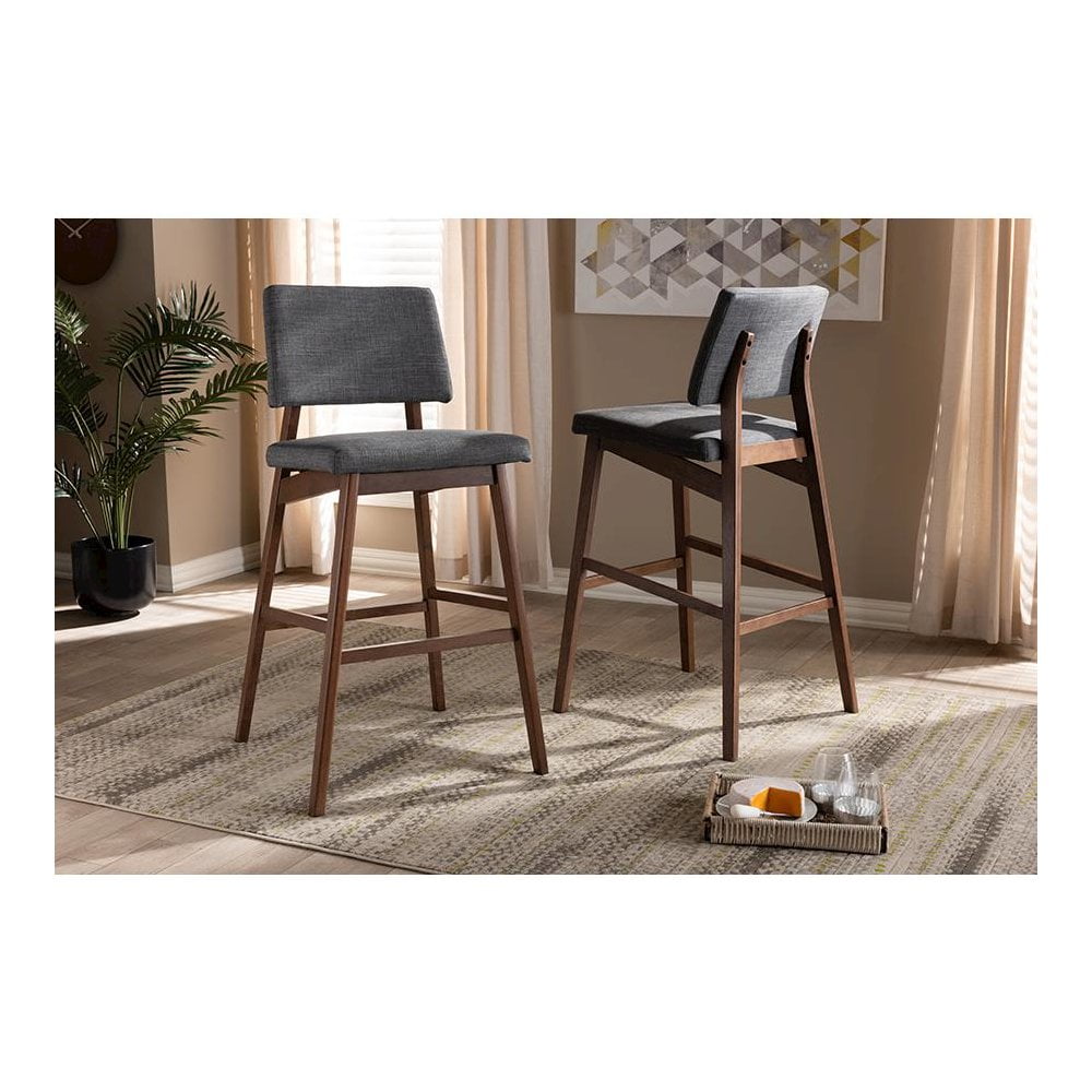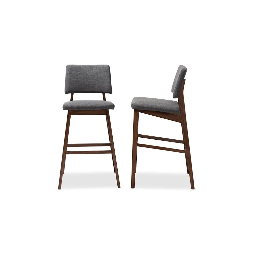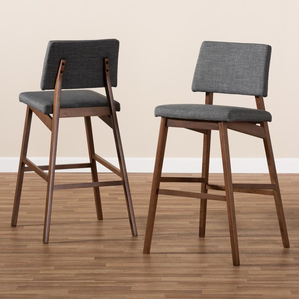 Baxton Studio Colton Mid-Century Modern Dark Gray Fabric Upholstered and Walnut-Finished Wood Bar Stool Set of 2 Give your bar space a dose of retro style with the Colton bar stool. Constructed from solid rubberwood, the Colton showcases a rich walnut brown finish. The seat and back are upholstered in a durable neutral polyester fabric that is easy to coordinate with any color palette. The slanted back and built-in footrest offer lasting comfort as you enjoy a cocktail, or two. Inspired by mid-century modern design, the Colton features long, angled legs. Ideal for both a kitchen and bar setting, the Colton is easy to coordinate with a wide range of decor schemes. The Colton bar stool is made in Malaysia and requires assembly. Specifications: Mid-century modern bar stool Constructed from rubberwood Walnut brown finish Polyester fabric upholstery with foam padding Foot rest Assembly required Made in Malaysia