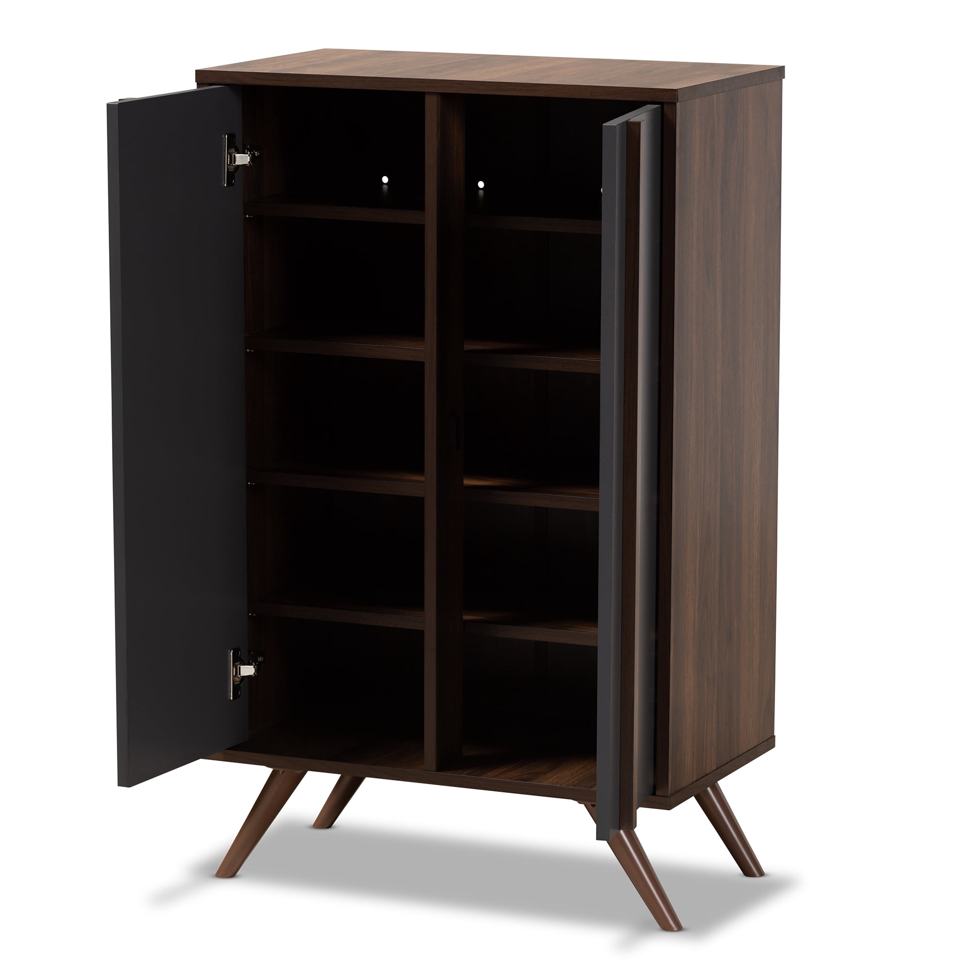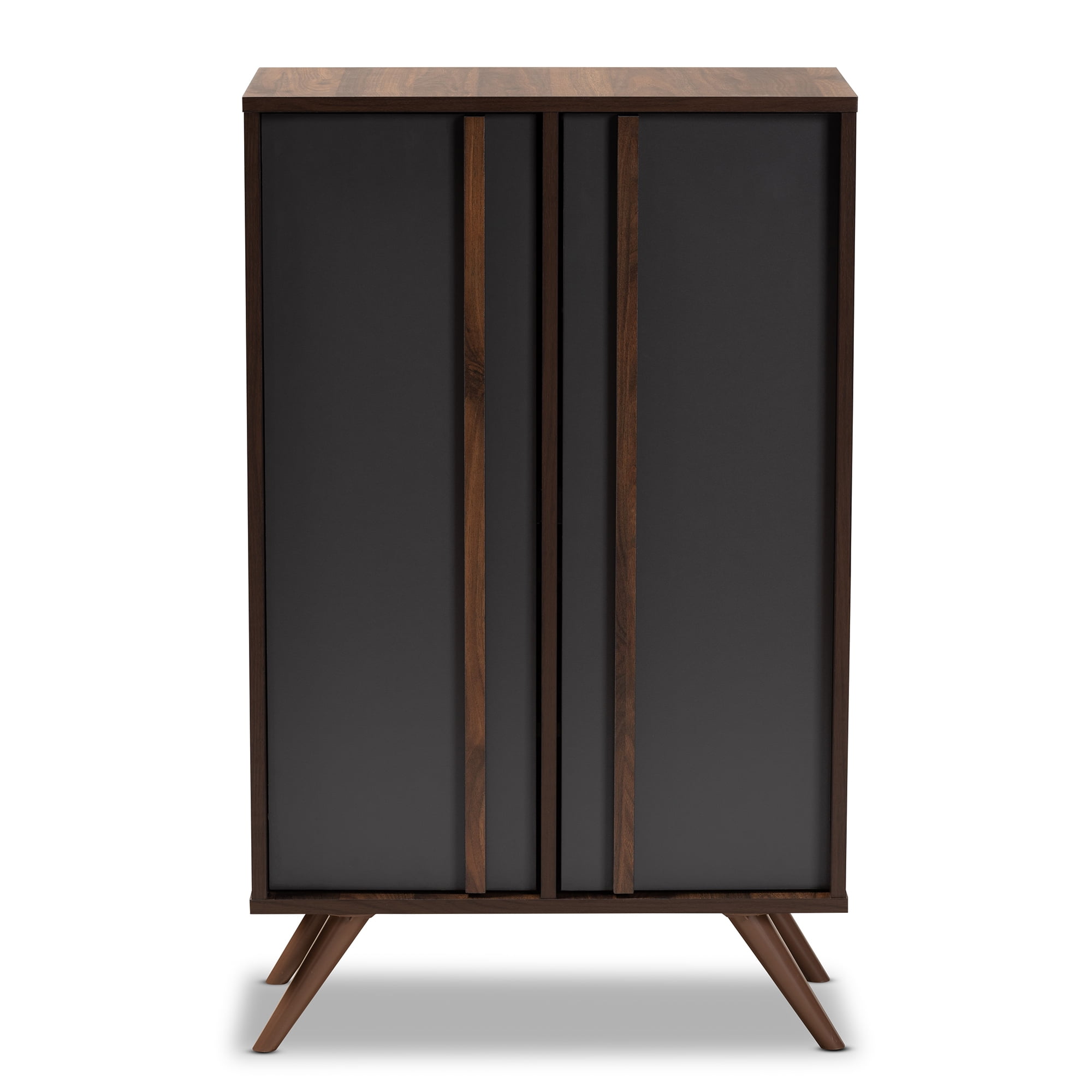 Baxton Studio Contemporary 2-Door Shoe Cabinet, Grey/Walnut, 57.30 lbs Constructed from engineered wood for durability Two-tone grey and walnut brown finish adds a modern touch Five shelves provide storage for up to 15 pairs of shoes Brown PVC handles for easy access Cut-outs on the back provide ventilation and deter mold growth Splayed legs offer a stylish retro touch Assembly required for setup