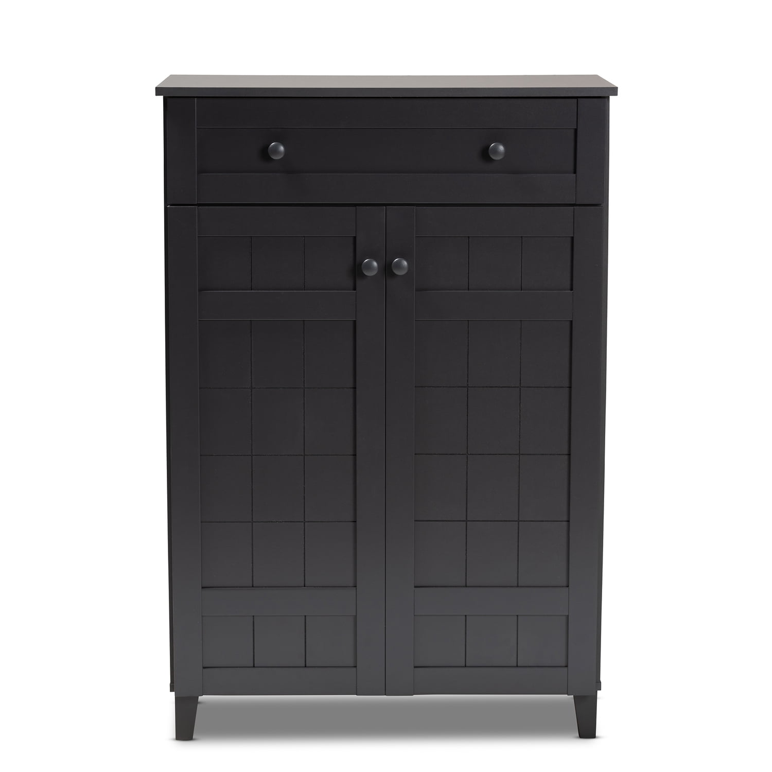 Baxton Studio Contemporary 5-Shelf Shoe Storage Cabinet with Drawer, Wood Dark Gray, 72 lb Classic design enhances your entryway while providing ample storage space Two doors conceal four fixed shelves, accommodating multiple pairs of adult and children’s shoes One spacious drawer offers additional storage for extra shoelaces and miscellaneous items Recessed paneling on doors and drawers adds visual depth to your space Tapered legs provide a refined style and elevate the cabinet to deter dust buildup