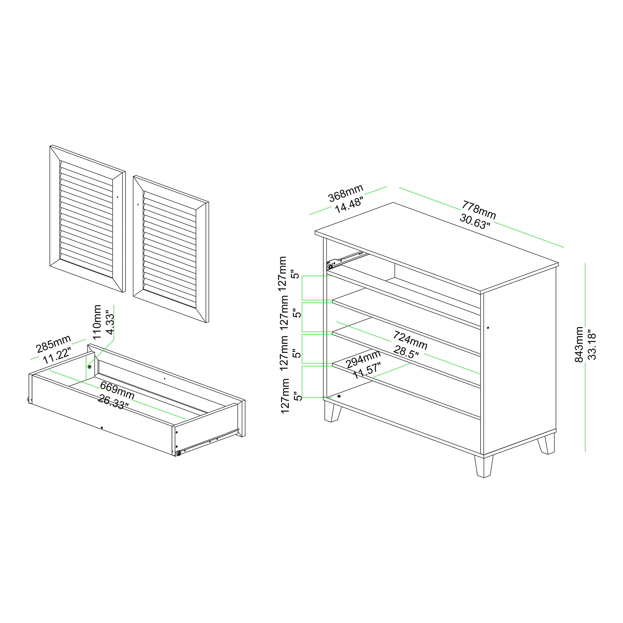 Slatted wood doors Constructed from engineered wood One (1) drawer Four (4) shelves provide space for 12 pairs of shoes, measuring below 12.75″ in-depth Assembly required Product Weight: 58.4 Pound Package Weight: 62.8 Pound Overall Dimensions: 33.20″ High x 30.60″ Wide x 14.50″ Deep; Drawer Dimensions: 26.30″ Wide x 11.20″ Deep x 4.30″ High; Shelf Dimensions: 28.50″ Wide x 11.60″ Deep x 5.00″ High; Legs: 3.50″ High; Product Color: Oak Brown/Dark Brown Product Composition: MDF/Solid Wood.