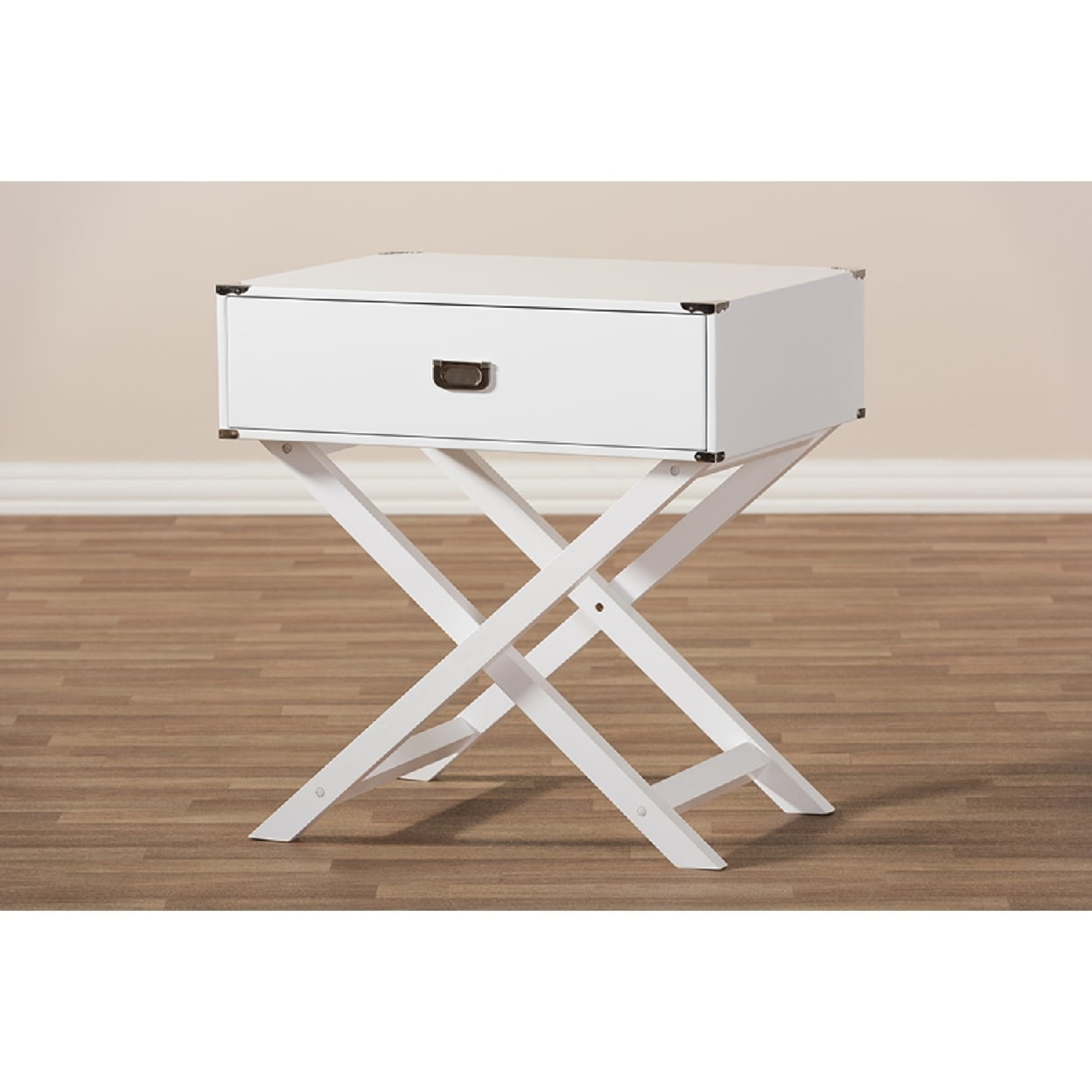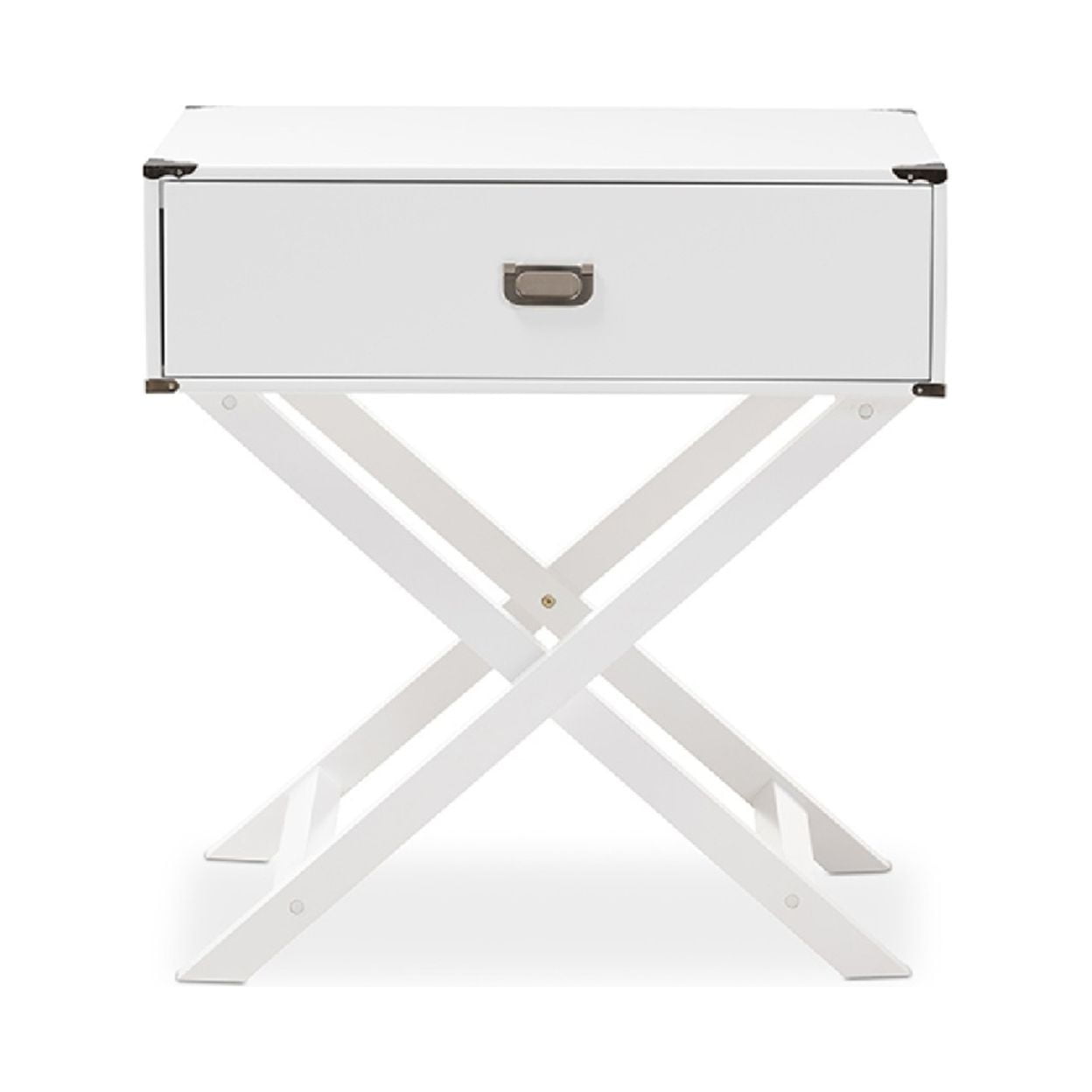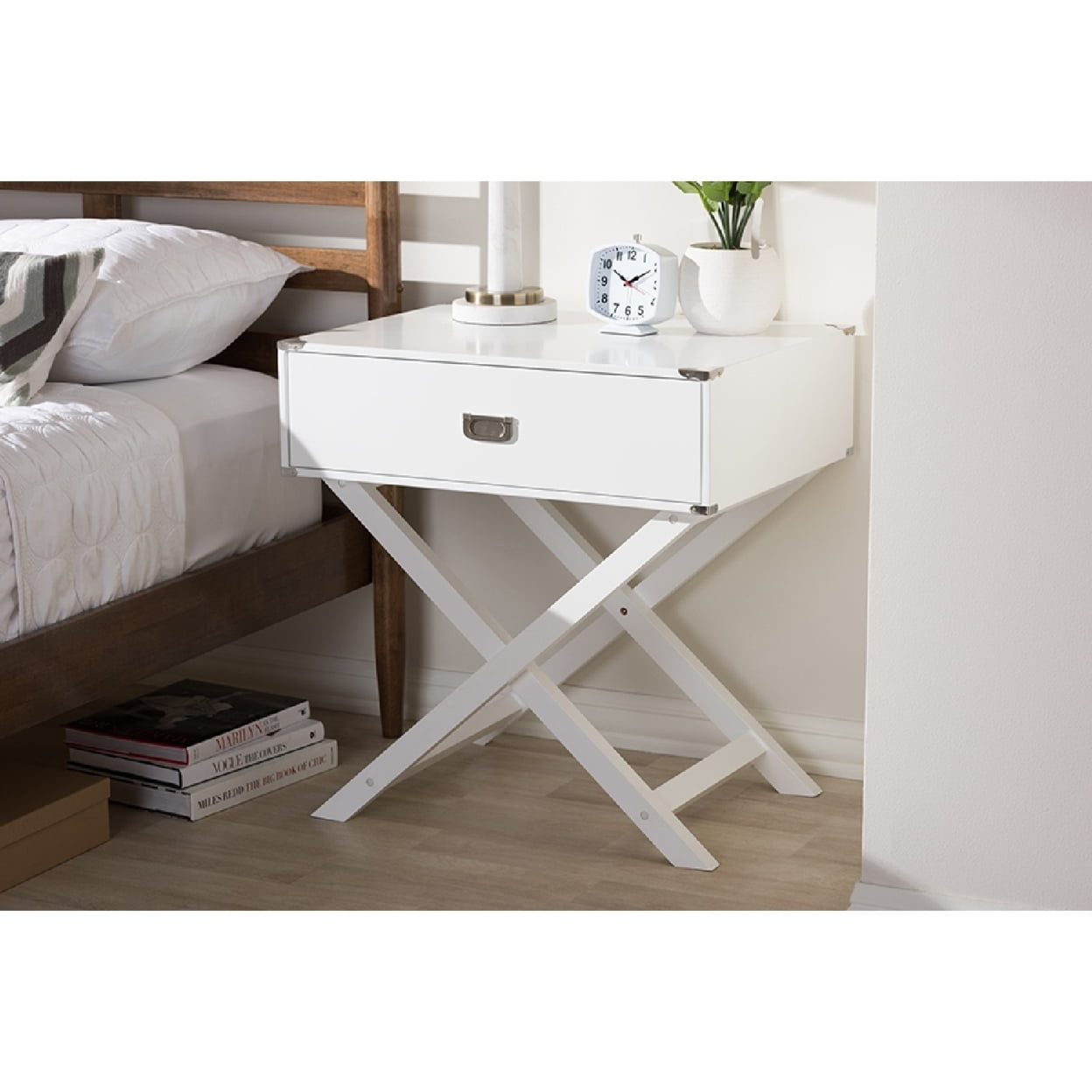 Baxton Studio Curtice Modern And Contemporary White 1-Drawer Wooden Bedside Table Display your novels in style by your bed and within reach by showcasing the wonderful Curtice bedside table. High-density medium density board base for a sturdy and durable quality with a white paint finish for smooth, resilient style. Design features one drawer with a fixed x- base for a lamp, books and bedroom articles. Metal brackets and handle pulls complete the look of a modern and contemporary style. Made in China, the Curtice nightstand requires assembly. Specifications: Modern and contemporary bedside table Painted Metal brackets and drawer pulls X base legs Assembly required Made in China