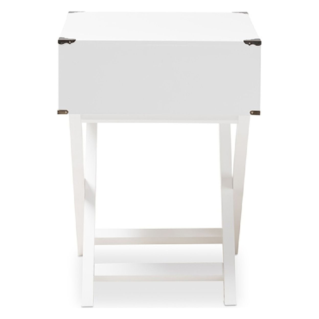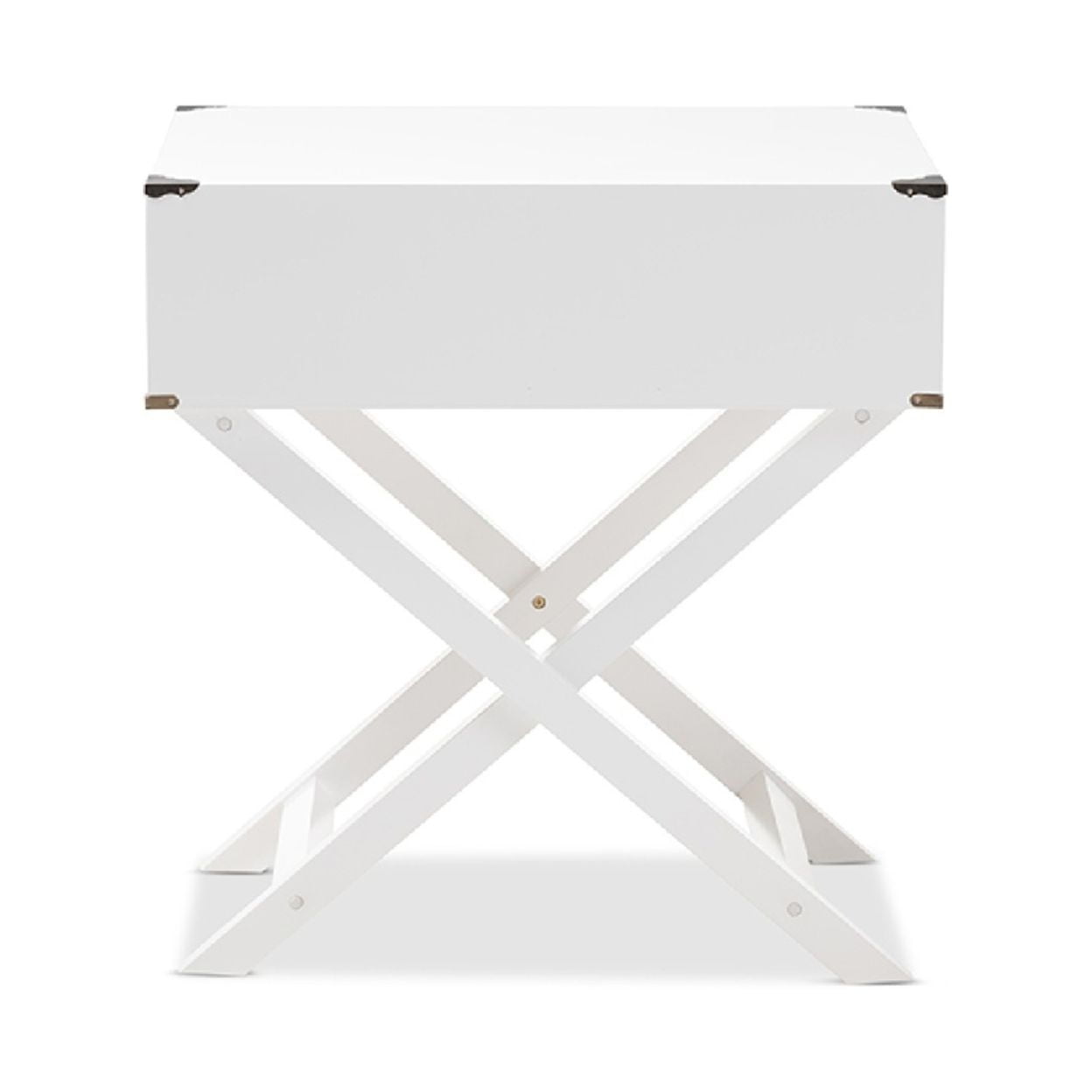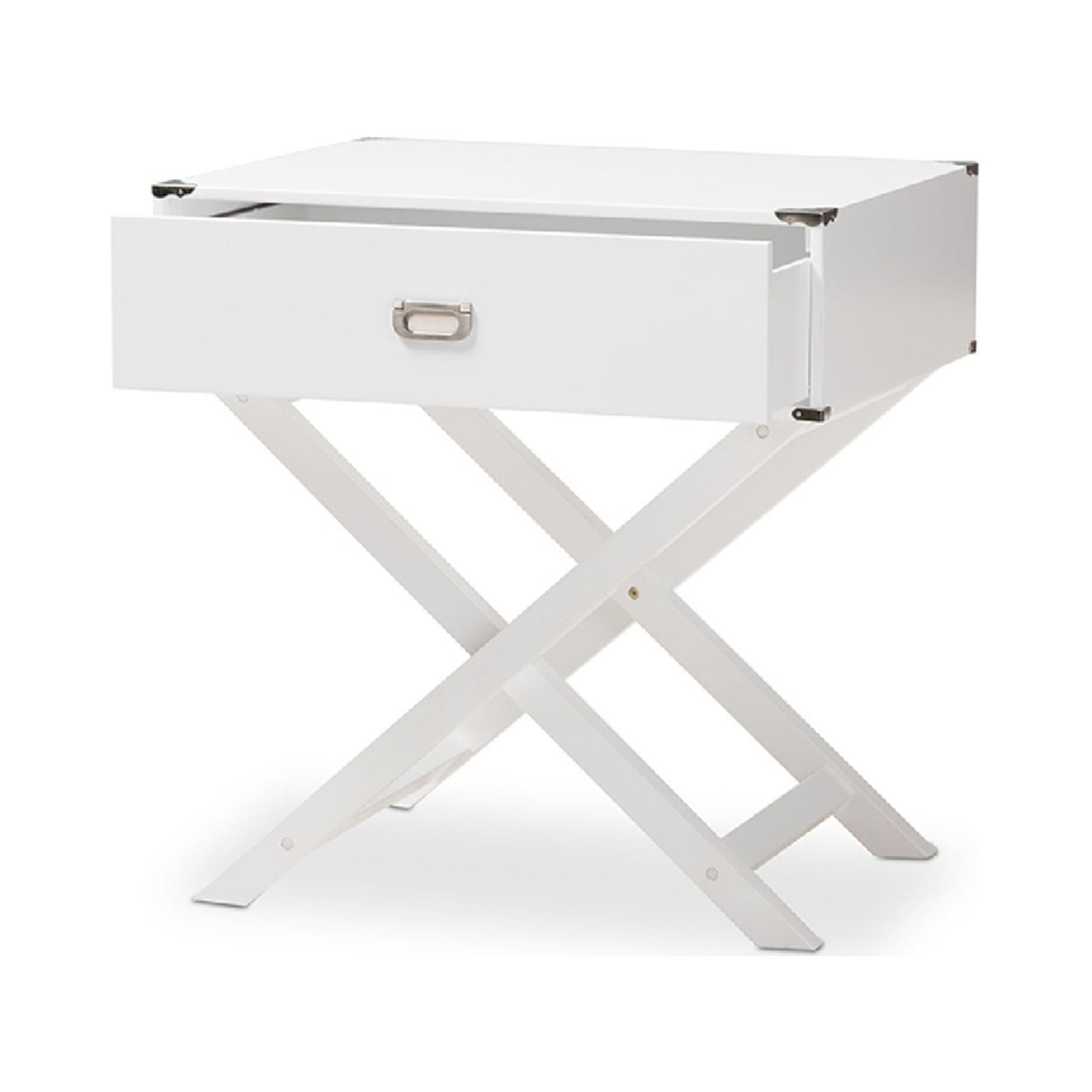 Baxton Studio Curtice Modern And Contemporary White 1-Drawer Wooden Bedside Table Display your novels in style by your bed and within reach by showcasing the wonderful Curtice bedside table. High-density medium density board base for a sturdy and durable quality with a white paint finish for smooth, resilient style. Design features one drawer with a fixed x- base for a lamp, books and bedroom articles. Metal brackets and handle pulls complete the look of a modern and contemporary style. Made in China, the Curtice nightstand requires assembly. Specifications: Modern and contemporary bedside table Painted Metal brackets and drawer pulls X base legs Assembly required Made in China