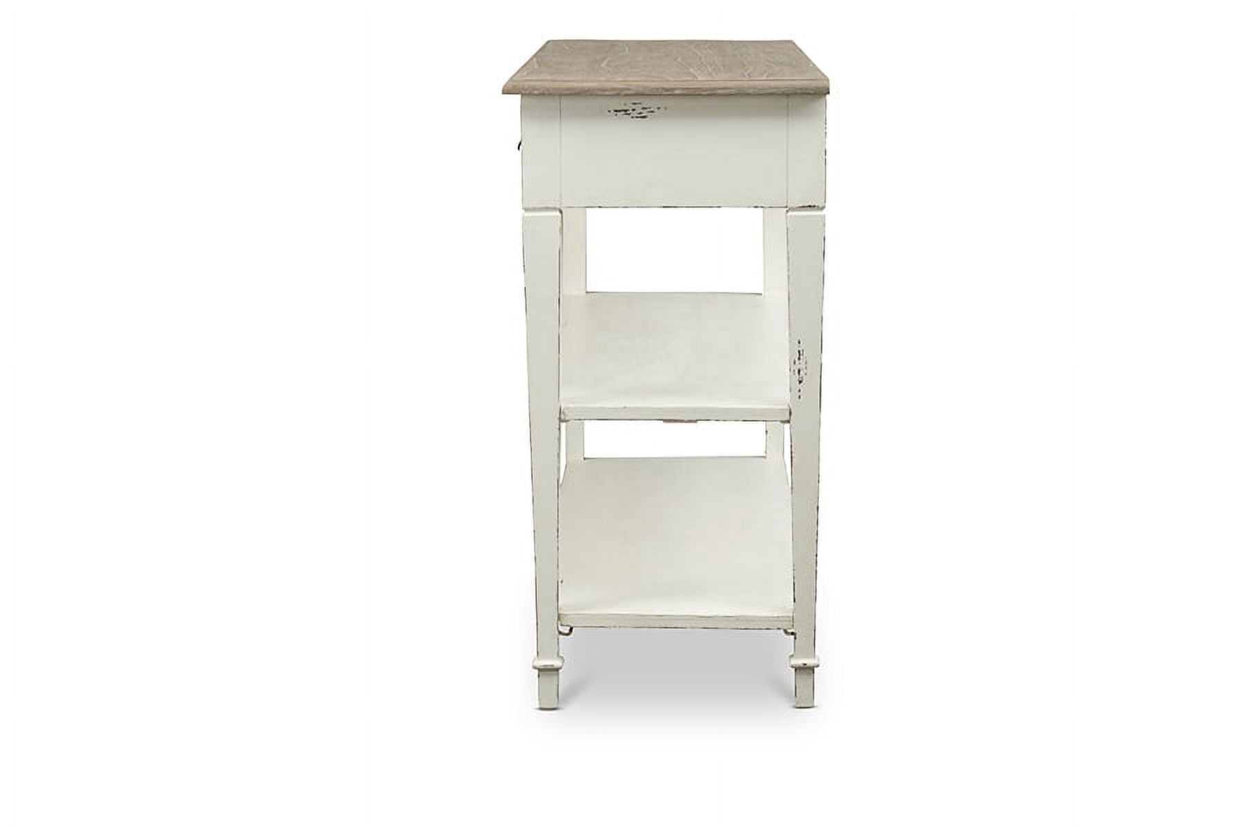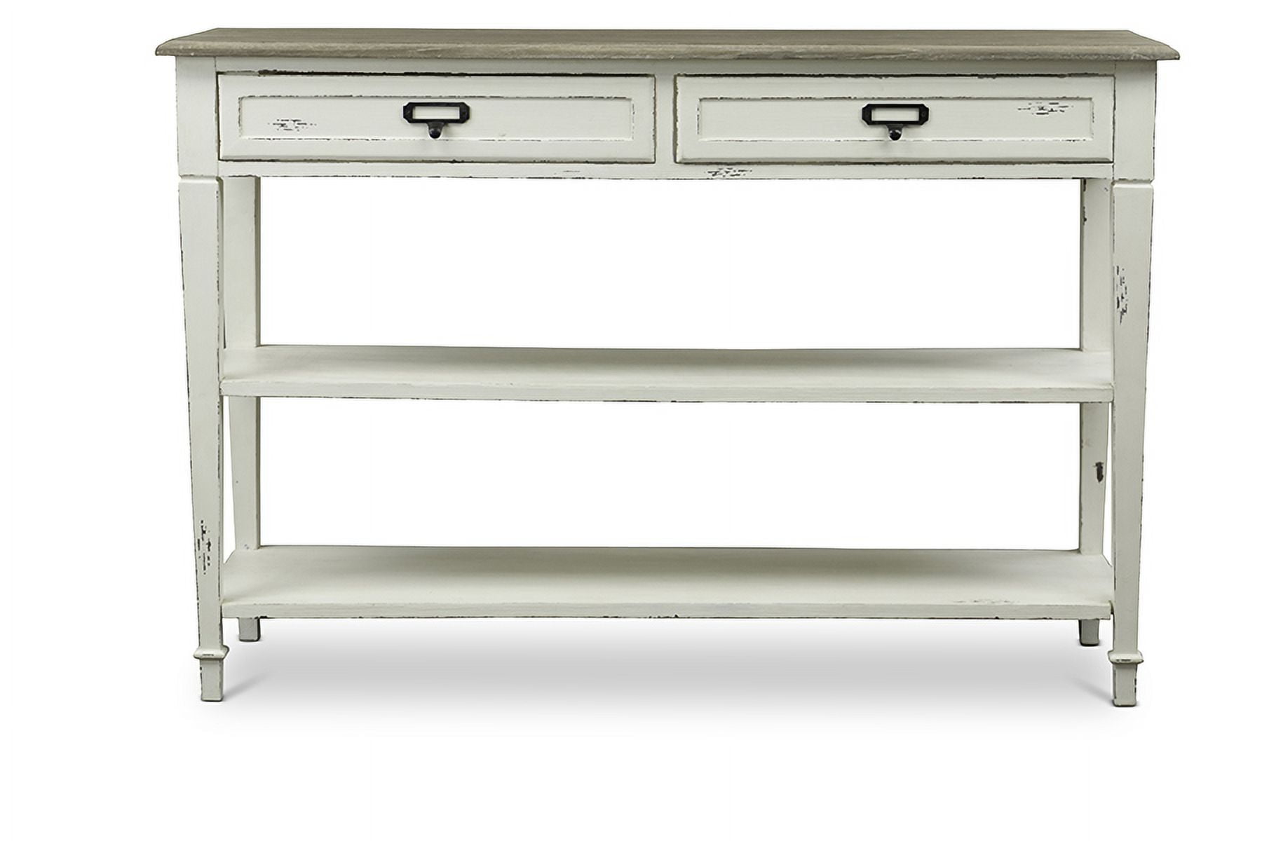 Boasting a white-streaked and distressed finish plus plenty of storage space via two drawers and two shelves, the Baxton Studio Dauphine Traditional French Country Accent Console Table unifies style and functionality. The genuinely crafted mindi-wood top features a white-streaked natural veneer that pairs perfectly with the distressed white finishing that comprises the remainder of this console table. Black metal drawer handles offer an attractive contrast. Superb value in a discount-furniture item.