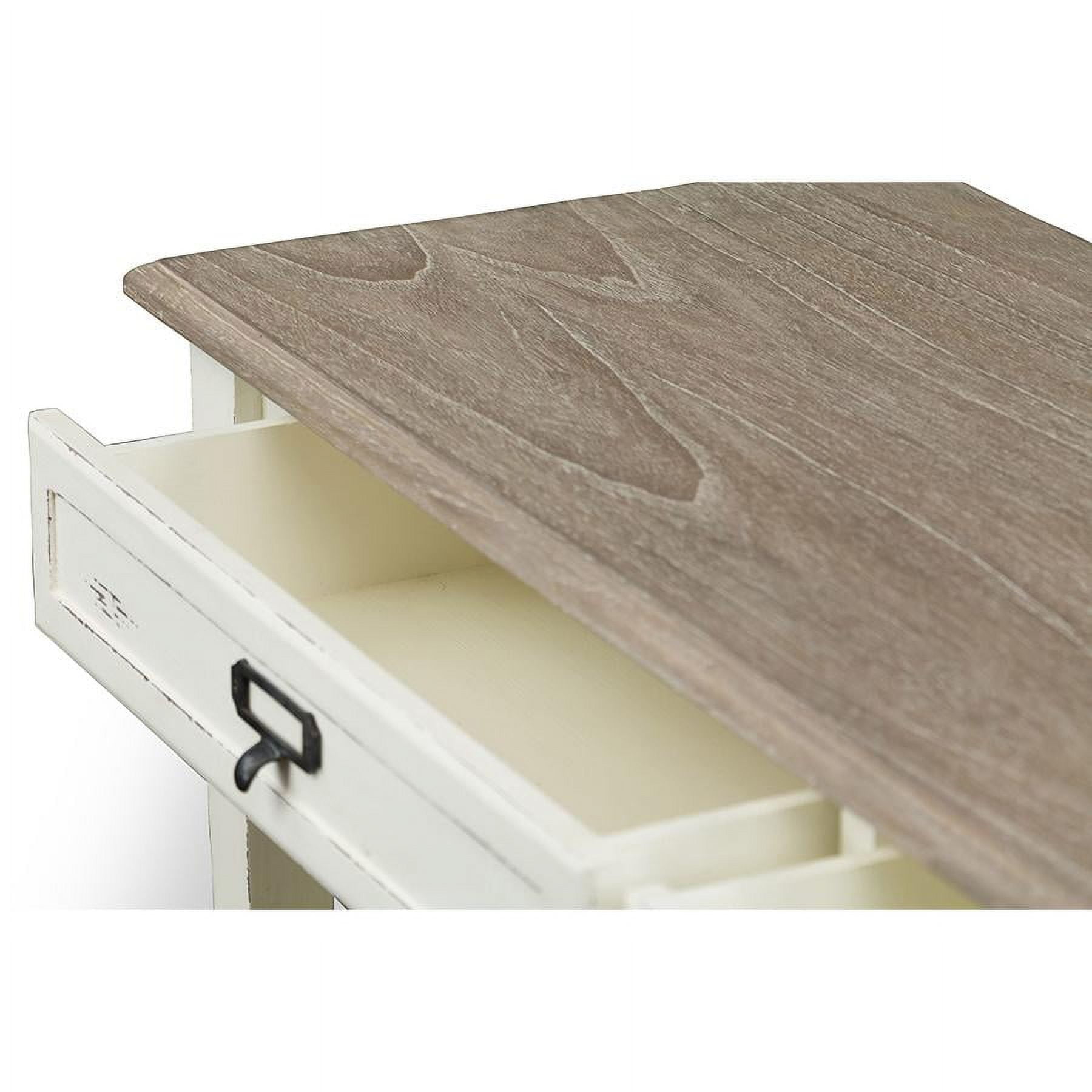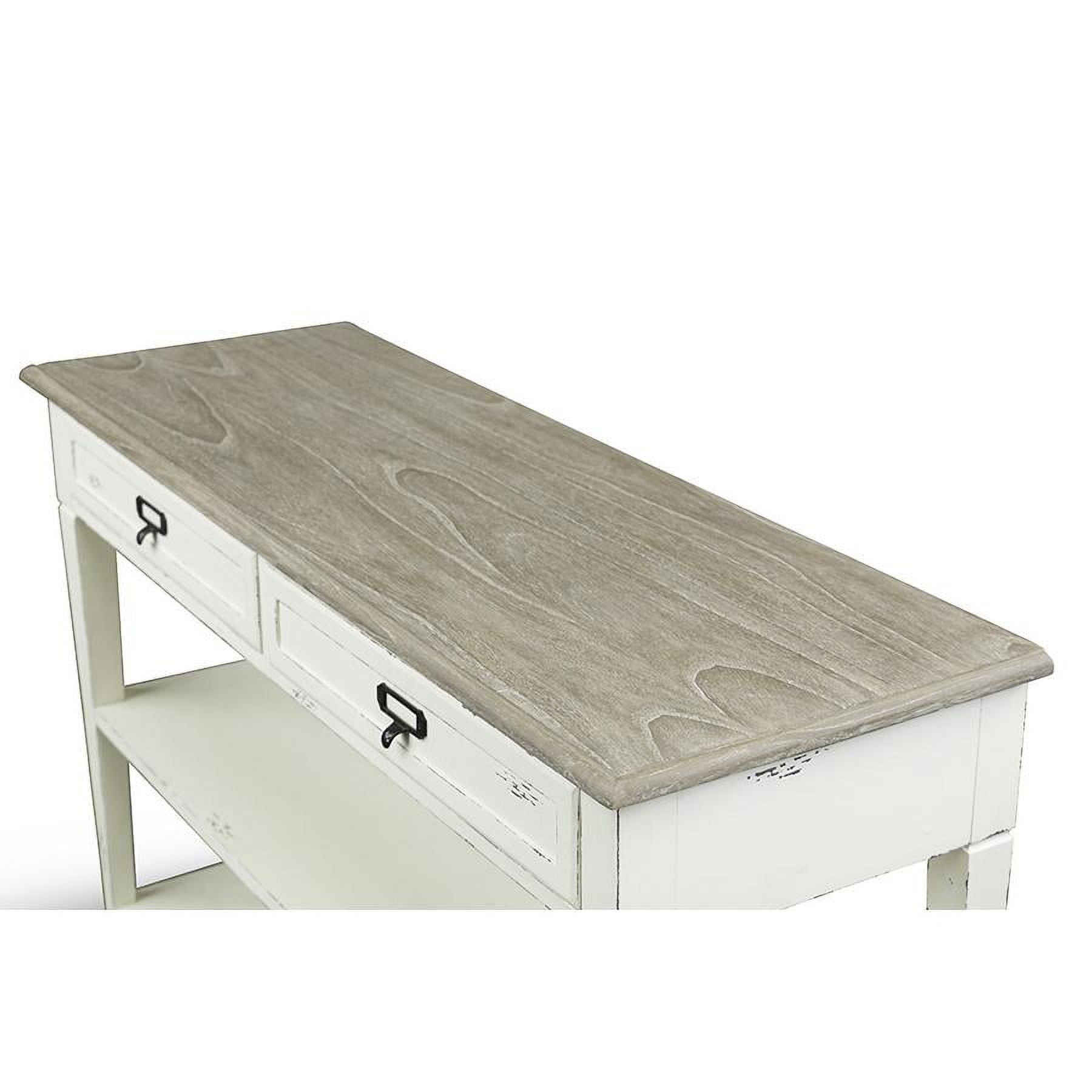 Traditional French accent console table Two drawers and two shelves provide functional storage spaces Constructed with MDF frame in distressed white finishing Mindi wooden top in natural veneer finishing with white streaking Metal drawer pulling handles in black finishing
