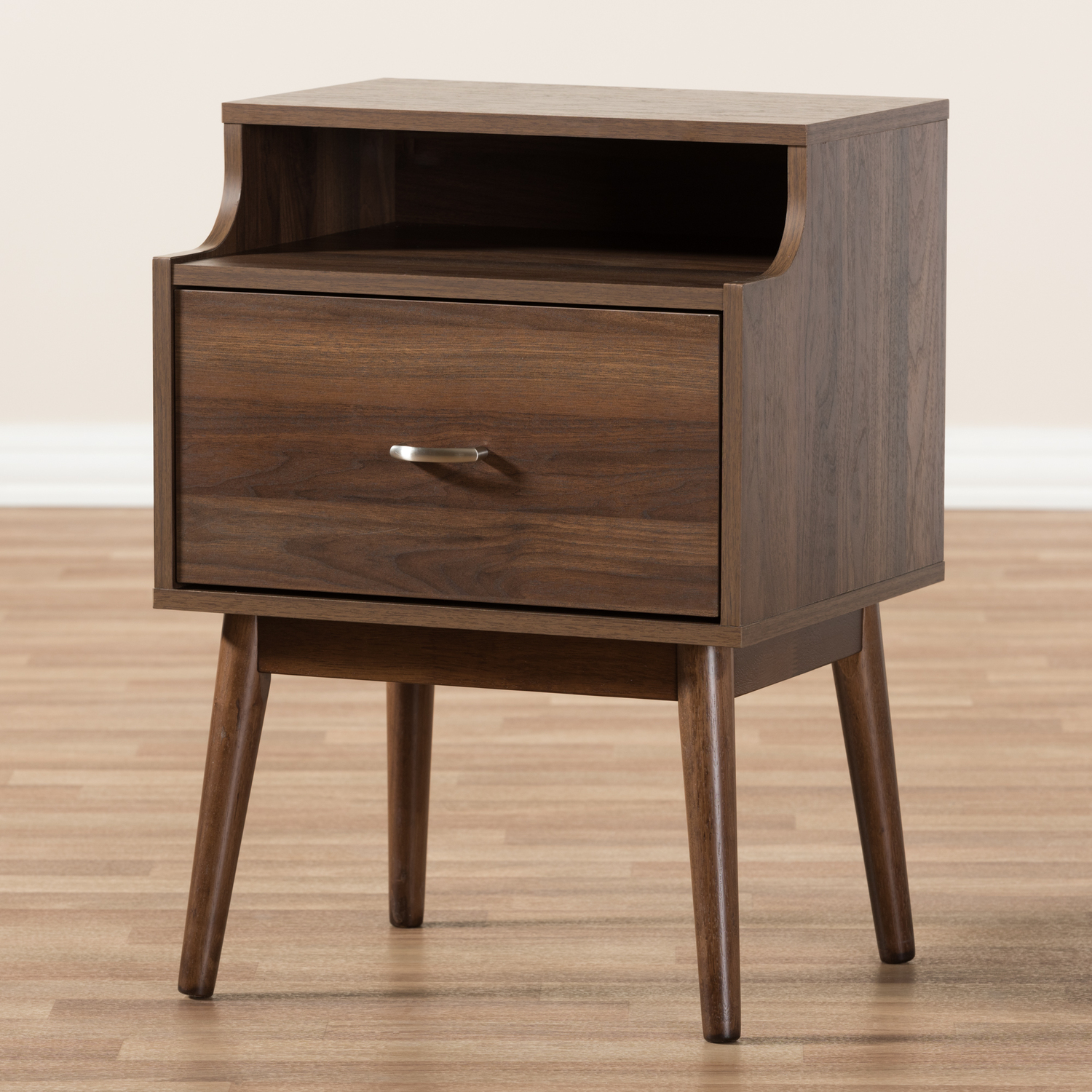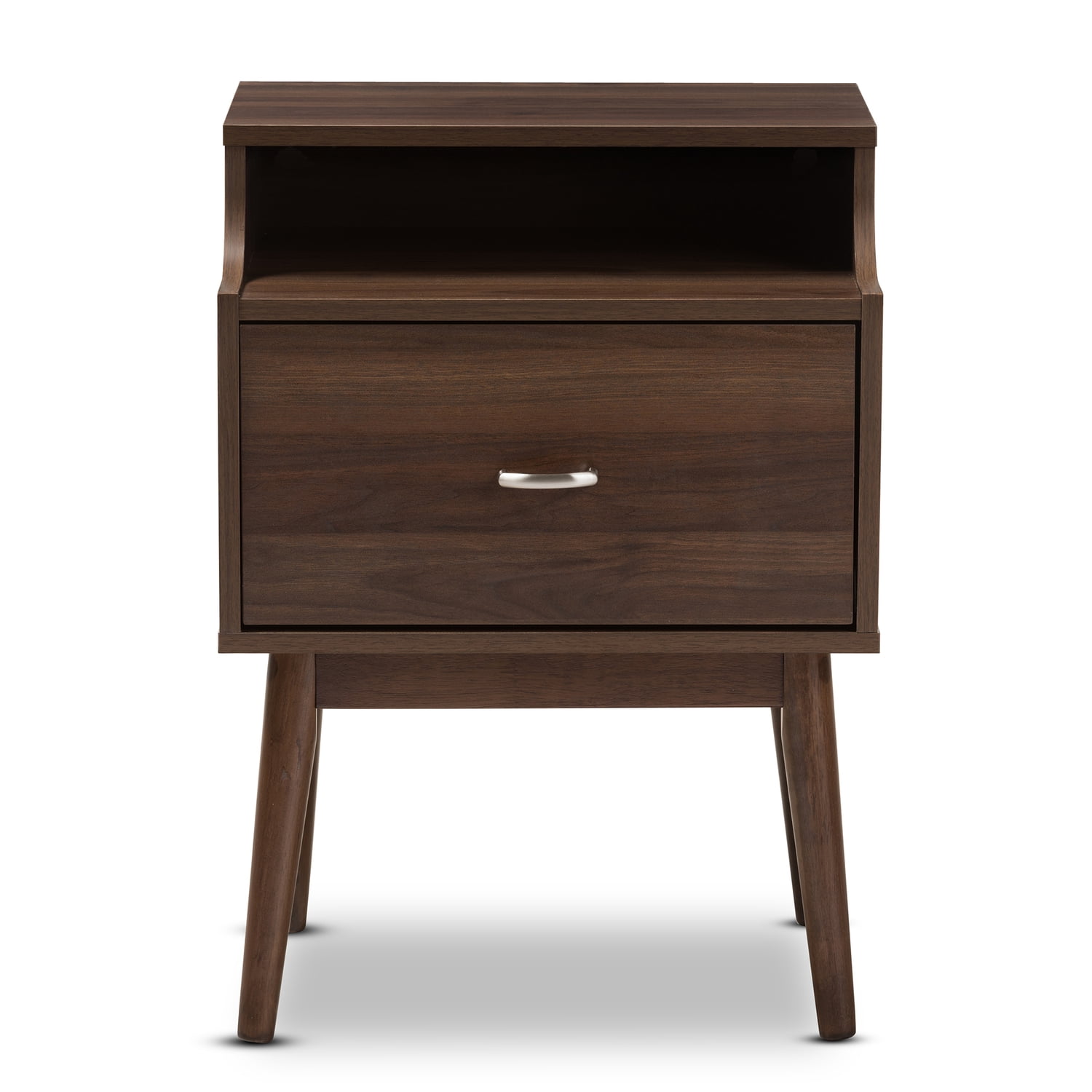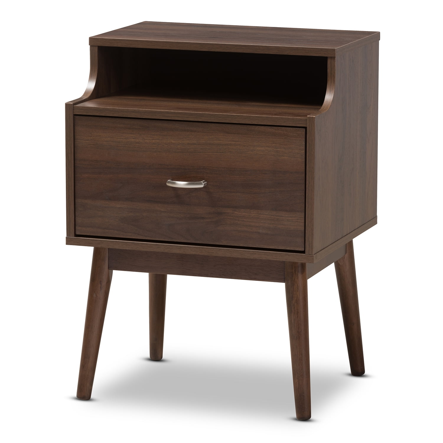 Baxton Studio Disa Mid-Century Modern Walnut Brown Finished Nightstand Robust design with minimalist detailing for a handsome form that balances wood finishing with modernism, the Disa 1-drawer nightstand complements a range of interior aesthetics from colonial to contemporary for versatile styling. Constructed of engineered wood and MDF boards for sturdiness, the nightstand features one pull-out drawer on metal runners for a smooth movement for your clothes and linens. Finished in walnut brown veneer for an alluring woodgrain, the Disa is accented with sleek metal handles for simple functionality with contemporary looks. Solid wood angled legs in a tapered design, for a Scandinavian touch in your dcor hold up the Disa sturdily. Made in Malaysia, the Disa requires assembly. Specifications: Mid-century modern nightstand Walnut wood finishing One drawer Angled solid wood tapered legs Metal handles Assembly required Made in Malaysia