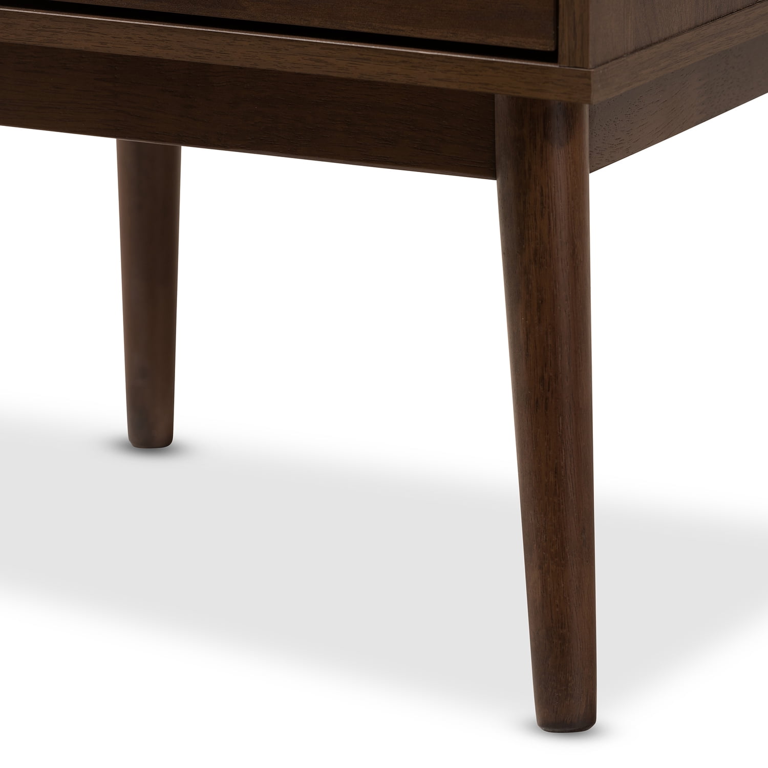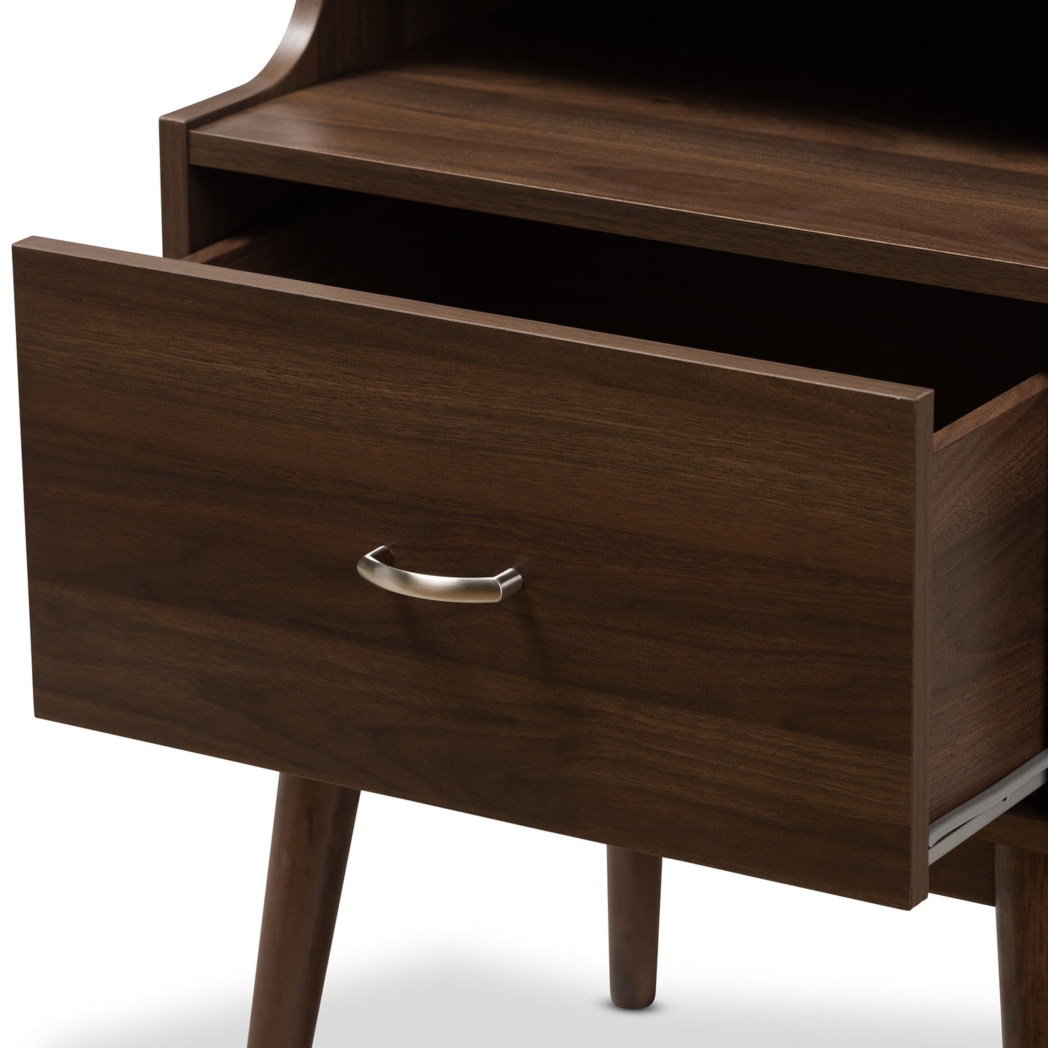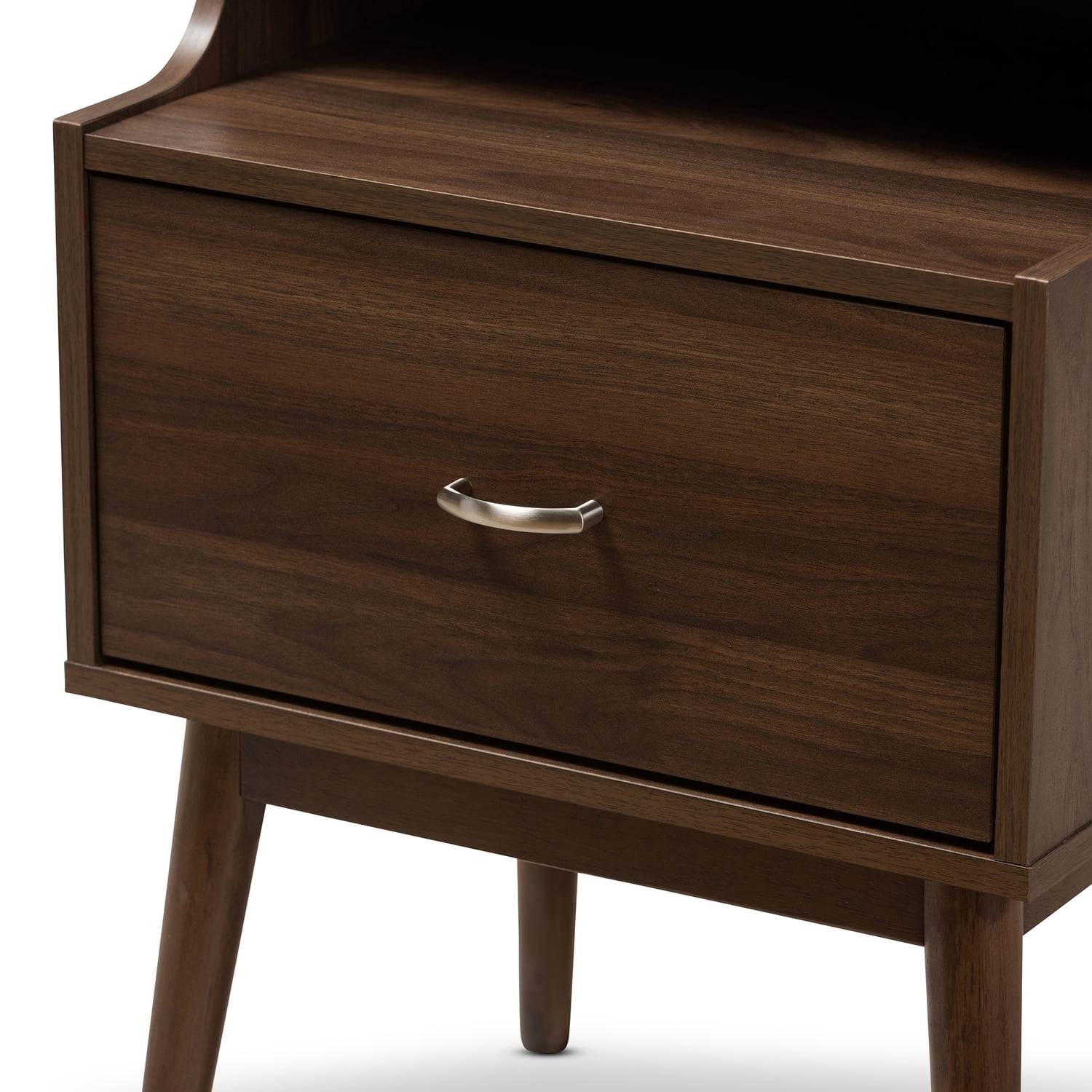 Mid-century modern nightstand Walnut wood finishing One drawer Angled solid wood tapered legs Metal handles Assembly required Made in Malaysia