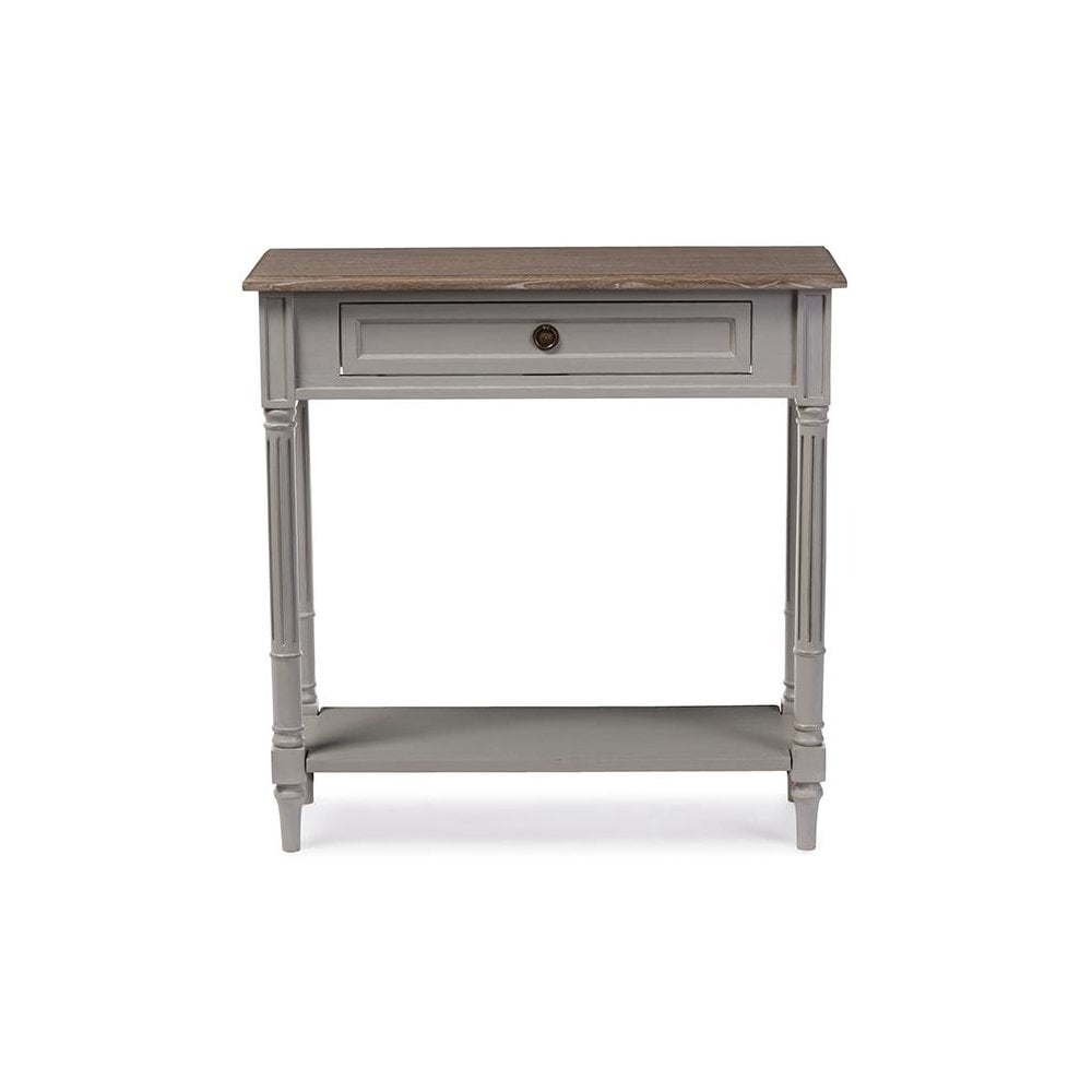 Rustic, country-farmhouse pieces like the Edouard console table work to create a homely atmosphere. Crafted from richly textured reclaimed mindi wood in oak finishing, the lower part of the table is hand-painted in a fresh shade of light gray with a distressed effect to give it that beautiful timeworn look while the table top remains as weathered oak finishing for a two-tone effect. Its solid top has an enduring quality, with beveled edges for extra detail and a bleached finish for added rusticity. Place at the entryway, living room or even in a bedroom for a cute and compact look. You could use it as a petite console table in a hallway or kitchen, storing away everyday necessities in its single drawer with its antiqued brass-effect handles. Thanks to the stately look of its fluted legs, the Edouard will add a dignified air to any interior. Features: Finish: Weathered Oak and Light Gray Material: Wood French provincial style Fluted columns legs Beveled-edge top Antiqued brass handles One drawer and one open shelf Specifications: Overall Product Dimensions: 31.2″ H x 31.2″ W x 11.7″ D Drawer Dimensions: 3.9″ H x 21.45″ W x 8.97″ D Shelf Dimensions: 0.7″ H x 29.64″ W x 10.8″ D Overall Product Weight: 29 lbs