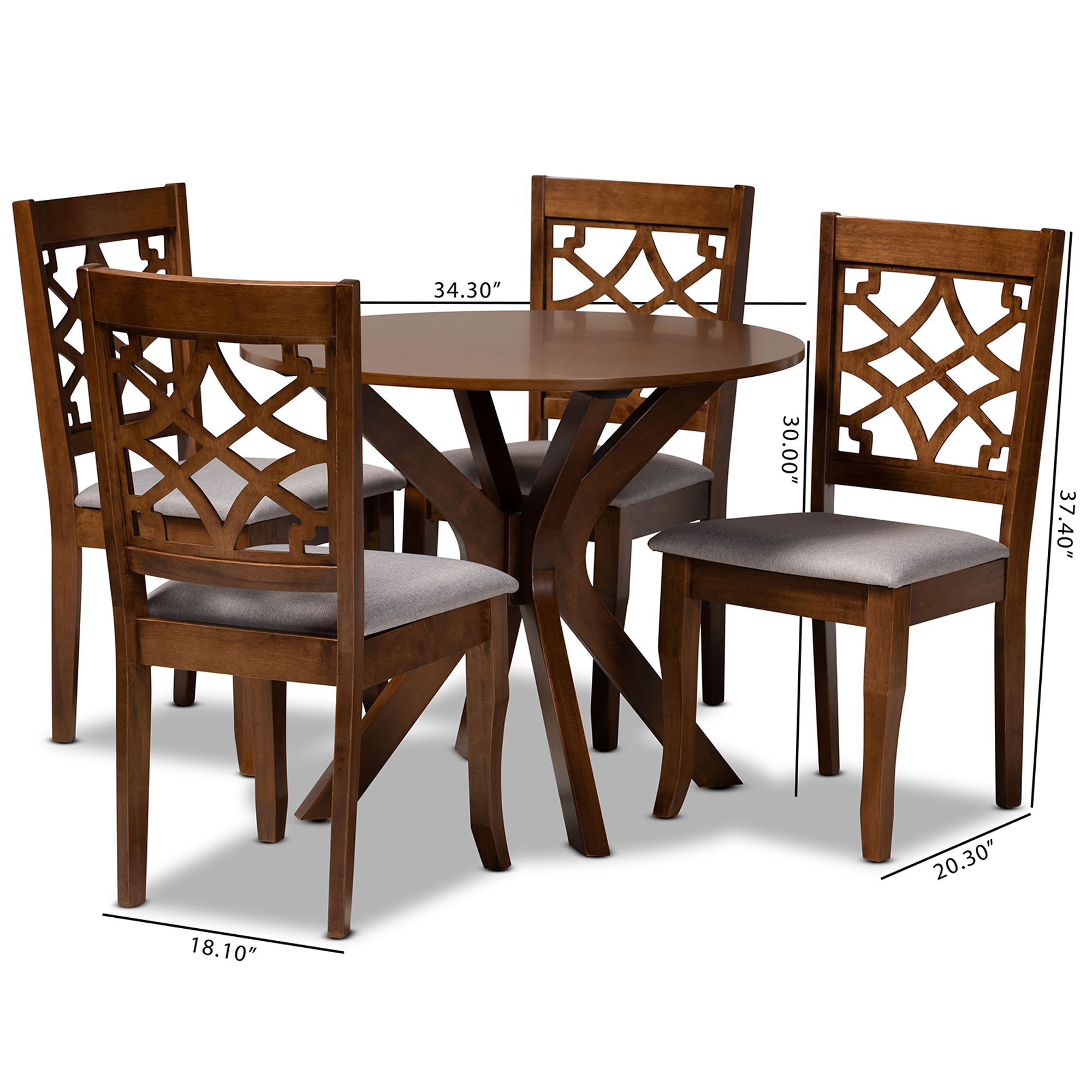 Elevate your dining space with the contemporary style of the Elena dining set. Made in Malaysia, the Elena includes four dining chairs and one table constructed from sturdy wood and finished in a warm walnut brown. Each chair is fitted with a foam padded cushion upholstered in smooth grey fabric and features a unique cut-out design on its back. Requiring assembly, the circular tabletop allows ample elbow room for each member of the table. Perfect for both casual and formal occasions, the Elena dining set easily modernizes any home. Table Dimensions: 29.9″ high x 35.4″ wide x 35.4″ deep; Legs: 29.1″ high; Chair Dimensions: 37.4″ High x 18.1″ Wide x 20.3″ Deep; Seating Dimensions: 17.9″ High (from Floor) x 18.7″ Wide x 15.7″ Deep; Back: 19.5″ High; Legs: 16.9″ High;