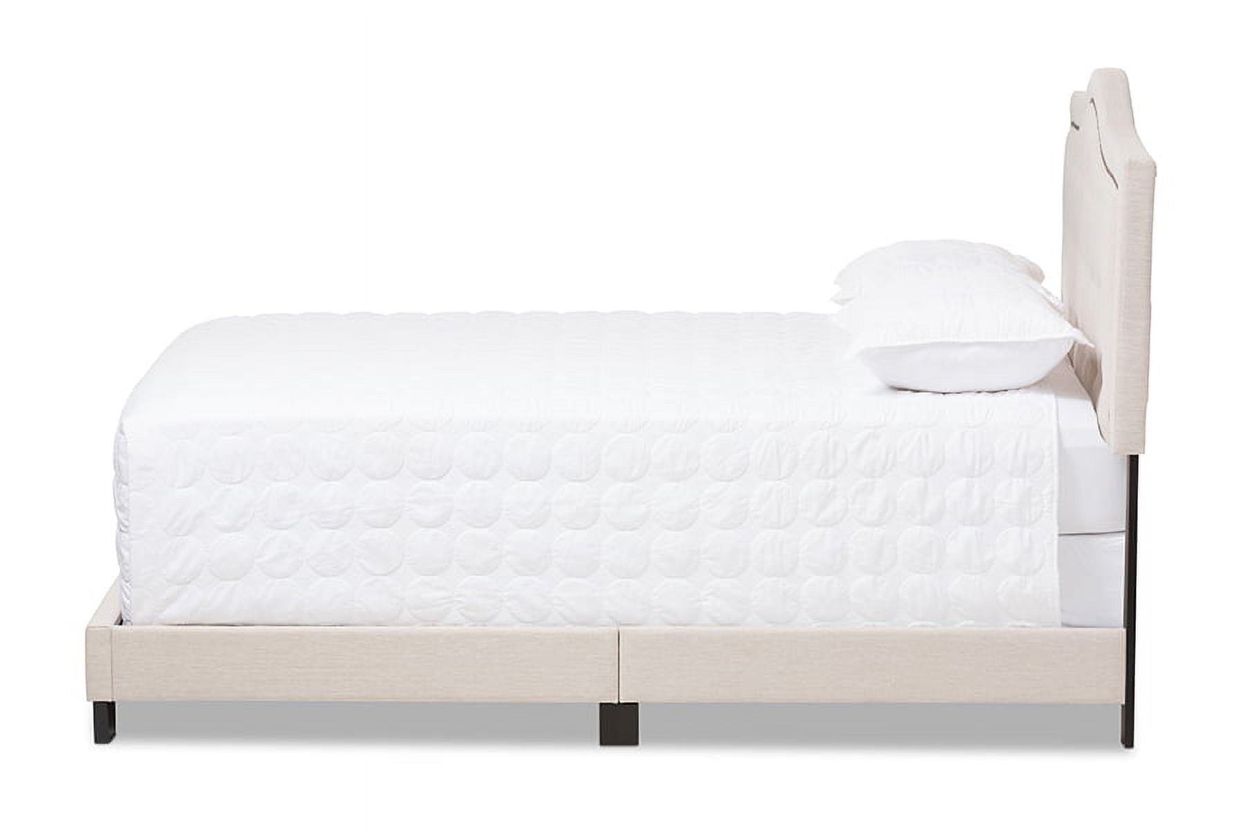 The Emerson fabric upholstered bed is relaxed and quietly elegant. Soft beige polyester fabric upholstery is complemented by black painted wood legs for a graceful piece of bedroom furniture. Featuring curvaceous headboard, the bed is button-tufted for a classic look while silver nail heads trimming reflects its glamour. Matching with a low footboard, the Emerson will create an airy feel in a small room setting. For you to lean back comfortably, the bed frame is padded throughout with foam over its solid rubber wood frame. Standard US box spring and mattress will complement this queen-sized Emerson bed for an elevated bed height. Made in Malaysia, the Emerson requires assembly.