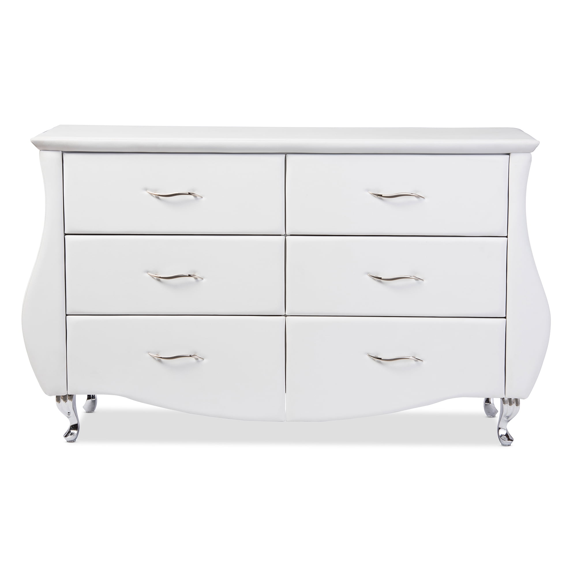 Baxton Studio Enzo Modern and Contemporary White Faux Leather 6-Drawer Dresser The modern design of the Enzo Modern and Contemporary White Faux Leather 6-Drawer Dresser is perfectly designed to add luxury and grace to your bedroom setting. This bedroom dresser offers timeless elegance with immense visual appeal. Curved lines on two sides and at the bottom beautifully paired with a matt white finish, the dresser is unique and will surely impress. The stainless steel drawer pulls and legs complete the modern look of the cabinet. To smooth the every day use, the drawers are equipped with metal gliders for easy pull in and out. Specifications: Modern and contemporary 6-drawer dresser Materials: Faux Leather Color: White Drawers on extension metal runners Drawers have metal handles Legs are in stainless steel