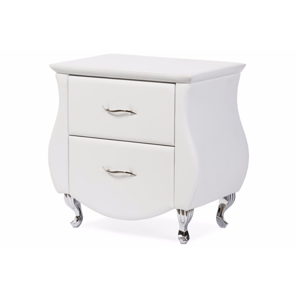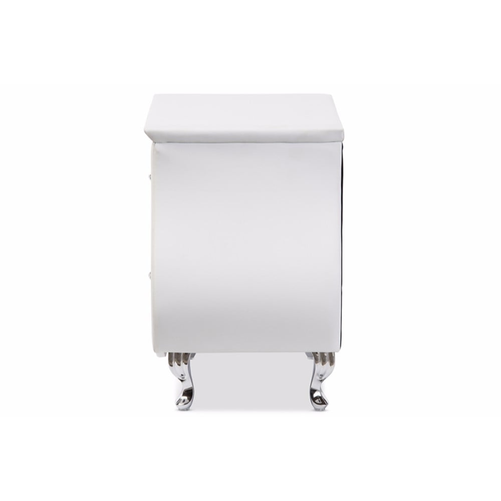 Baxton Studio Erin Modern and Contemporary White Faux Leather Upholstered Nightstand With two storage drawers Erin Modern and Contemporary Faux Leather Upholstered Nightstand is perfect for keeping those everyday small items. Compact enough for sitting next to your bed or around the home for quick easy access. Meticulously crafted, the Erin is constructed of solid hardwood and plywood frame and upholstered in faux leather. The stainless steel drawers pulls and chromed steel legs instantly update the modern look of the Erin bed side table. Beautifully shaped, the Erin is a standout piece for any home looking to add a touch of refined style. Made in Malaysia, the Erin will require light assembly for the legs. Specifications: Modern and contemporary style nightstand Materials: Hardwood, plywood, chromed steel legs Faux leather upholstery