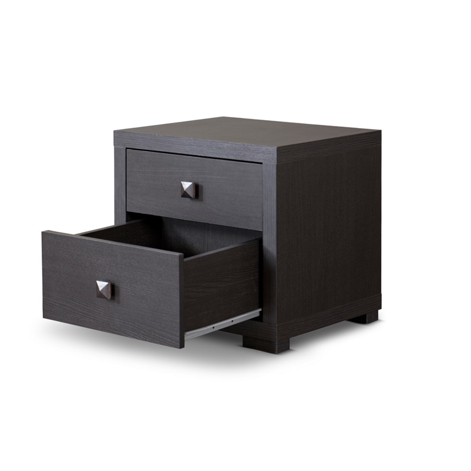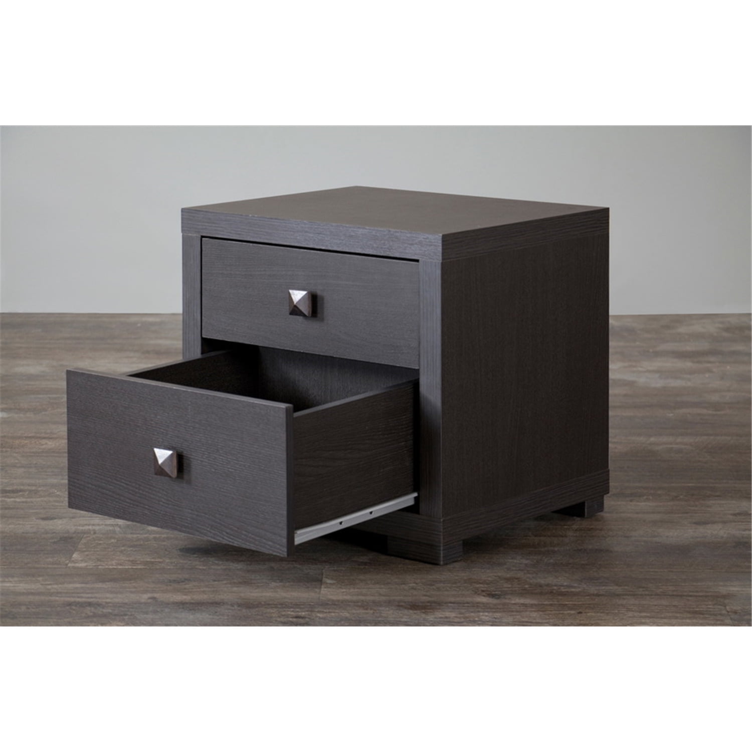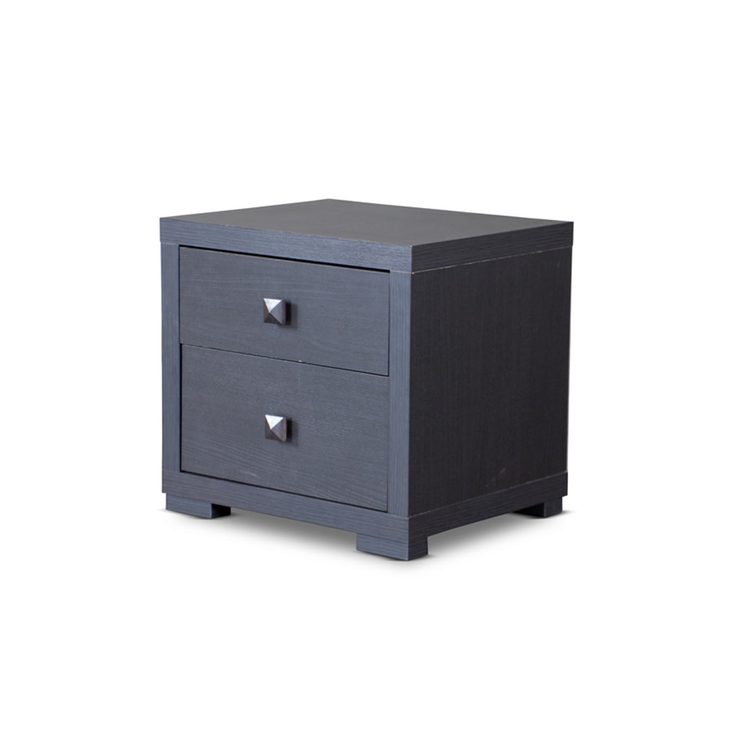 Baxton Studio Espresso Silverstone Modern Nightstand ?Perk up? your bedroom set with our contemporary Espresso Nightstand?Silvertone. Featuring eye-grabbing silvertone drawer pulls, its dual drawers provide plenty of room for all those little items. An espresso-toned faux wood-grain paper veneer and non-marking feet distinguish it from other discount bedroom-furniture items. Specifications: Contemporary nightstand Engineered wood Dark brown (espresso) faux wood grain paper veneer