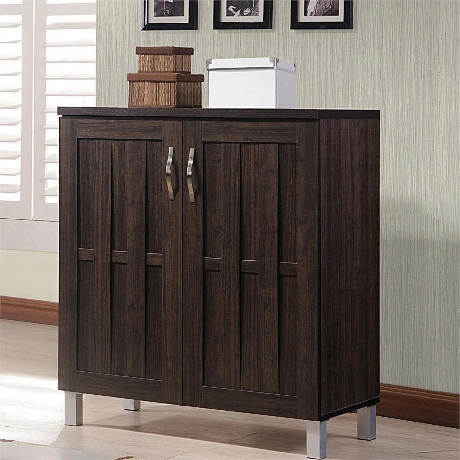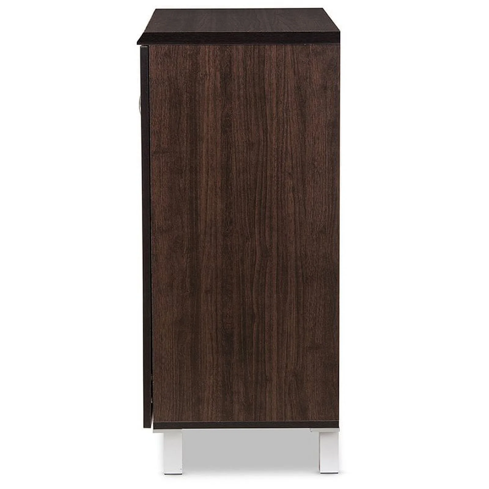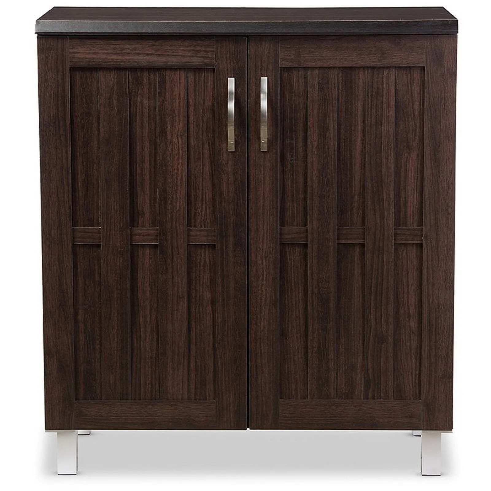 Sturdy engineered wood construction Dark brown wood grain finishing 2 doors and 1 shelf Silver handles Silver powder-coated legs