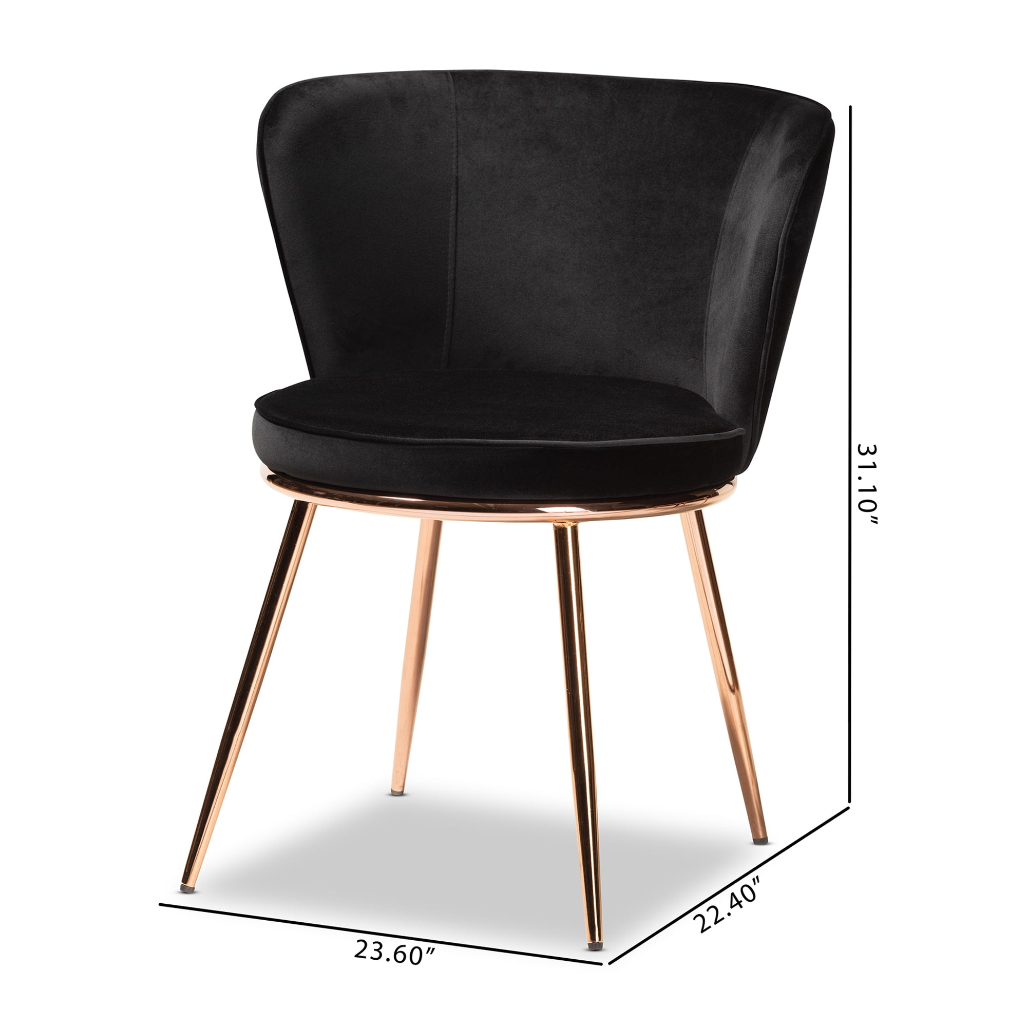 Modern luxe and glam set includes two (2) dining chairs Constructed from metal and engineered wood Upholstered in velvet polyester fabric and padded with foam Angled legs Product Weight: 14.6 Pound Package Weight: 33.5 Pound Dimensions: 31.10″ High x 23.60″ Wide x 22.40″ Deep Seat Dimensions: 17.90″ High (From Floor) x 18.30″ Wide x 18.30″ Deep Legs: 17.90″ High Back: 13.20″ High Product Color: Black/Rose Gold Product Composition: Fabric Polyester and Cotton/Plywood/Metal/Foam