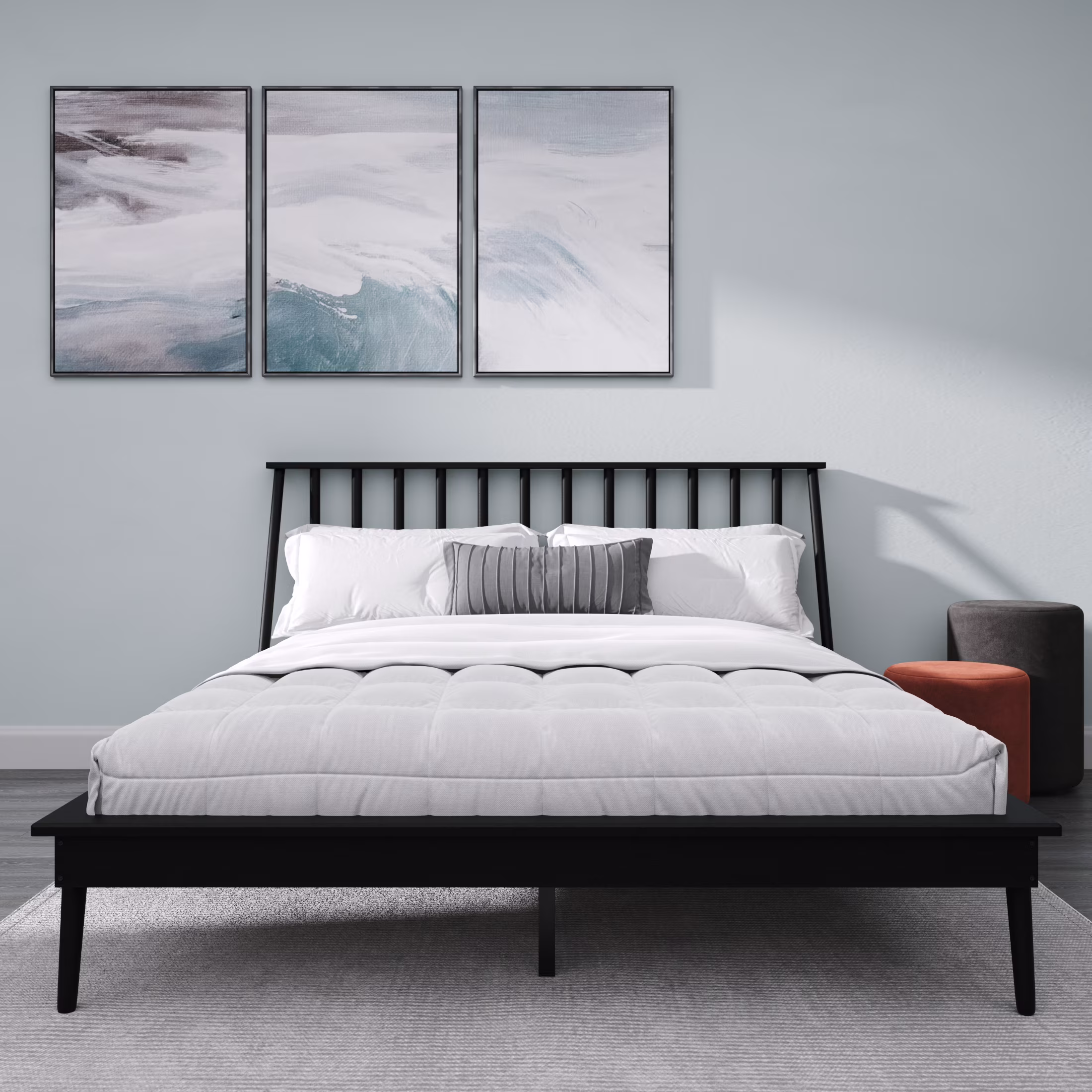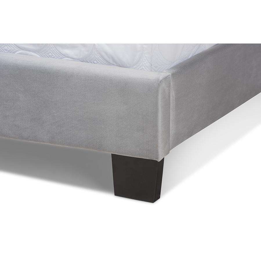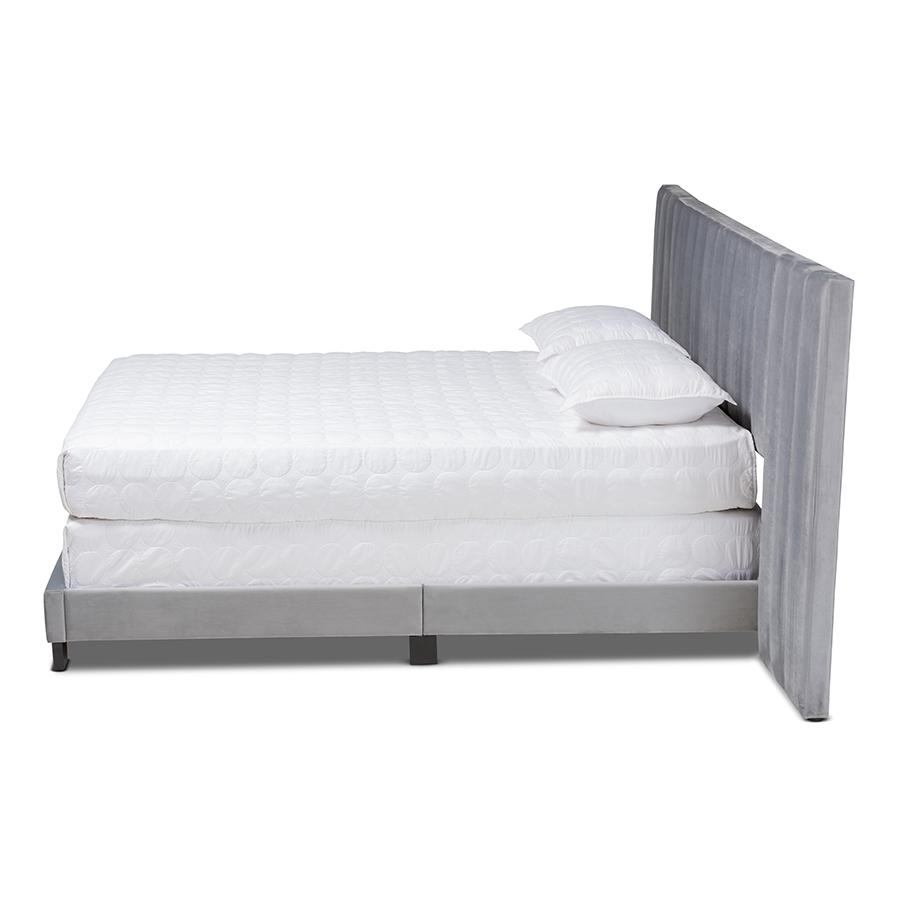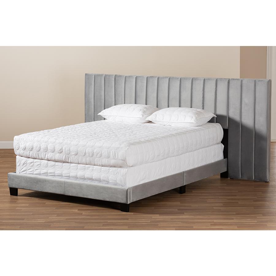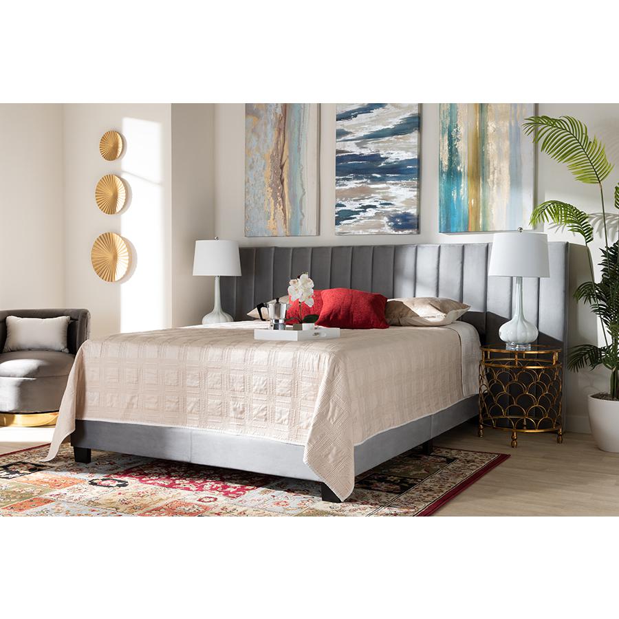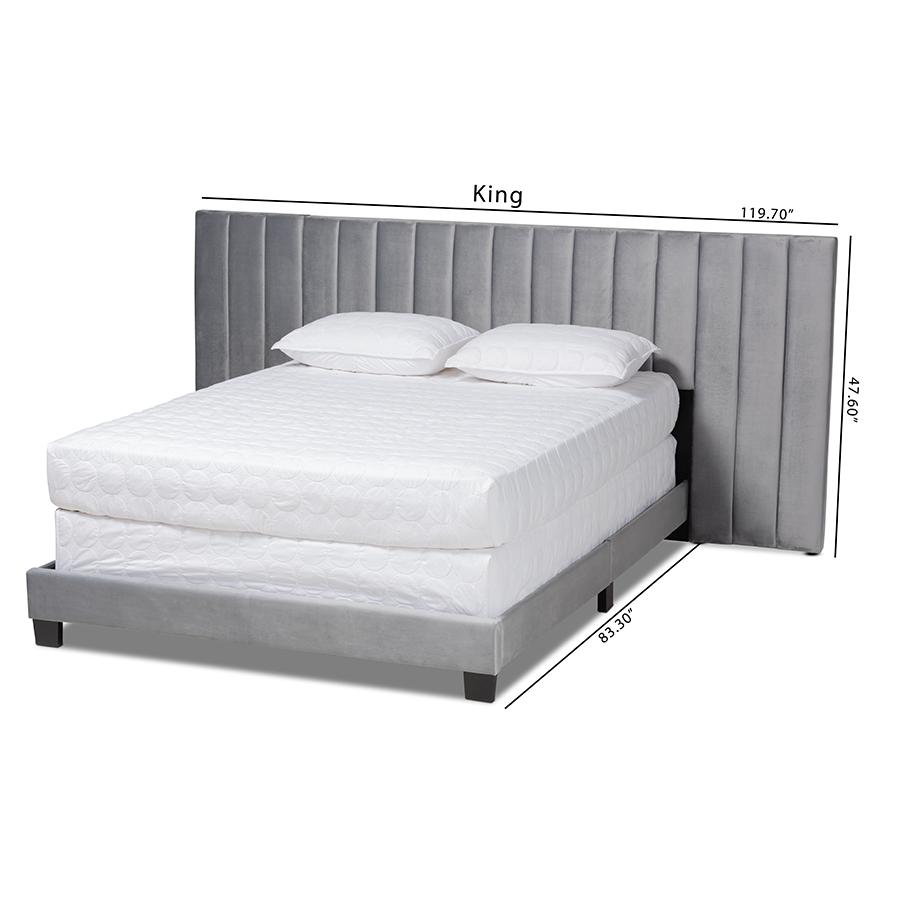 Constructed from rubberwood, MDF wood, and engineered wood Upholstered in velvet polyester fabric and padded with foam Extra wide channel tufted headboard Black legs Box spring required Assembly required Made in Malaysia Product Weight: 85.98 Pound Package Weight: 94.8 Pound Dimensions: 47.64″ high x 119.69″ wide x 83.27″ deep; Headboard: 119.69″ wide x 24.02″ long x 3.54″ thick; Distance between slats: 27.95″; Height from floor to top of slat: 7.4″ high; Legs: 3.54″ high; Inside dimensions (mattress size): 76″ wide x 80″ deep Product Color: Grey/Black Product Composition: Fabric 100% Polyester/MDF, Particle Board/Polyurethane Foam Pad 100%/Rubberwood