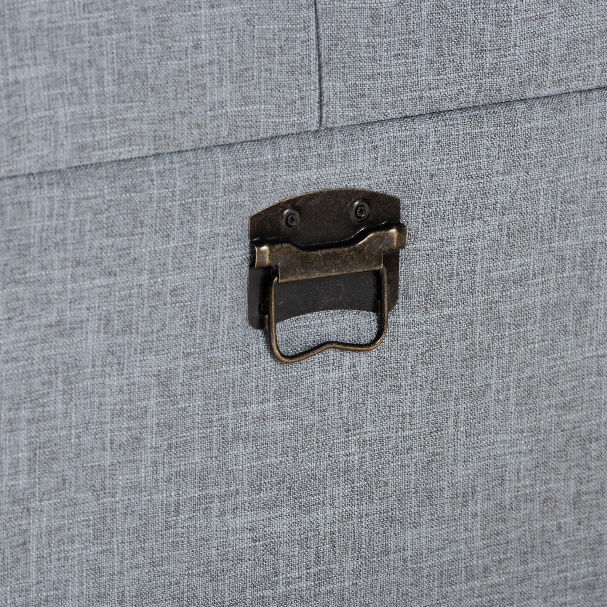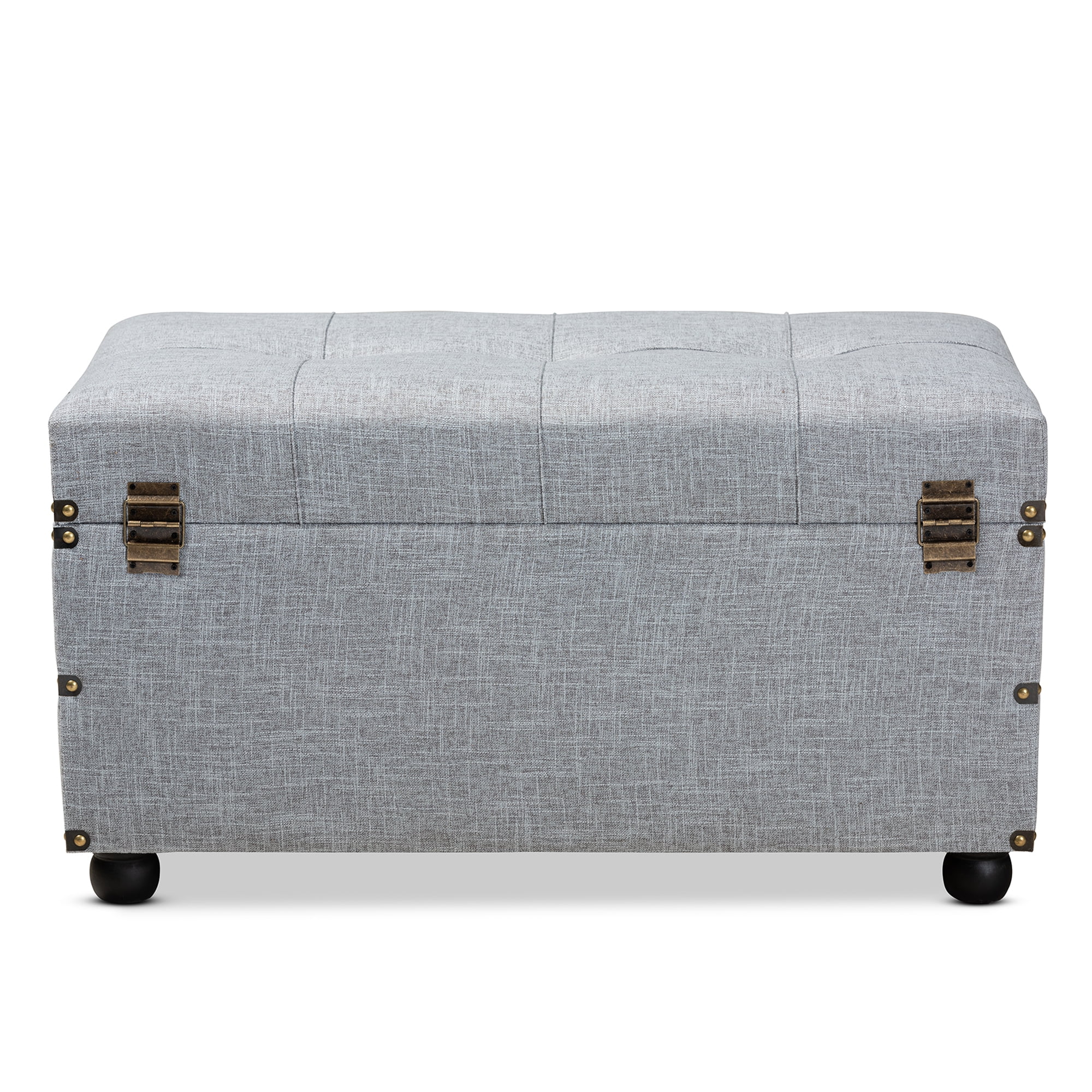 Stylish and versatile, the Flynn ottoman is an easy addition to any space. Set on top of black bun feet, the Flynn is upholstered in a chic grey linen-like fabric and features a cushioned lift-up lid that reveals extensive storage space. Two drawers located at the bottom provide additional storage space. Inspired by vintage steamer trunks, the Flynn is accented with antique brass latches and handles. Brass nailheads and button tufting add an extra dose of style. This versatile piece can be used as an ottoman, coffee table, or storage trunk. The Flynn ottoman is made in China and will arrive fully assembled. Dimensions: 17.24″ high x 31.5″ wide x 15.75″ deep; Inner storage dimensions: 30.51″ wide x 14.76″ deep x 6.1″ high; Drawer dimensions: 13.39″ wide x 12.6″ deep x 3.94″ high;