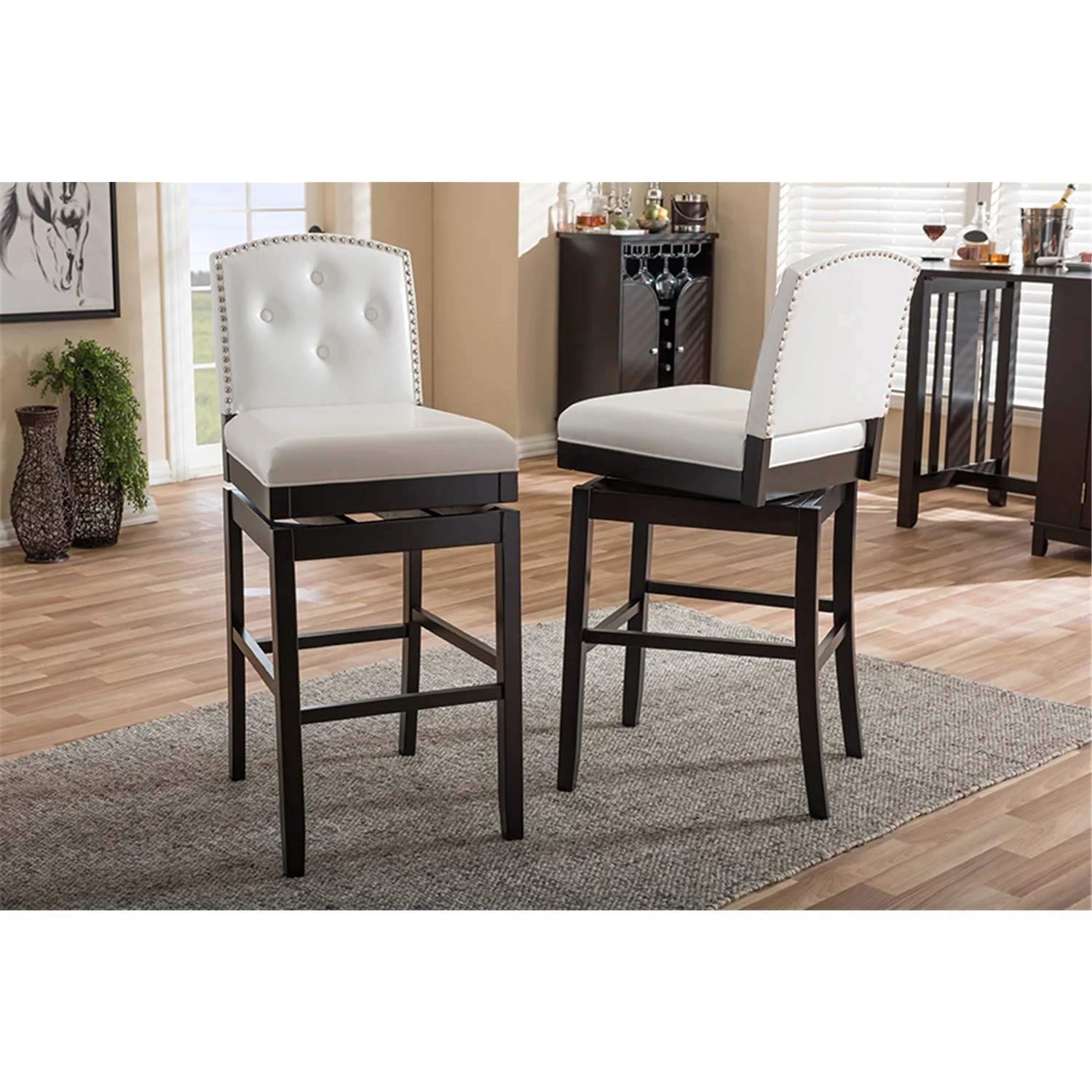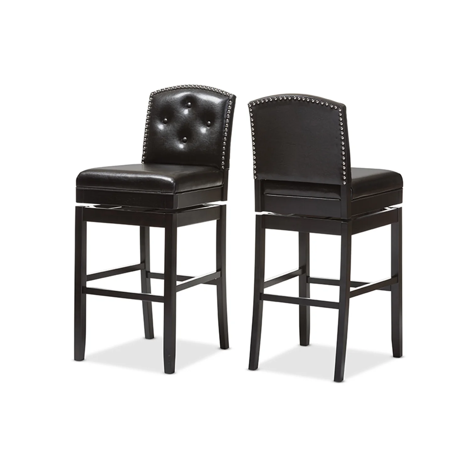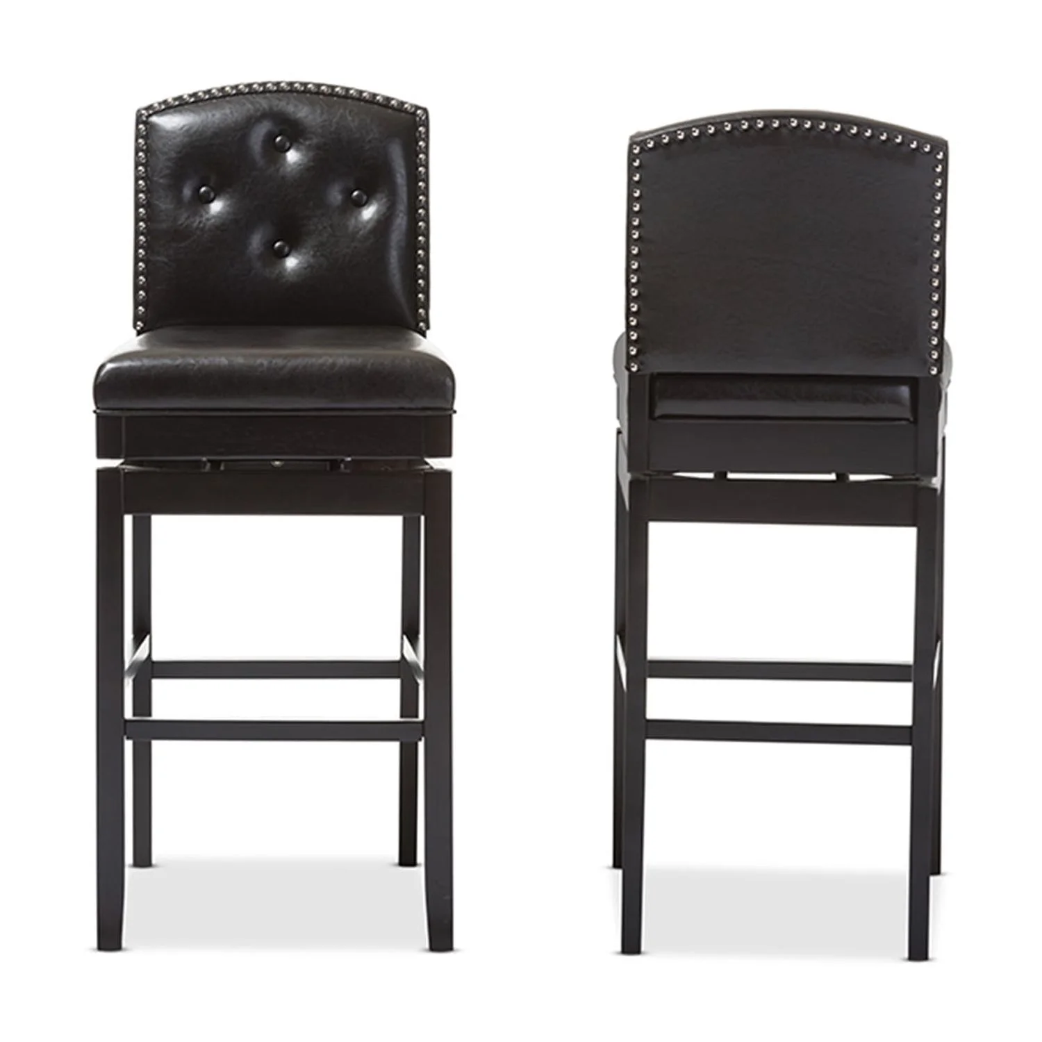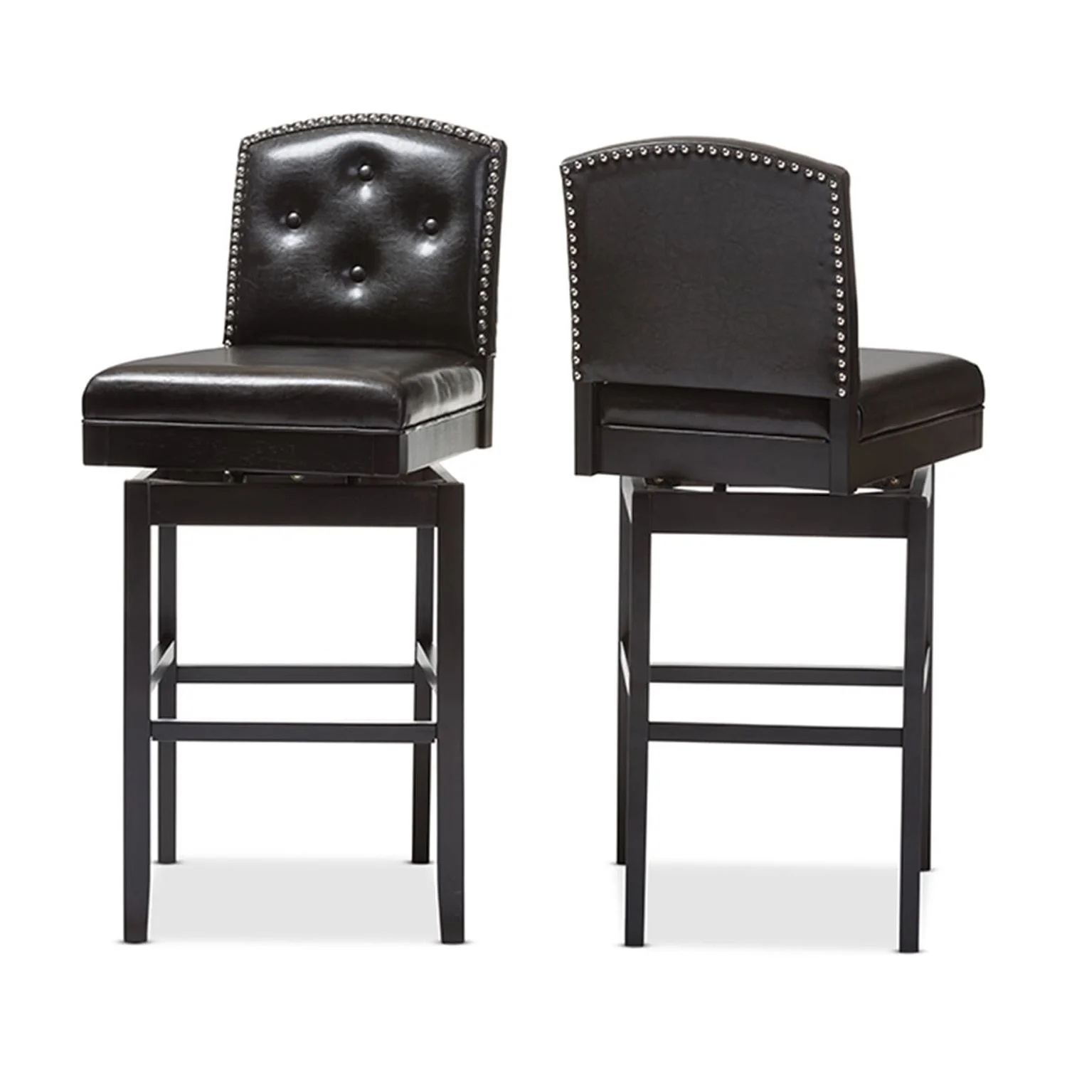 Baxton Studio Ginaro Modern and Contemporary Dark Brown Faux Leather Button-tufted Upholstered Swivel Bar Stool (Set of The Ginaro Bar Stool is an ideal choice for any modern bar or pub – providing a comfortable seat at a height! An elegant and sophisticated bar stool with button-tufting design, the Ginaro features curved back with silver nail heads trim on the seat back for a contemporary look. The detailed piping around the seat cushion showcases the clean lines while the tapered legs enhanced with wooden stretchers for durability. Fully upholstered in faux leather with comfortable foam padding, the Ginaro would fit extremely well in a home bar or restaurant bar environment. A swivel plate connects the base and the seat for easy maneuverability. Made in Malaysia, the bar stool requires assembly. Specifications: Modern and contemporary bar stool Fully upholstered back and seat Tapered legs with stretcher support Nail heads trim on the front and back of the seat back Metal swivel plate for easy maneuverability Upholstered in dark brown faux leather and padded with foam